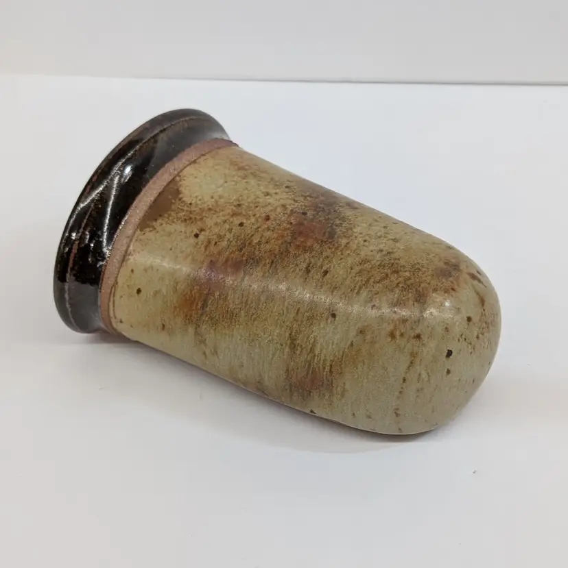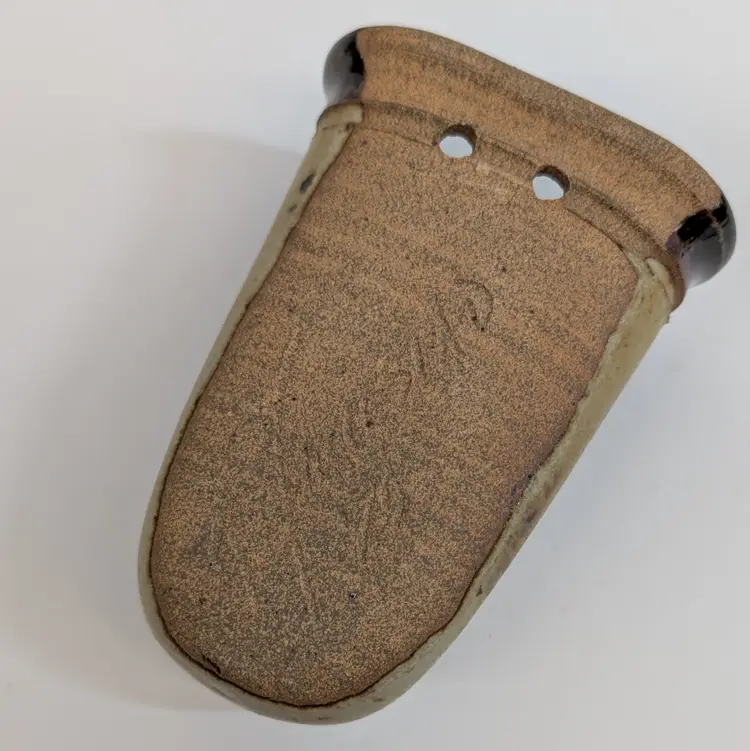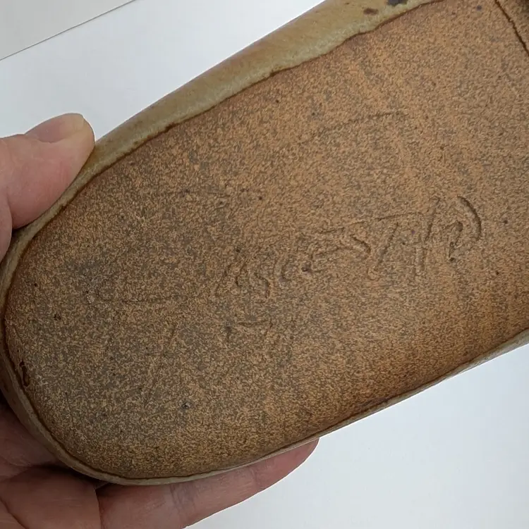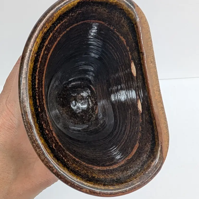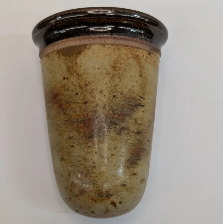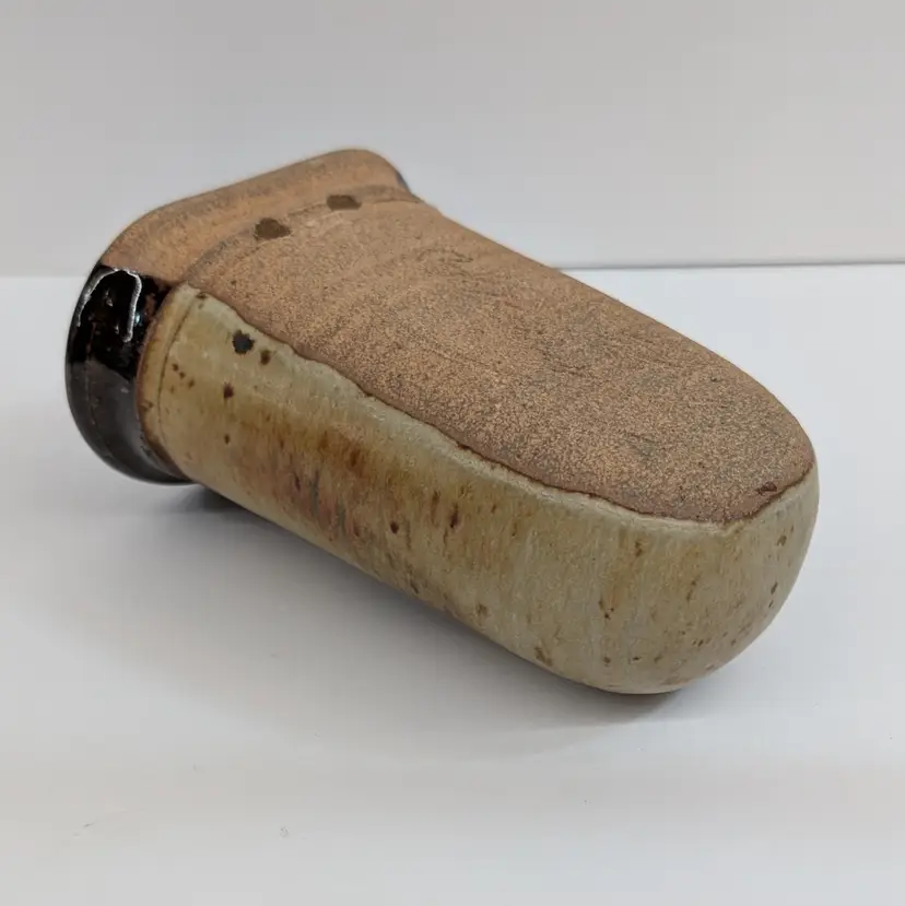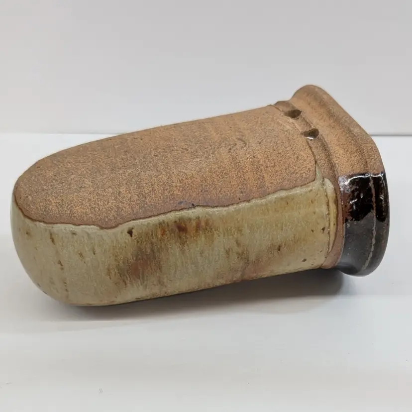 The glaze on this wall pocket is so natural looking. It was made by Ren Fuglestad in 1979. It is glazed on the inside and would be very usable as a wall vase and has two hole for attaching a hanger. In nice, used condition. Measurements ~ 4.25 x 6 x 2.75"
