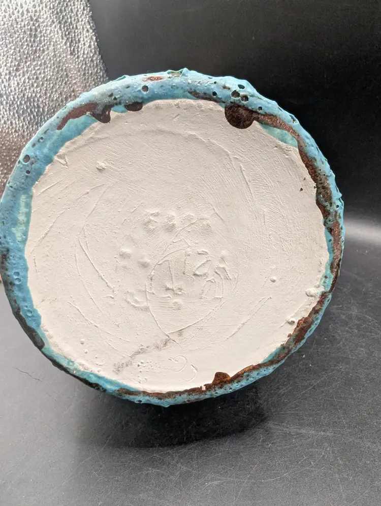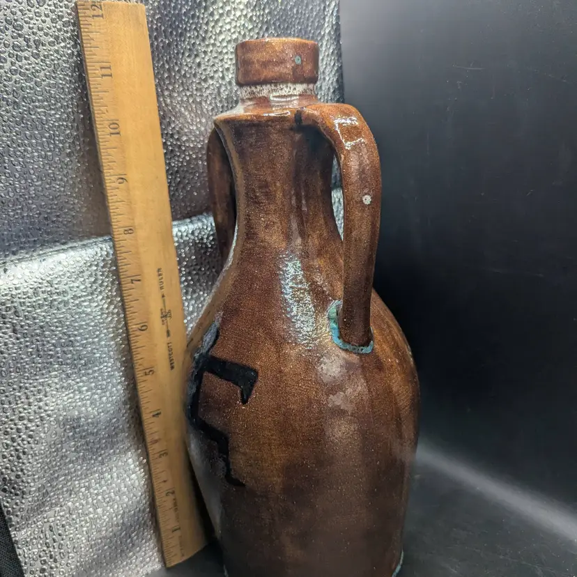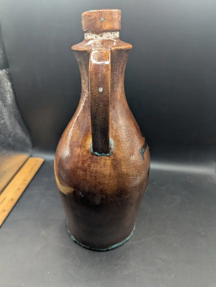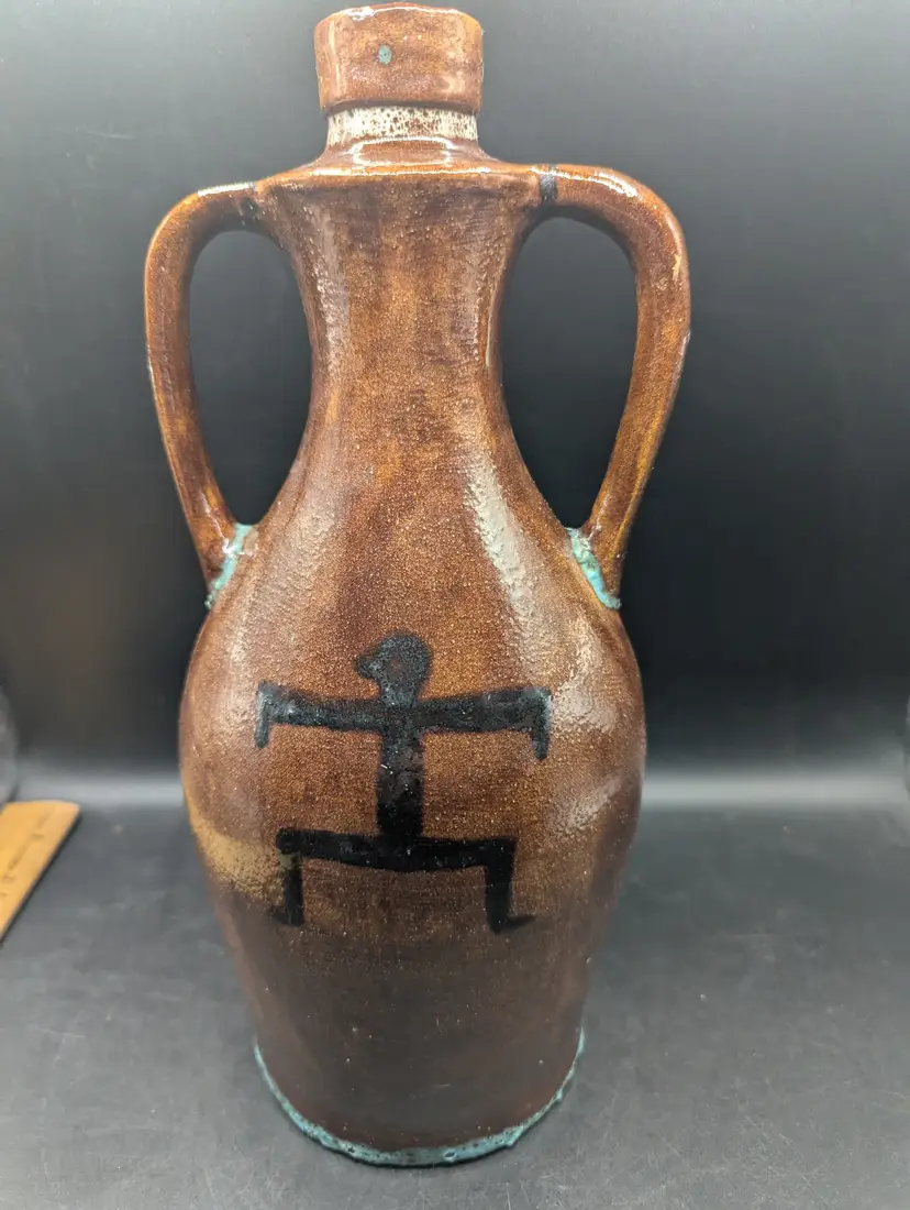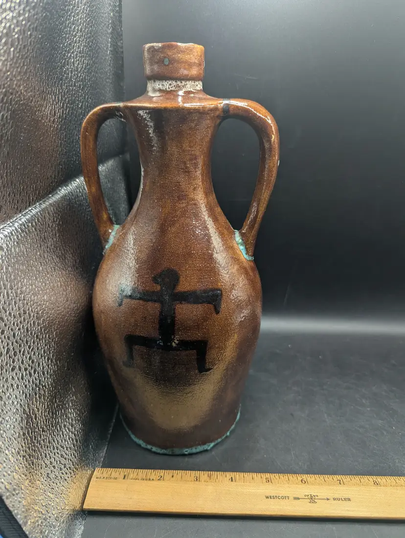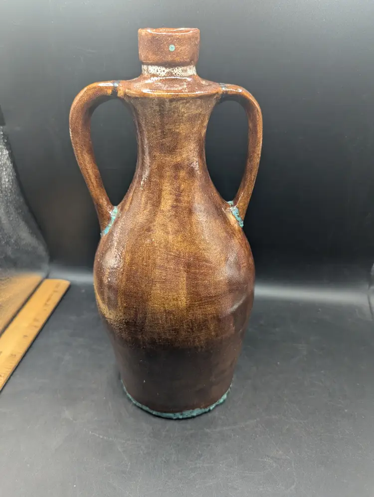 This is a lovely Vintage Studio Art Pottery Southwestern Design Jug With Double Handles 11.25". It has a brown glaze with turquoise touches at the base of handles and the jug. It is marked but unable to identify. No chips or cracks. Please see all pictures for condition and measurements.