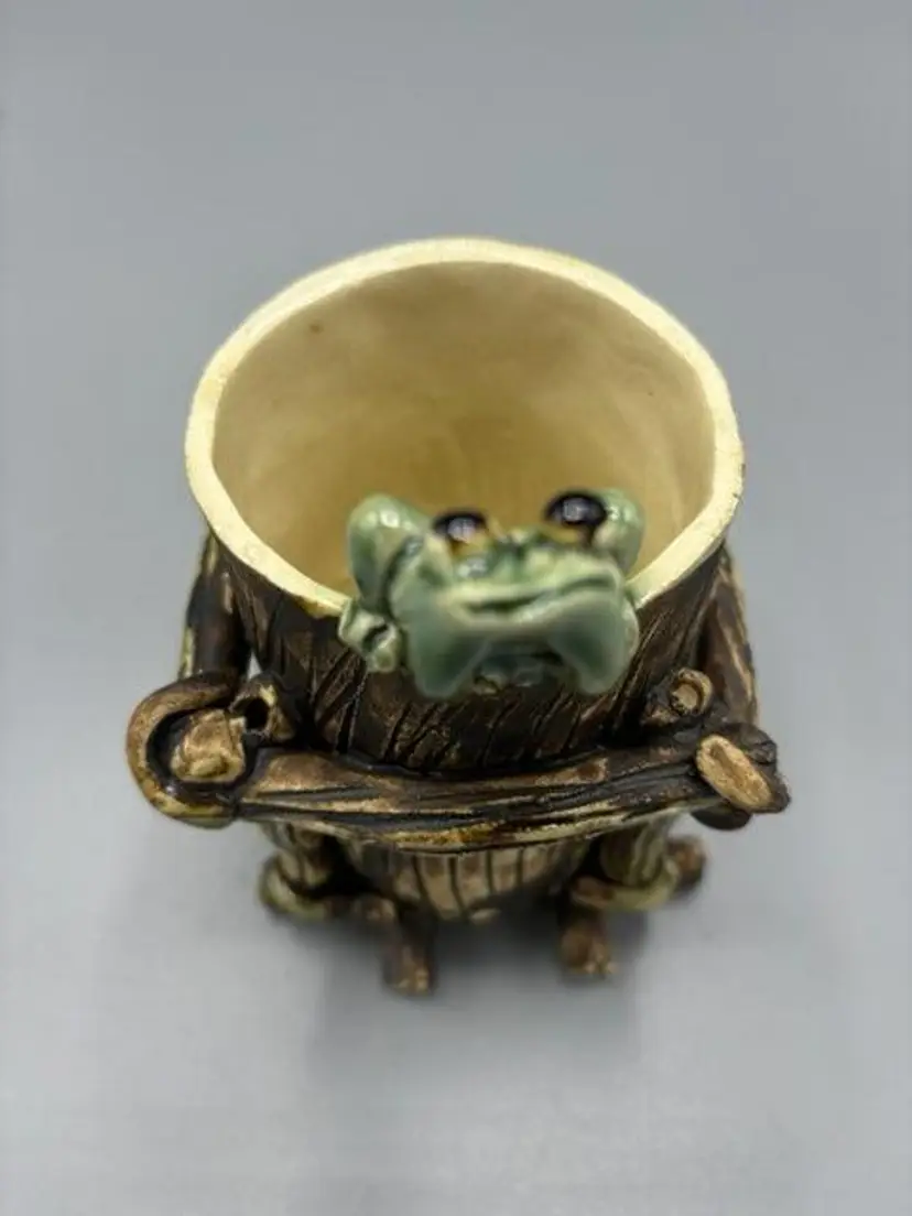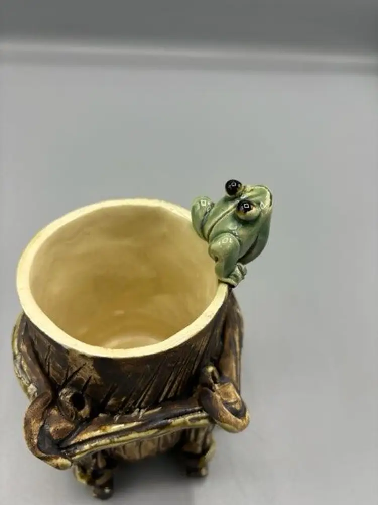 Vintage studio art pottery vase or cup with small frog that is darling to add to any collection. This has a flea bite otherwise in great condition.