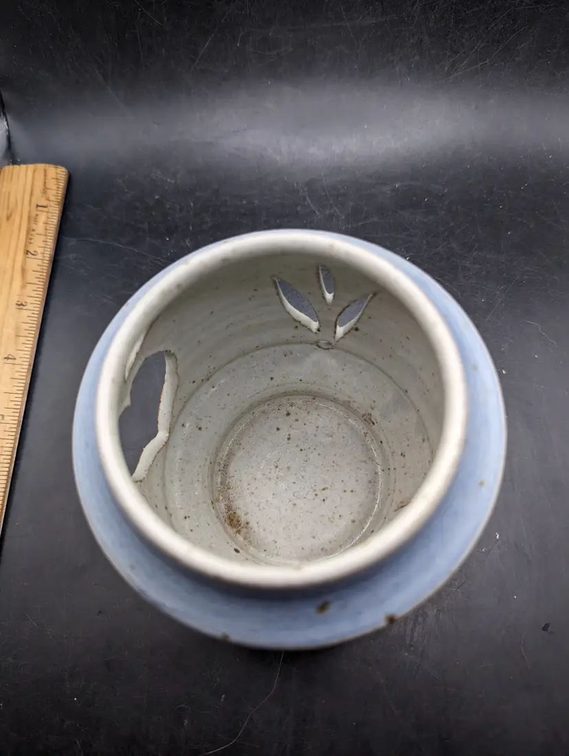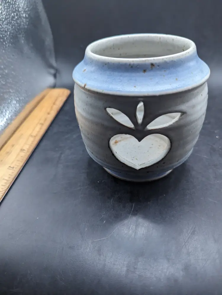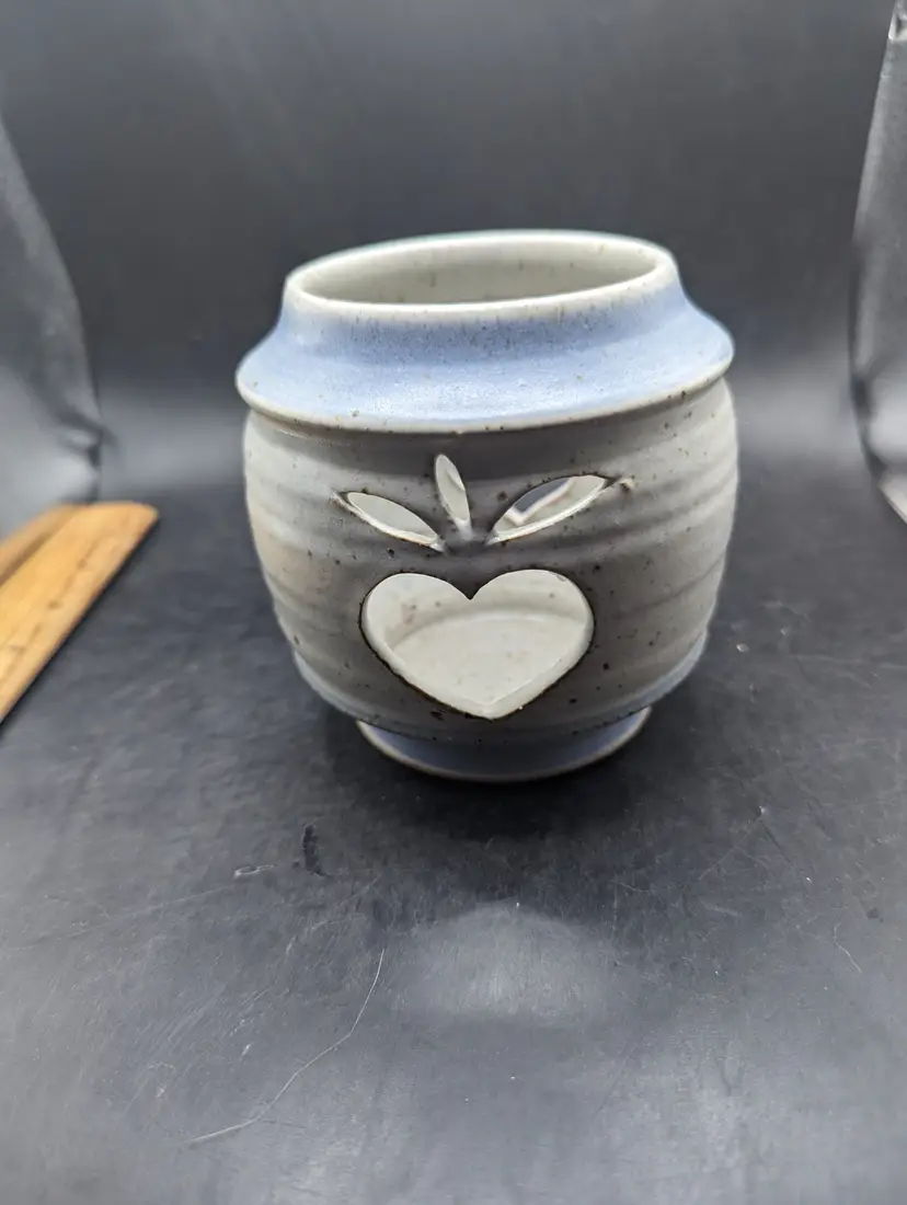 This is a lovely Vintage Studio Art Pottery Votive Candle Holder Signed. It has a heart floral cutout. Please see all pictures for condition and measurements.