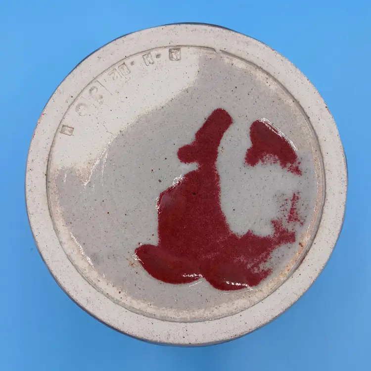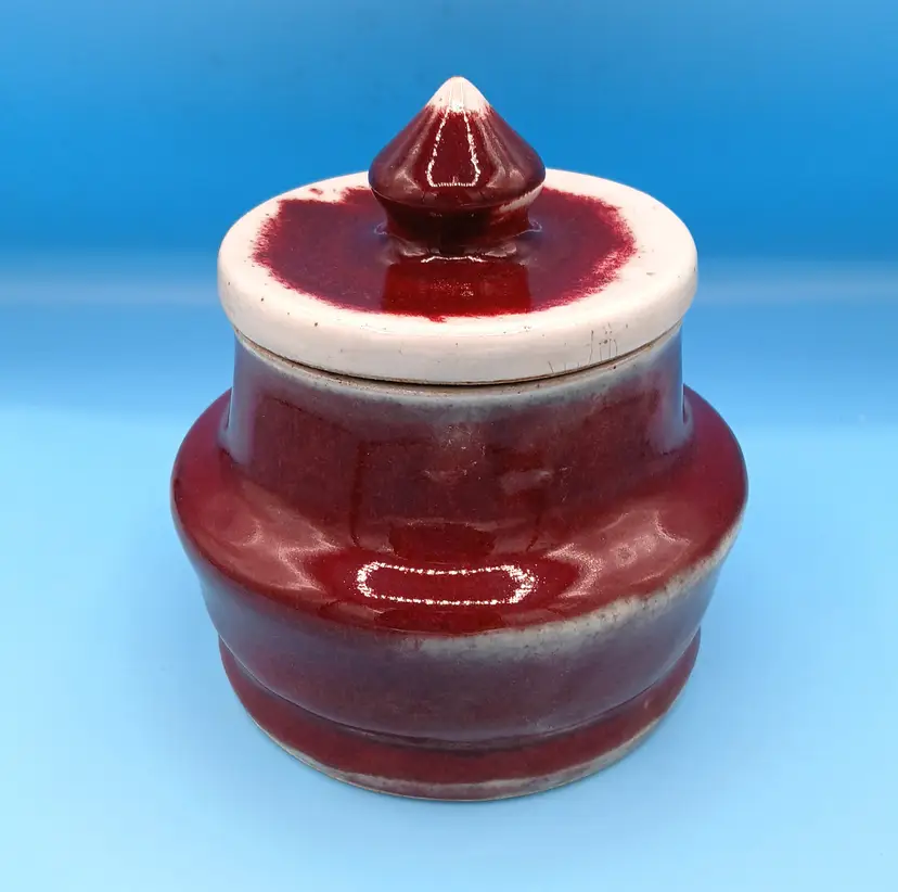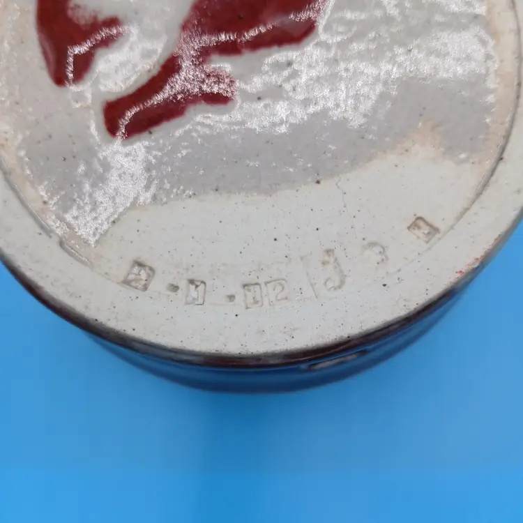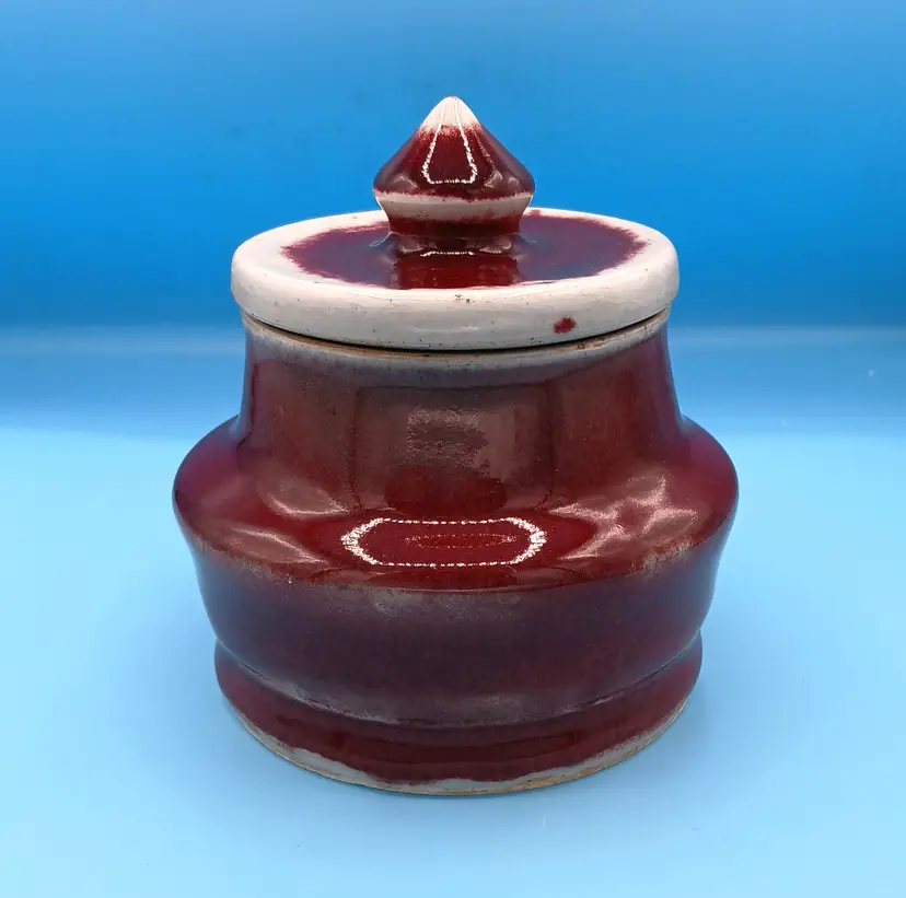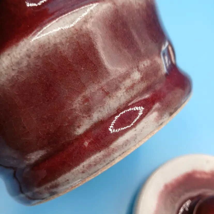This canister is quite heavy for its size. It's stamped with a signature that I believe reads "2-1-12- Jen" but that could be wrong. There is also a stamp impressed in the side of the jar. There is subtle crazing throughout and NO gasket on the lid. A crack is on the inside of the base that does NOT run through, just the way it was made. It stands about 6" high to the top of the finial and 5" across the base. Thanks for looking!