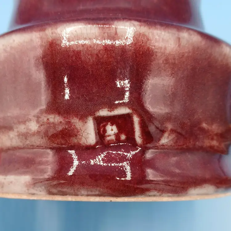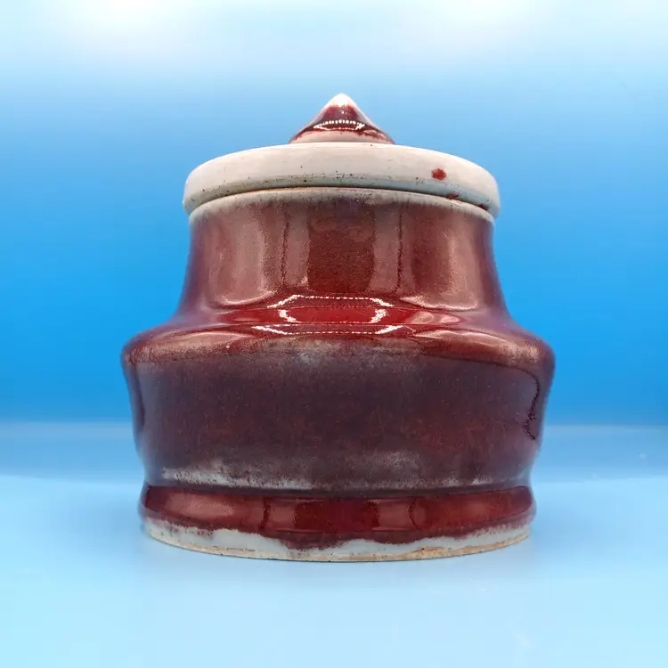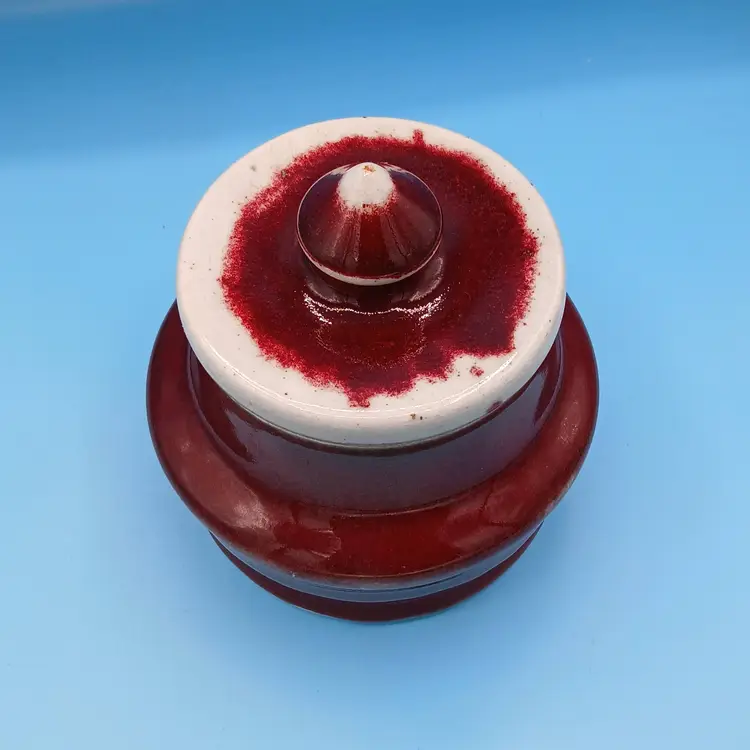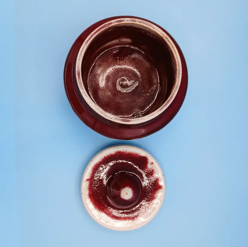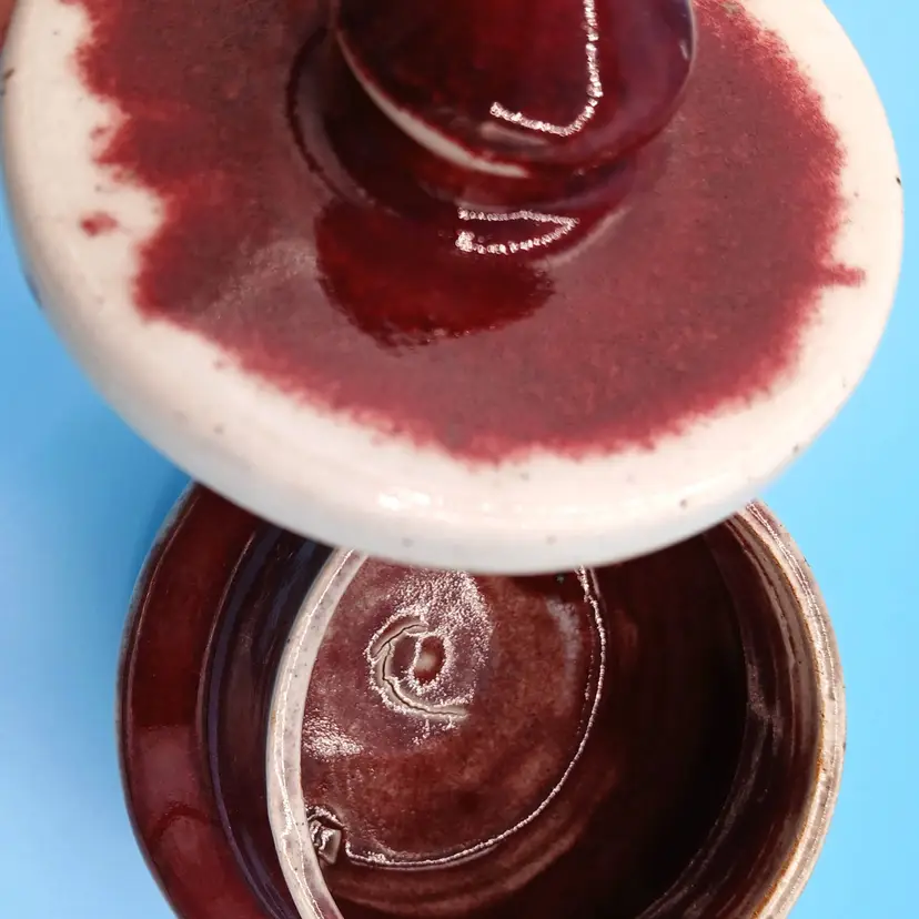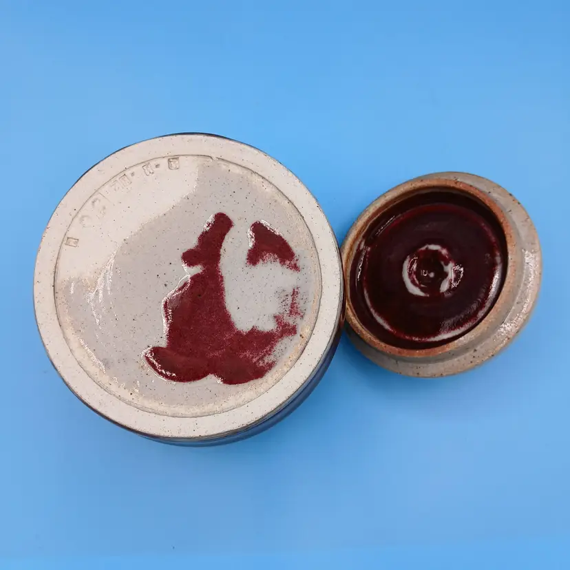 This canister is quite heavy for its size. It's stamped with a signature that I believe reads "2-1-12- Jen" but that could be wrong. There is also a stamp impressed in the side of the jar. There is subtle crazing throughout and NO gasket on the lid. A crack is on the inside of the base that does NOT run through, just the way it was made. It stands about 6" high to the top of the finial and 5" across the base. Thanks for looking!