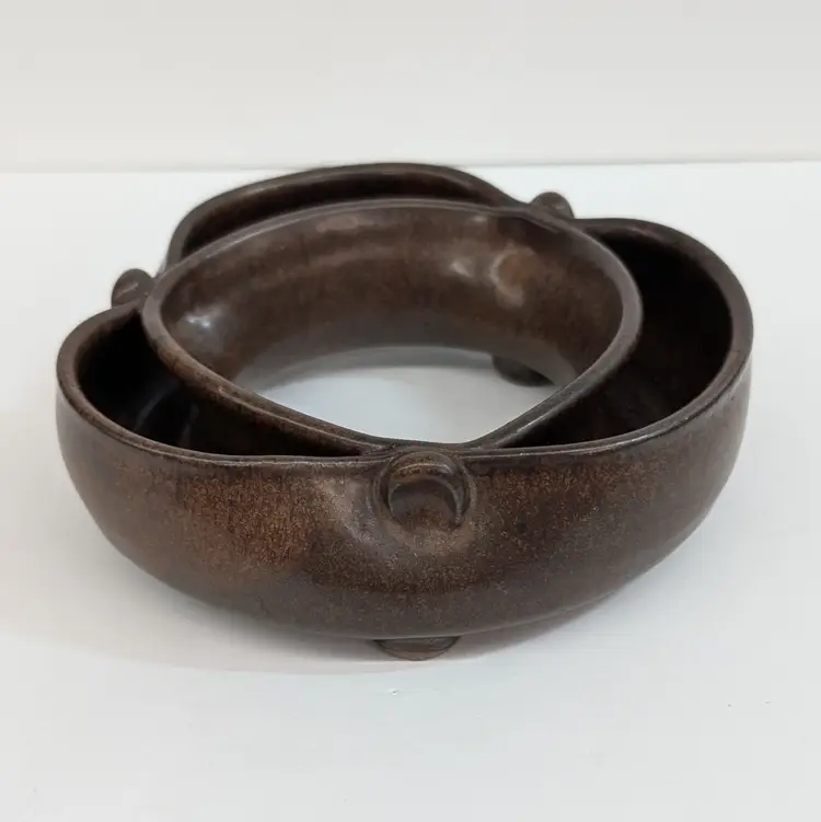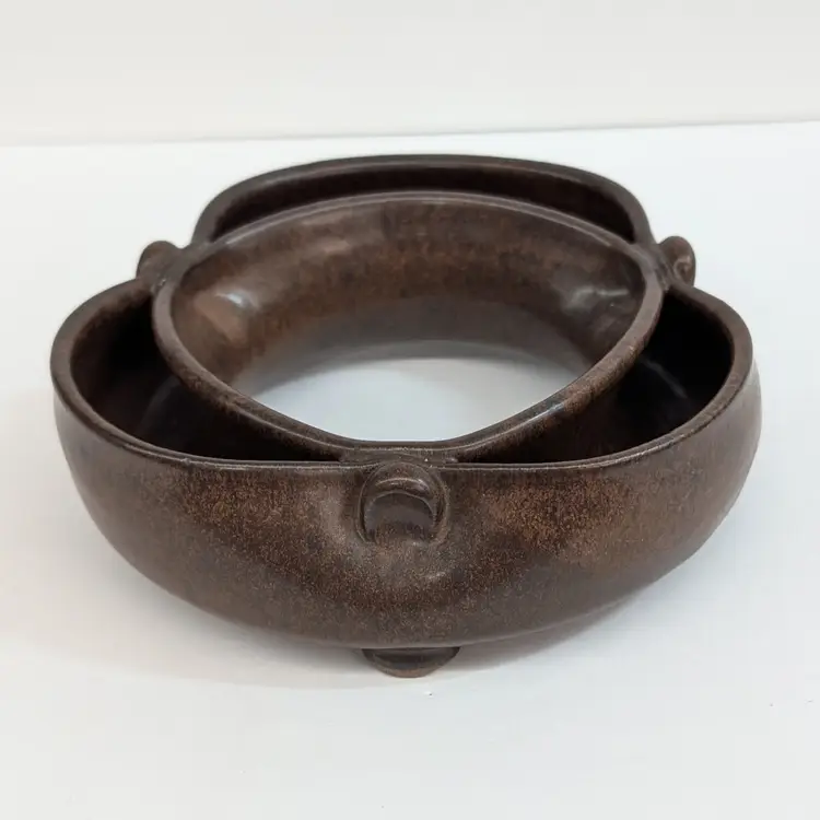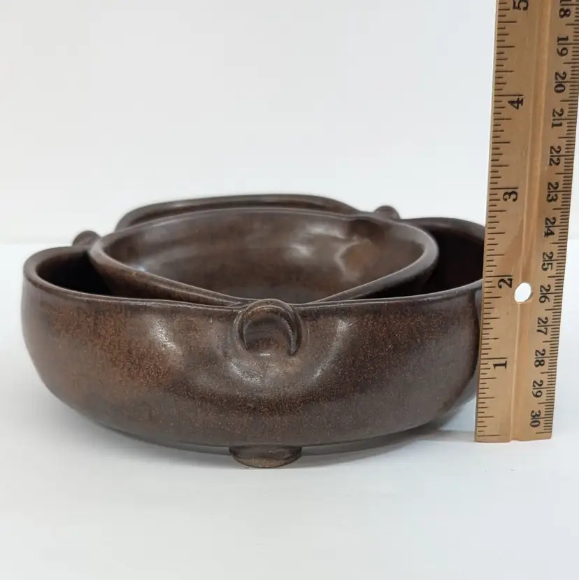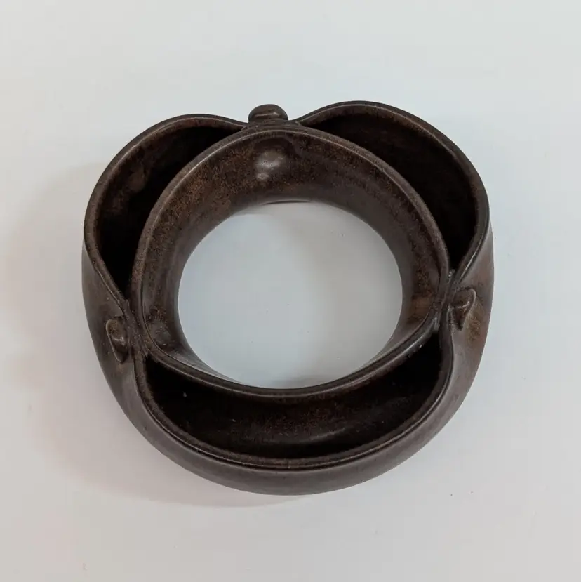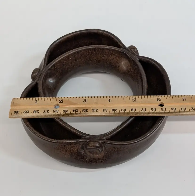 Such a great shape to make a short floral arrangement. The center is open so you can put a candle in the middle if desired. A lovely, dark brown glaze with three small feet. In nice, used condition with no chips or cracks. Measurements ~ 6.5 x 2"