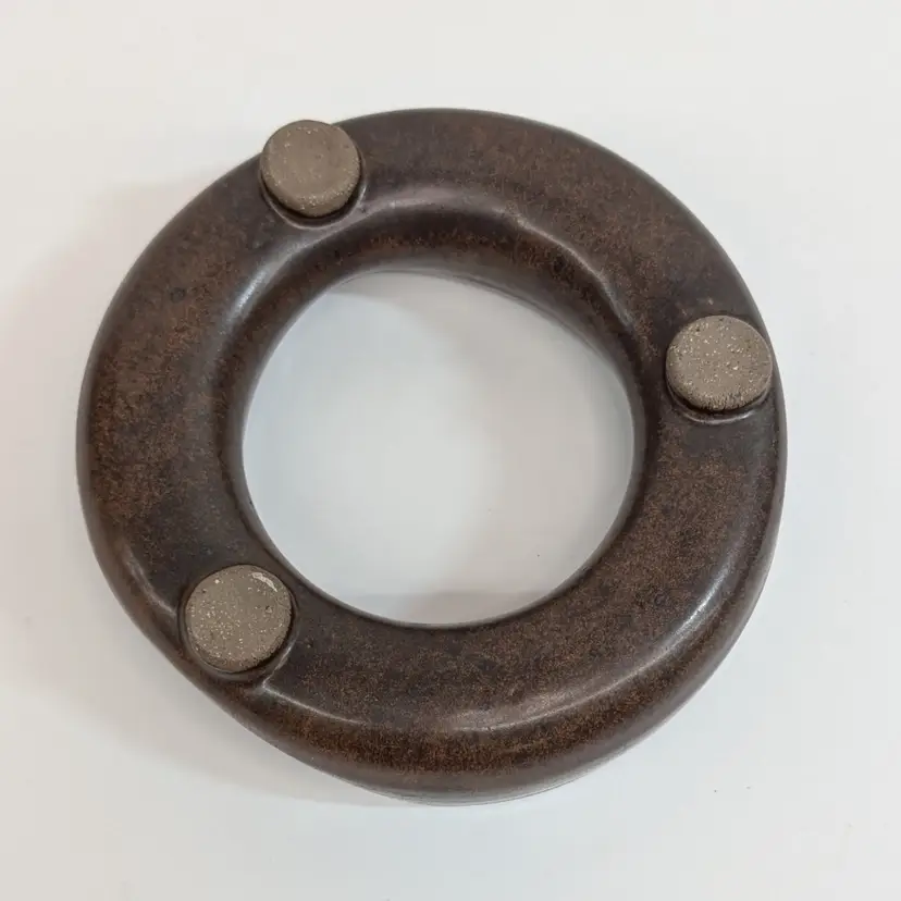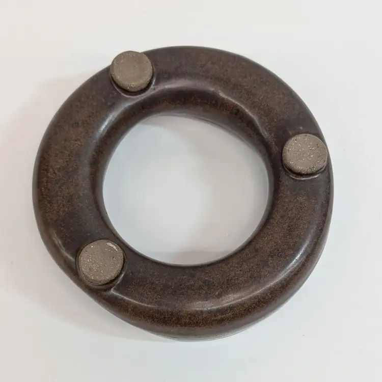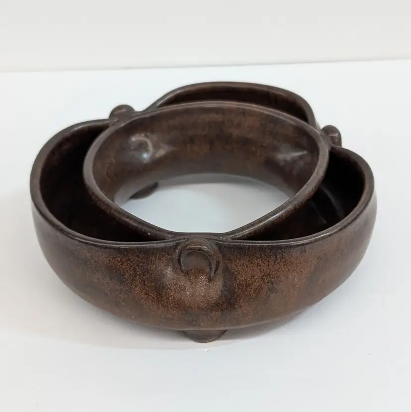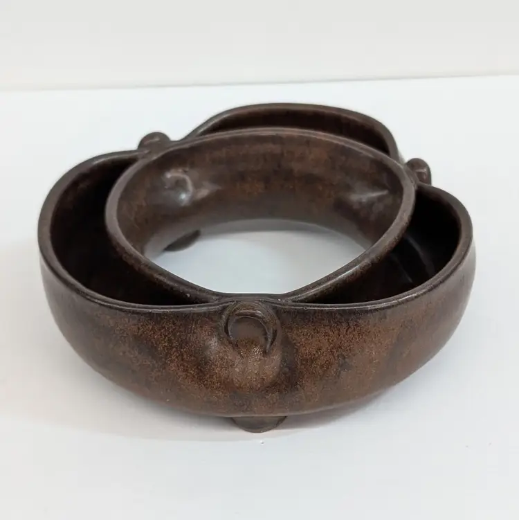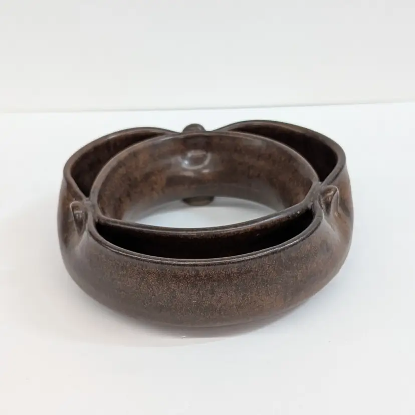 Such a great shape to make a short floral arrangement. The center is open so you can put a candle in the middle if desired. A lovely, dark brown glaze with three small feet. In nice, used condition with no chips or cracks. Measurements ~ 6.5 x 2"