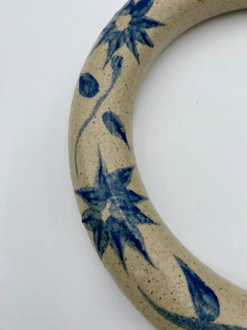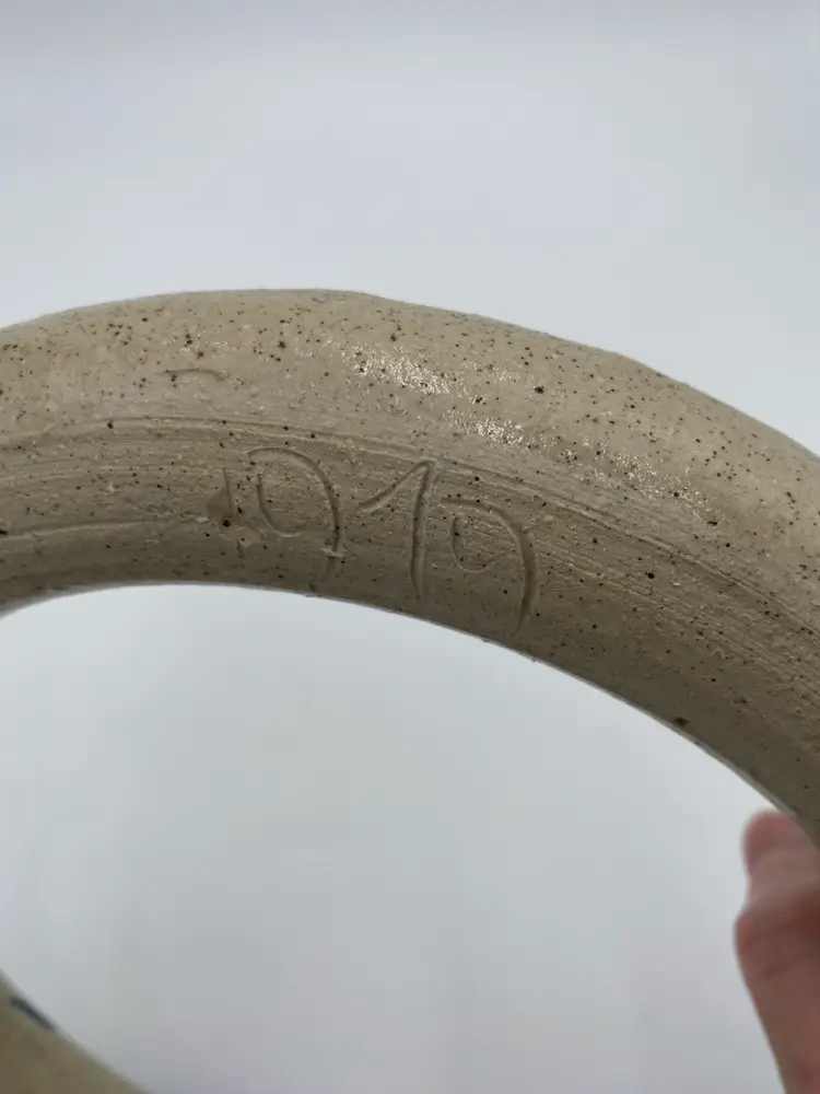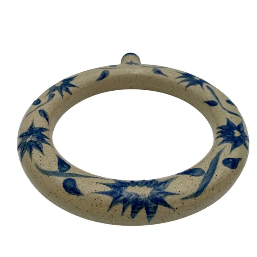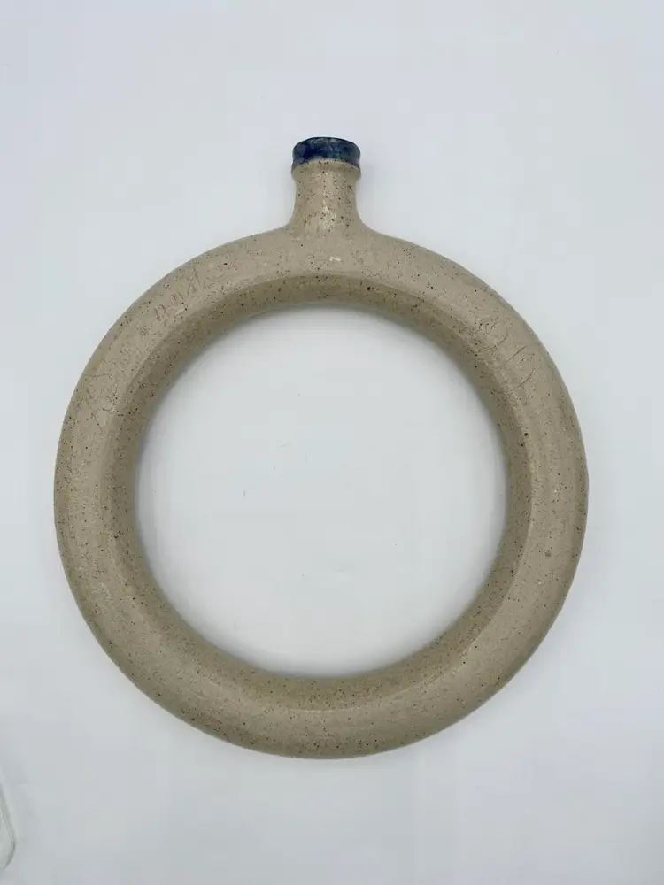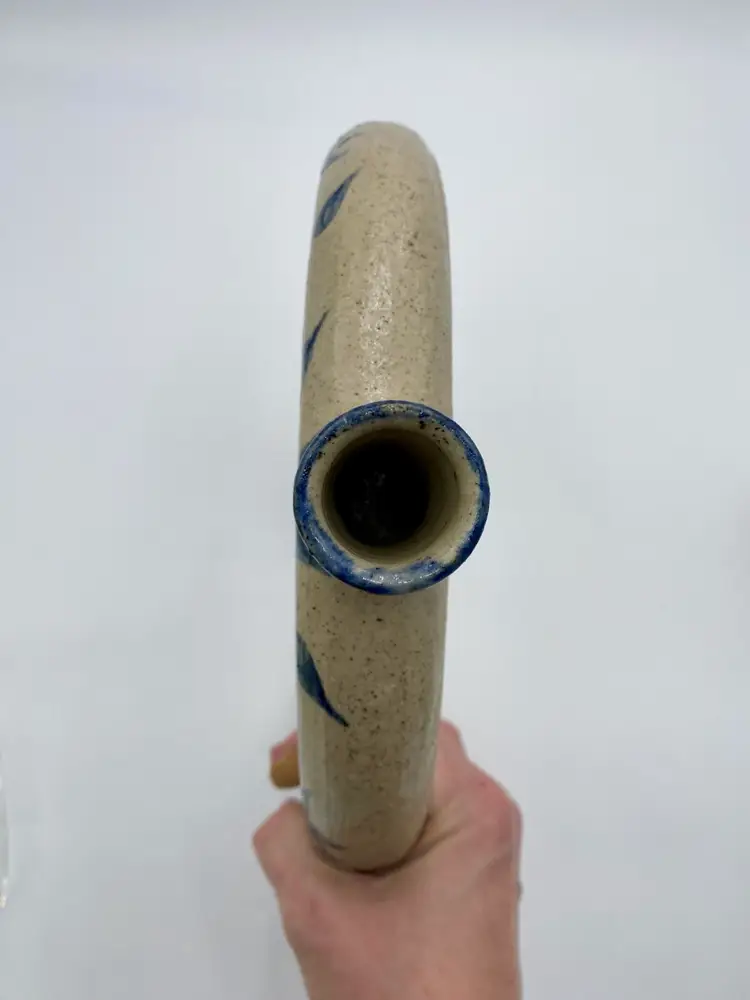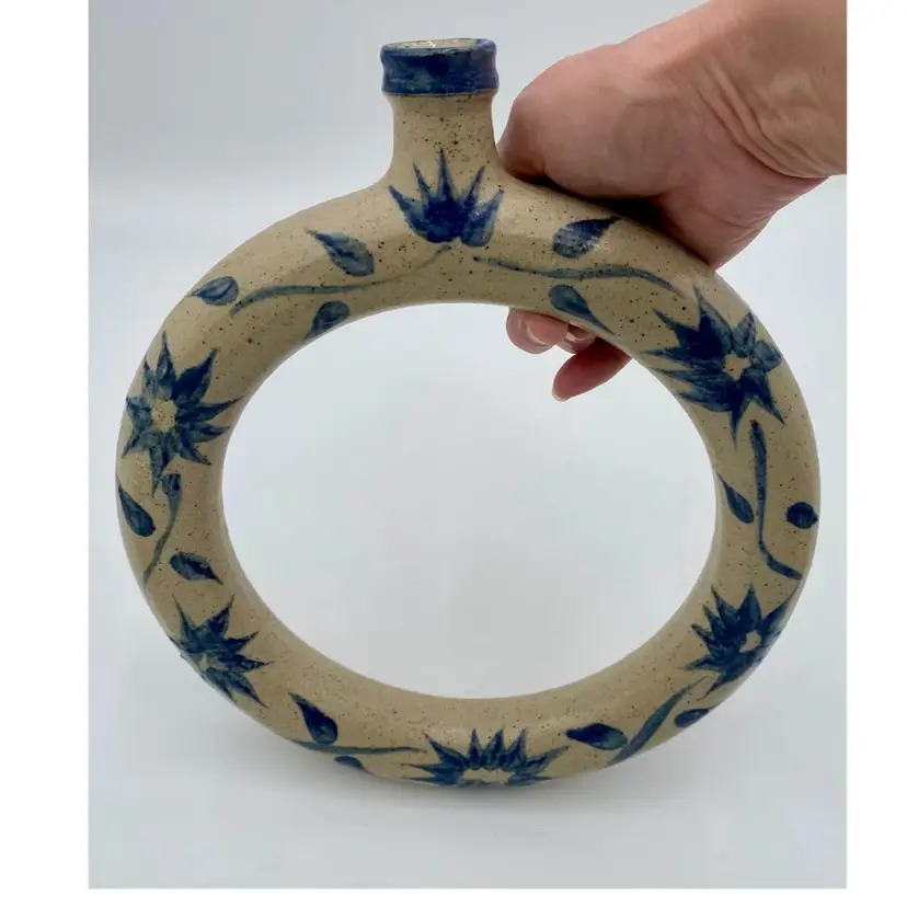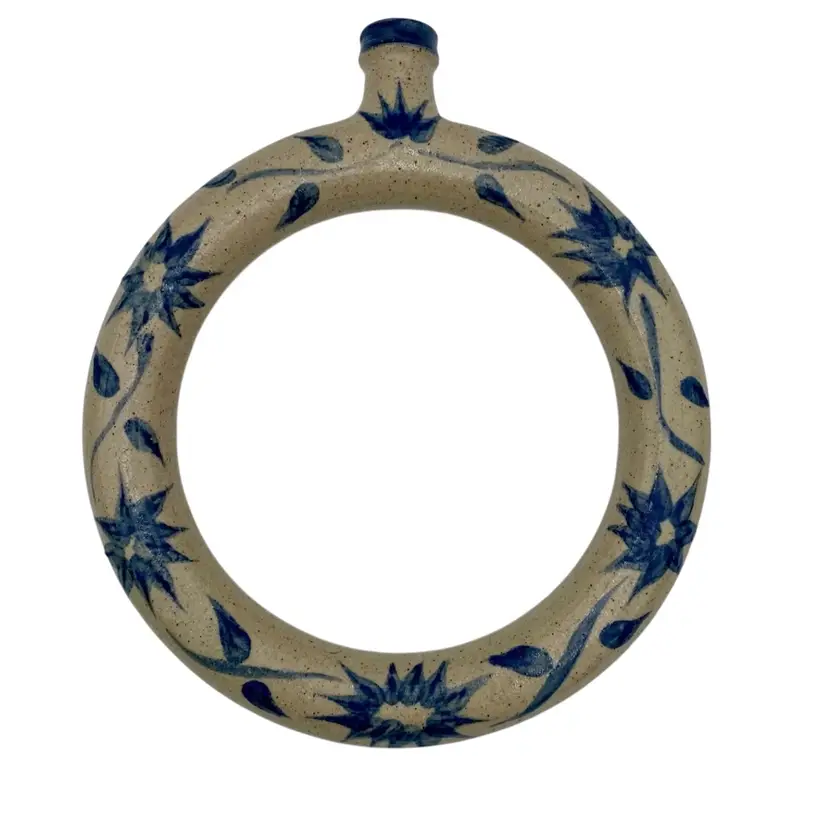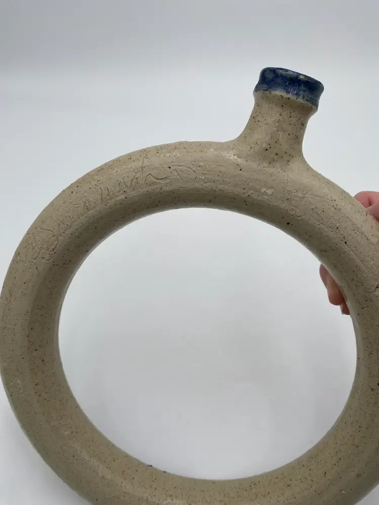 This vintage studio pottery salt glaze ring jug/harvest jug features a beautiful floral design, signed by the artist who handmade it in 1979. This ring jug (or harvest jug) is 11.8 inches high and 10.3 inches wide. The salt glaze is beautiful, with a lovely floral vine circling the body of the jug. Made in the United States, this unique piece is signed by the artist and dated 1979. (I can make out most of the signature: A. Savannah DeZan...try). Traditionally, a ring jug was used to carry water, like a canteen. The jug is hollow and fillable, and would easily slip over your arm/shoulder.