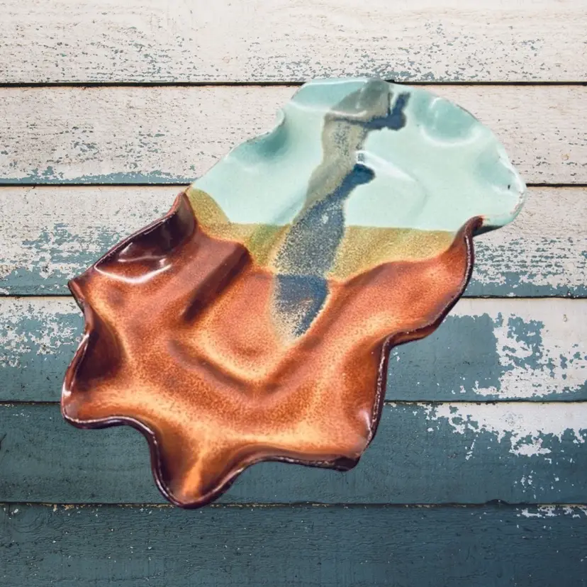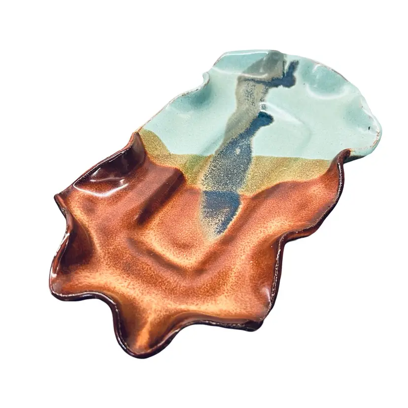 Beautiful dish approximately 8 inches long 3 1/2 inches wide Signed on the bottom by the artist There are a few tiny flea bites on the edge
