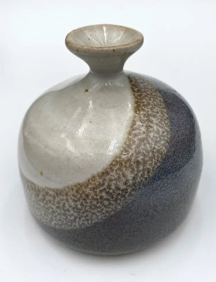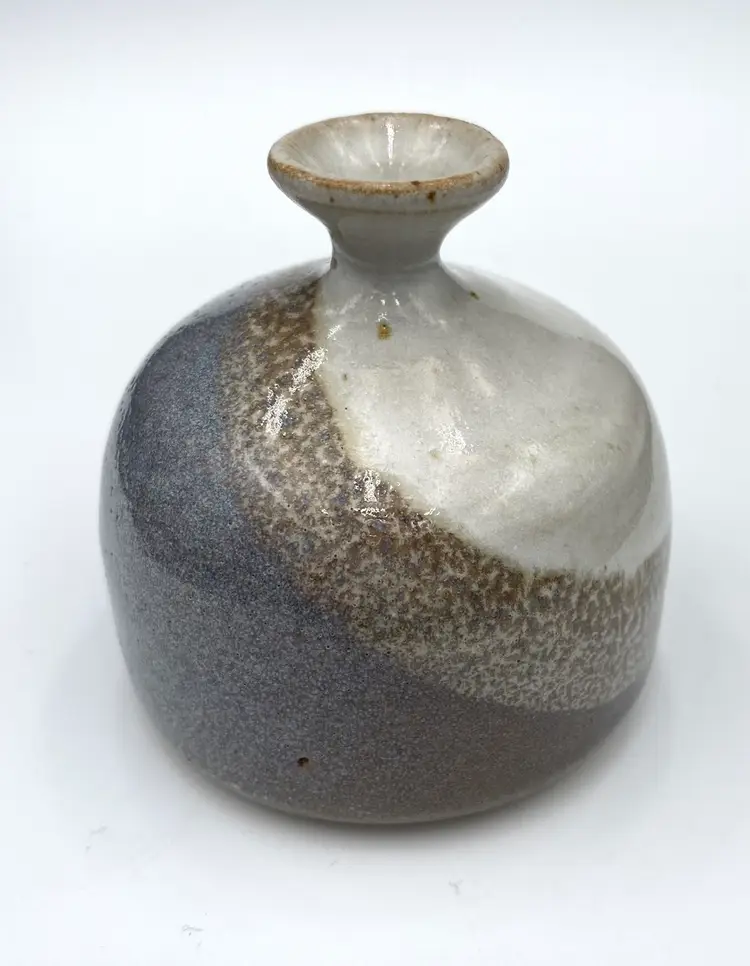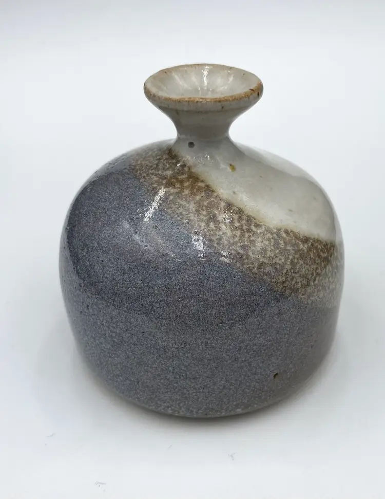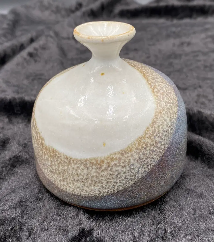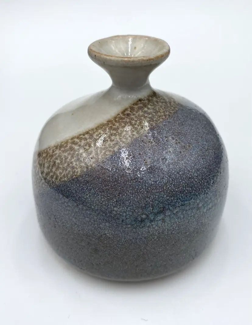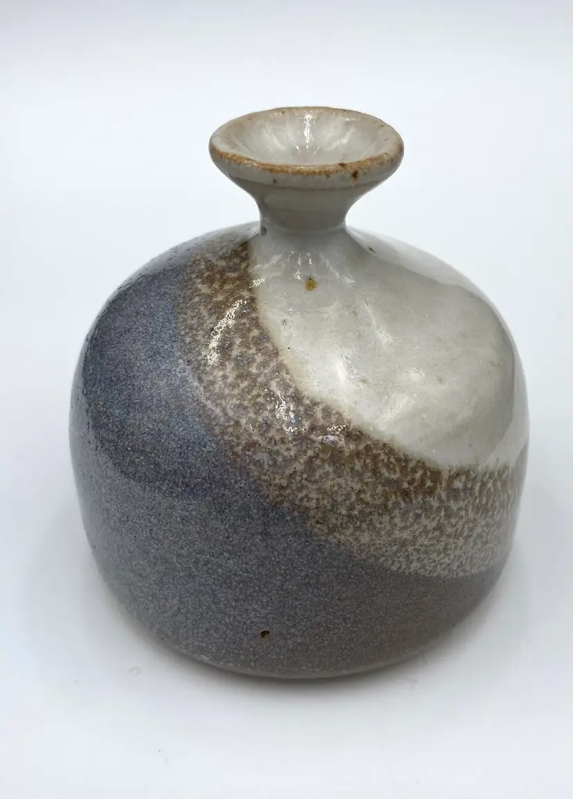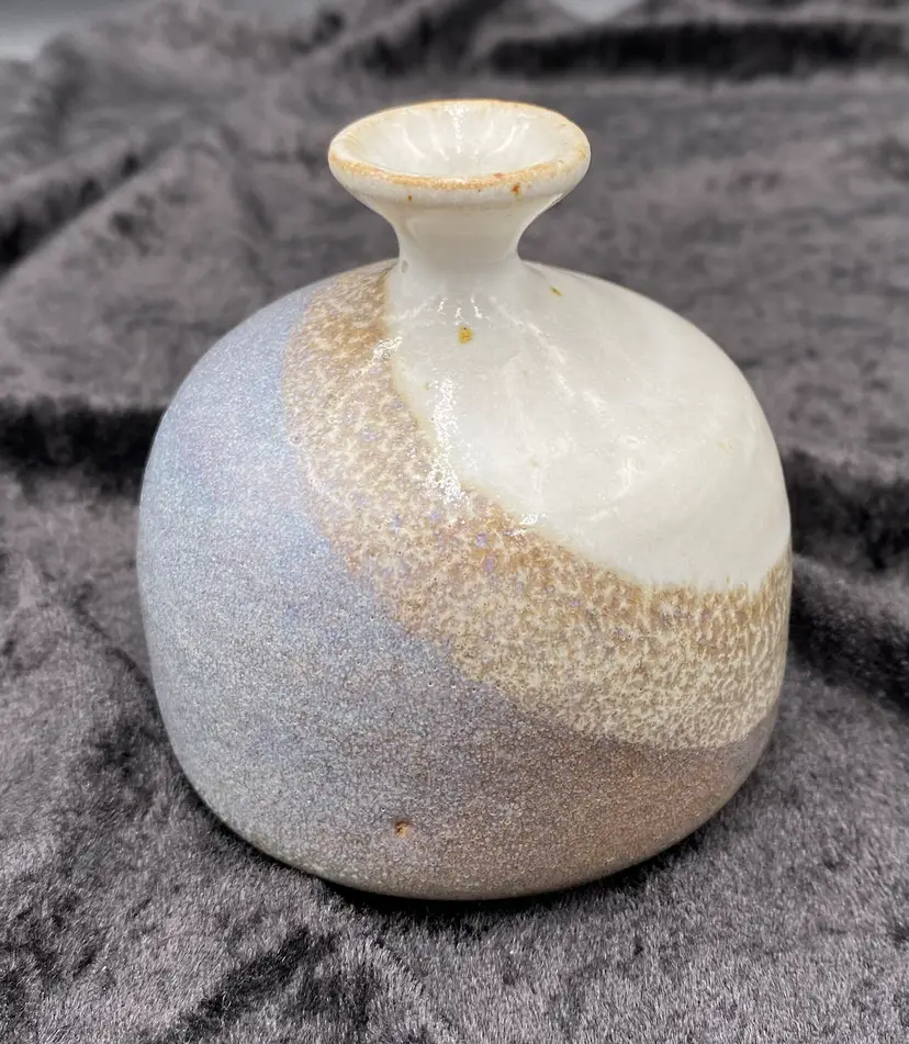 This vintage studio pottery stoneware Bud Vase is a unique and handmade piece signed by the artist, Sylvia. The vase features an layered dip glaze pattern, with a blueish-gray section, a mottled grey/tan section, and an off-white section. The vase stands 3.2 inches tall and is 3.25 inches wide. It's a lovely piece that would work well on a desk or a shelf.