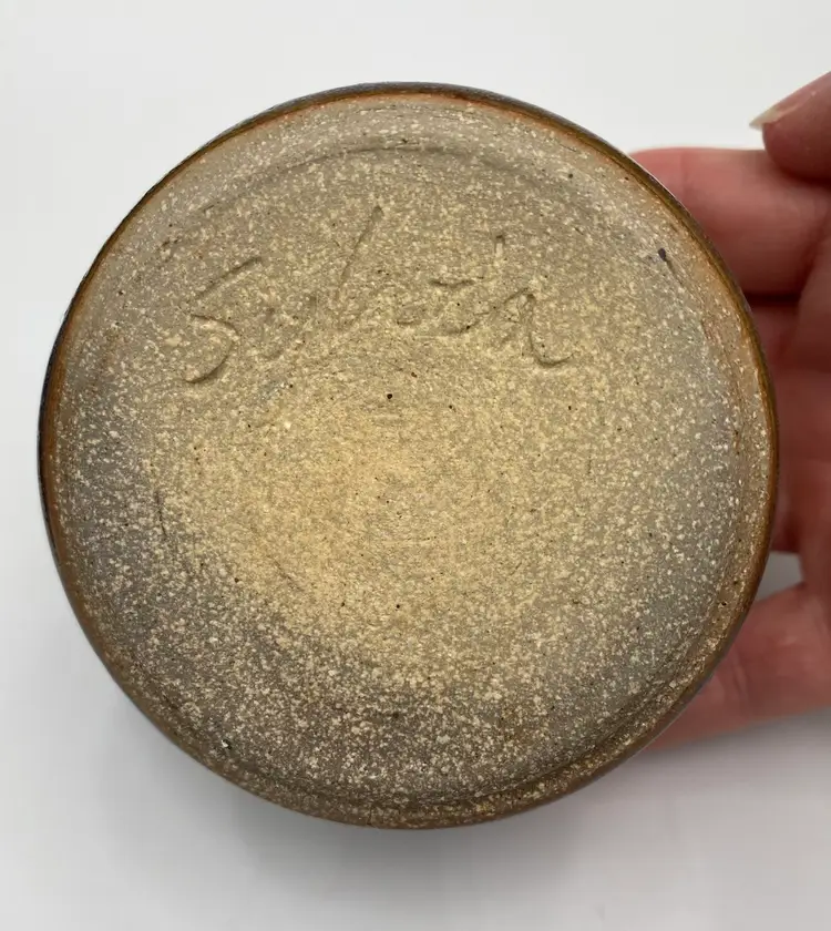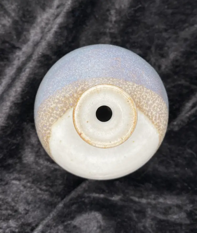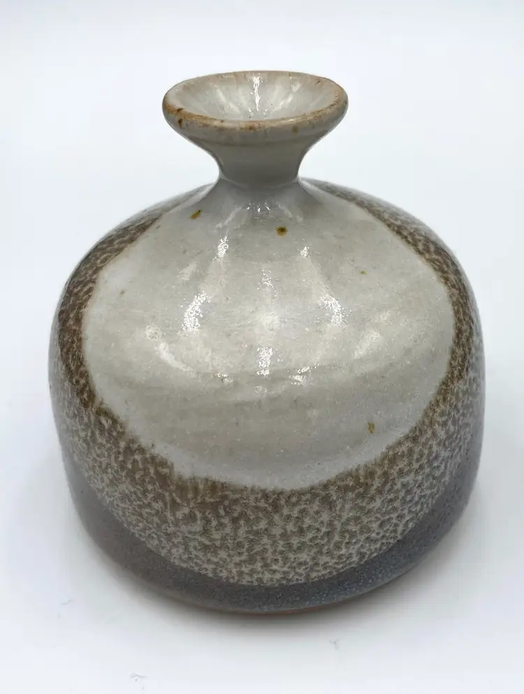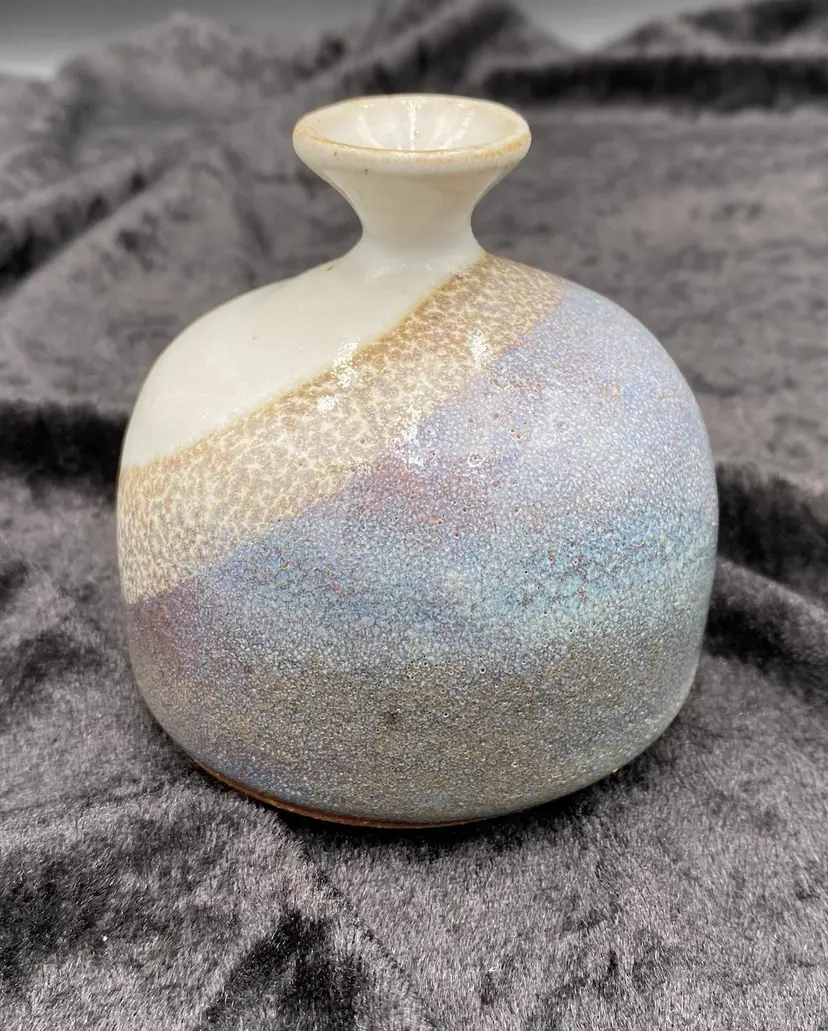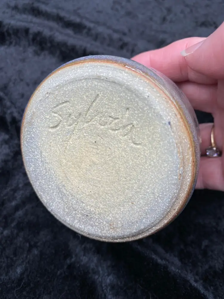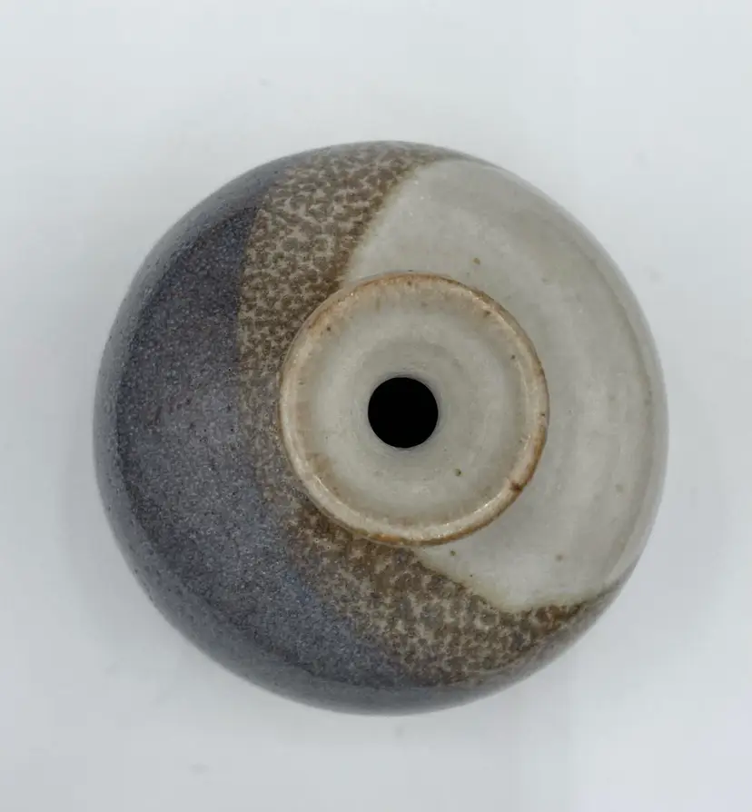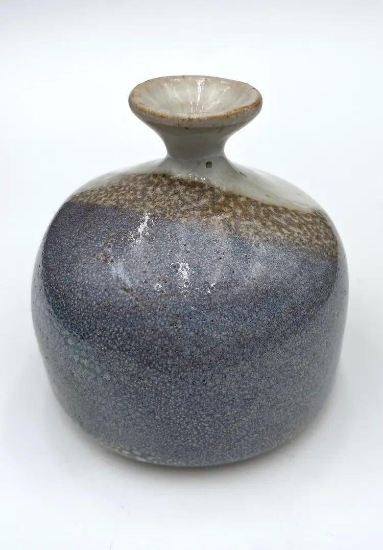 This vintage studio pottery stoneware Bud Vase is a unique and handmade piece signed by the artist, Sylvia. The vase features an layered dip glaze pattern, with a blueish-gray section, a mottled grey/tan section, and an off-white section. The vase stands 3.2 inches tall and is 3.25 inches wide. It's a lovely piece that would work well on a desk or a shelf.