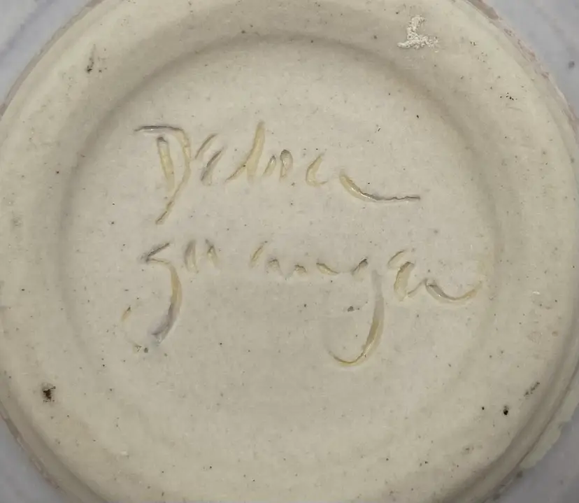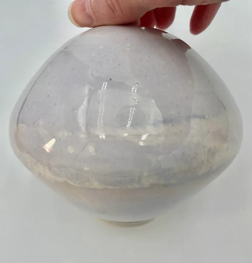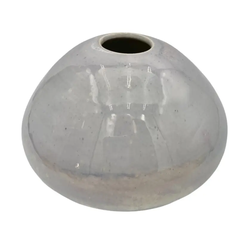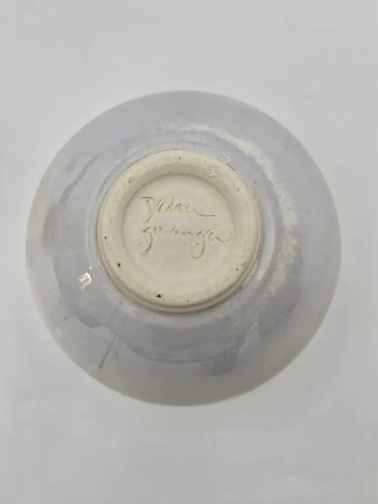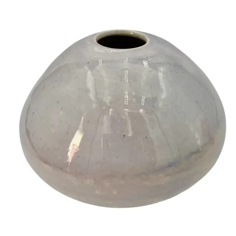 This vintage studio pottery vase/weed pot, signed by Debra Swanger, is a handmade piece featuring softy-blended glazes in light blues, creams, pinks and purples. With a glossy finish the vase measures 5 inches in width and 4.7 inches in height. It weighs 1 pound and 2.9 ounces. The beautiful colors remind me of the inside of a pearlescent oyster shell or the beginning of a sunrise.