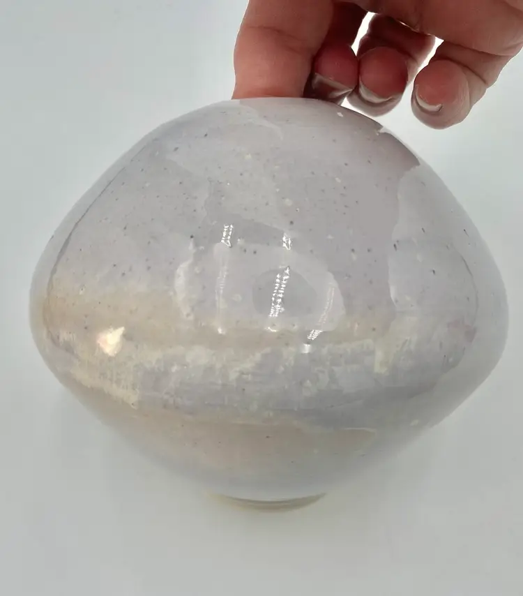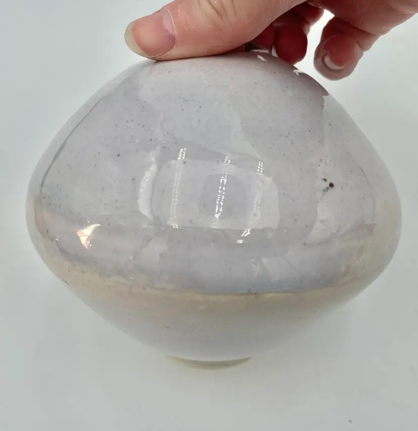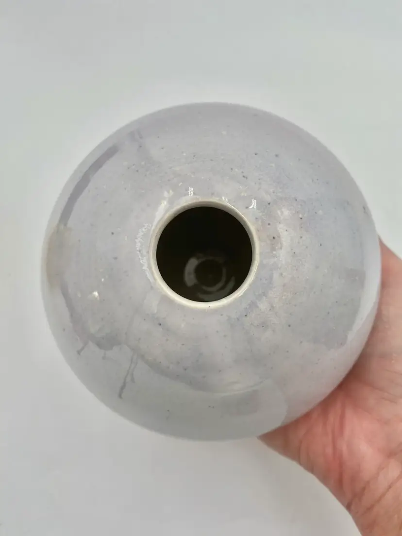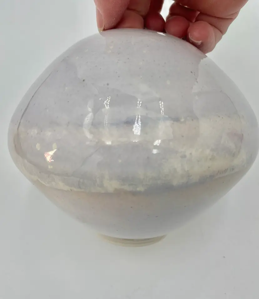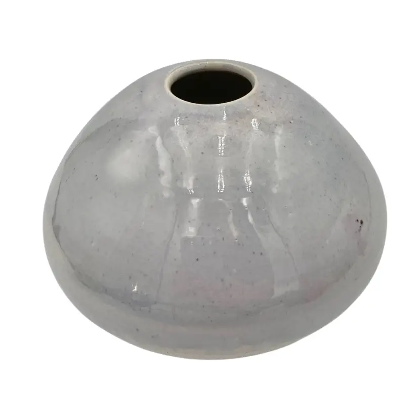 This vintage studio pottery vase/weed pot, signed by Debra Swanger, is a handmade piece featuring softy-blended glazes in light blues, creams, pinks and purples. With a glossy finish the vase measures 5 inches in width and 4.7 inches in height. It weighs 1 pound and 2.9 ounces. The beautiful colors remind me of the inside of a pearlescent oyster shell or the beginning of a sunrise.