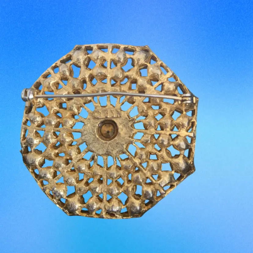 Textured gold tone 2 “ diameter Large center pink rhinestone surrounded by smaller pink and AB Rhinestones Concave
