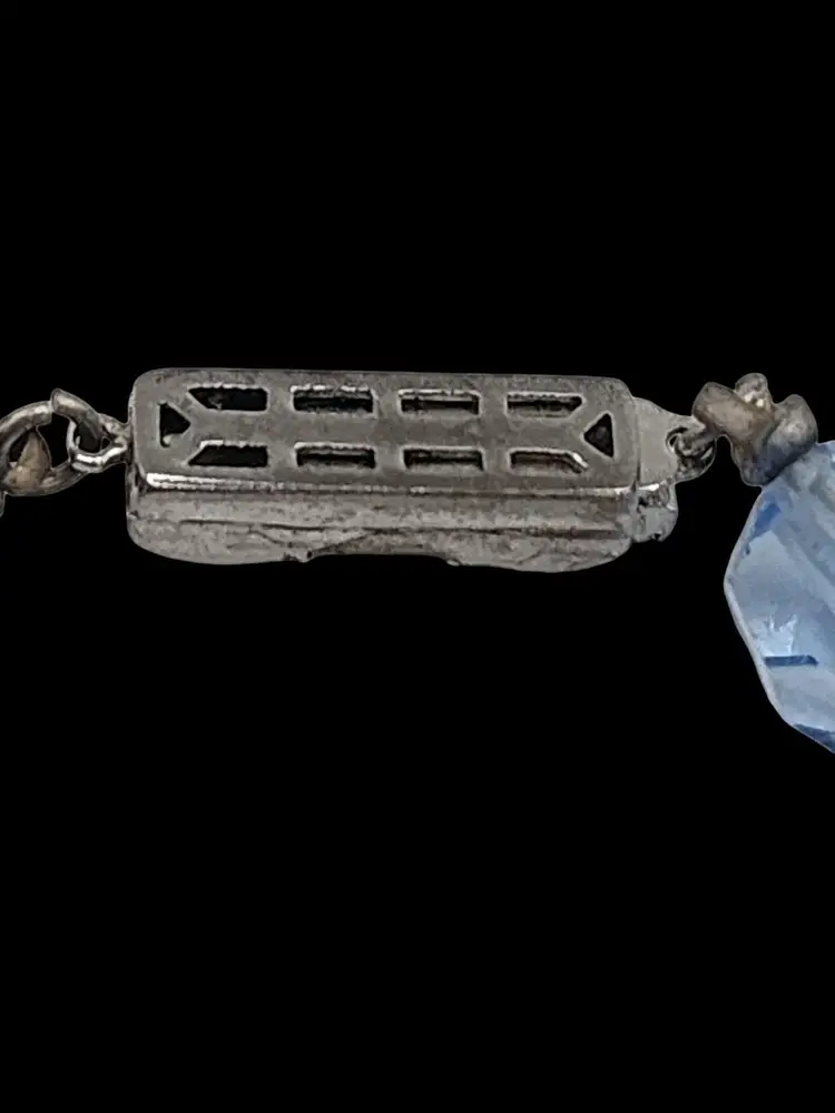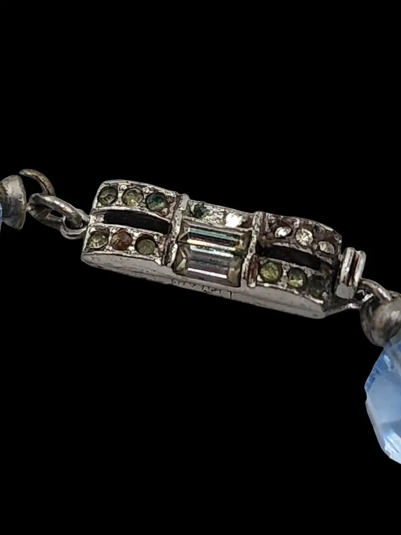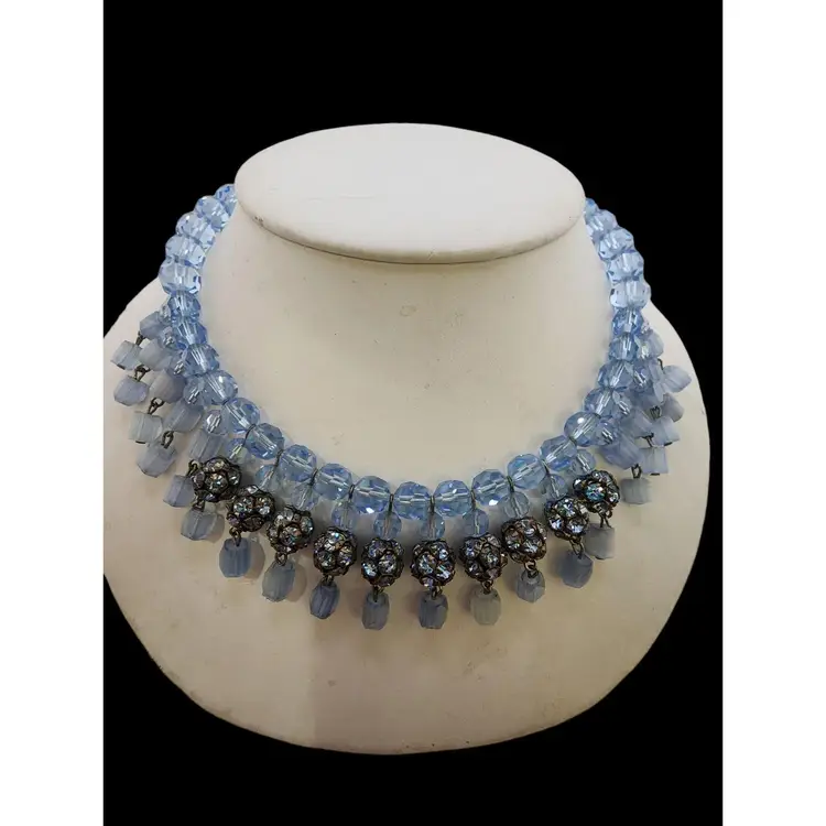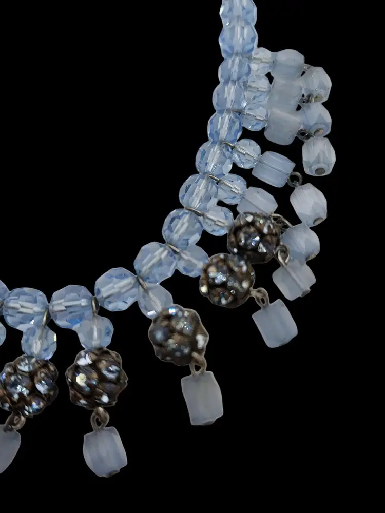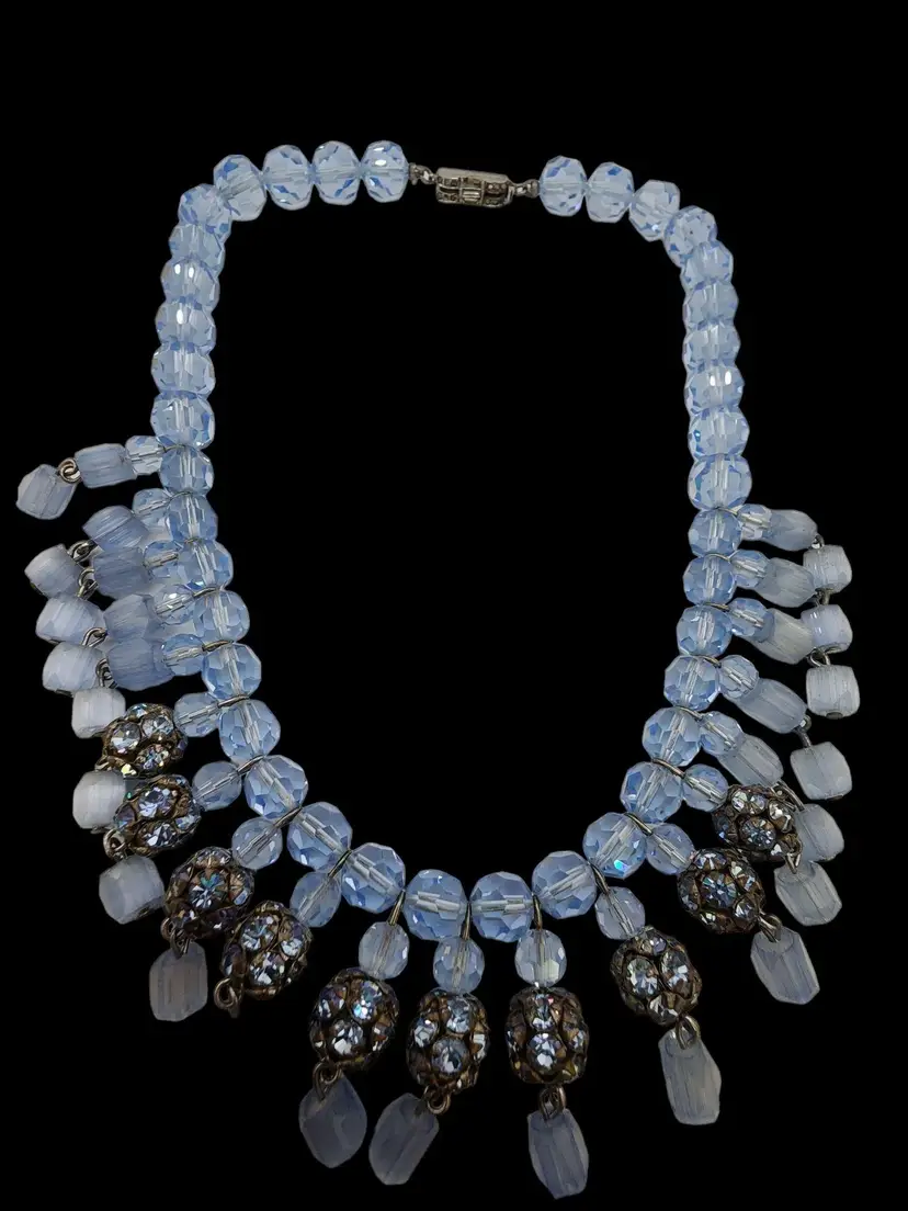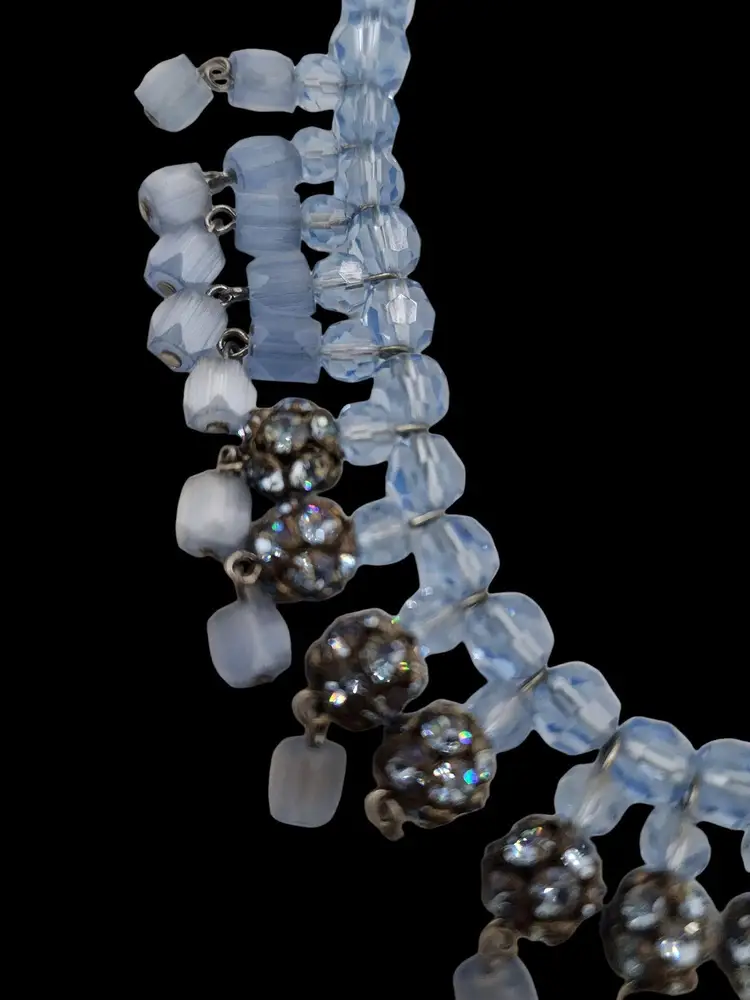 Size: 16" Color: Blue Condition: Very good vintage; some darkened stones. Signed: None Details: Wonderful atlas glass. Unusual rhinestone lock.