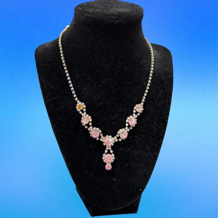 Stunning 18-inch rhinestone necklace featuring delicate pink floral-set stones accented by clear rhinestones along a silver-tone chain. The drop design adds just the right touch of elegance, perfect for evening wear, weddings, proms, or vintage-inspired fashion.