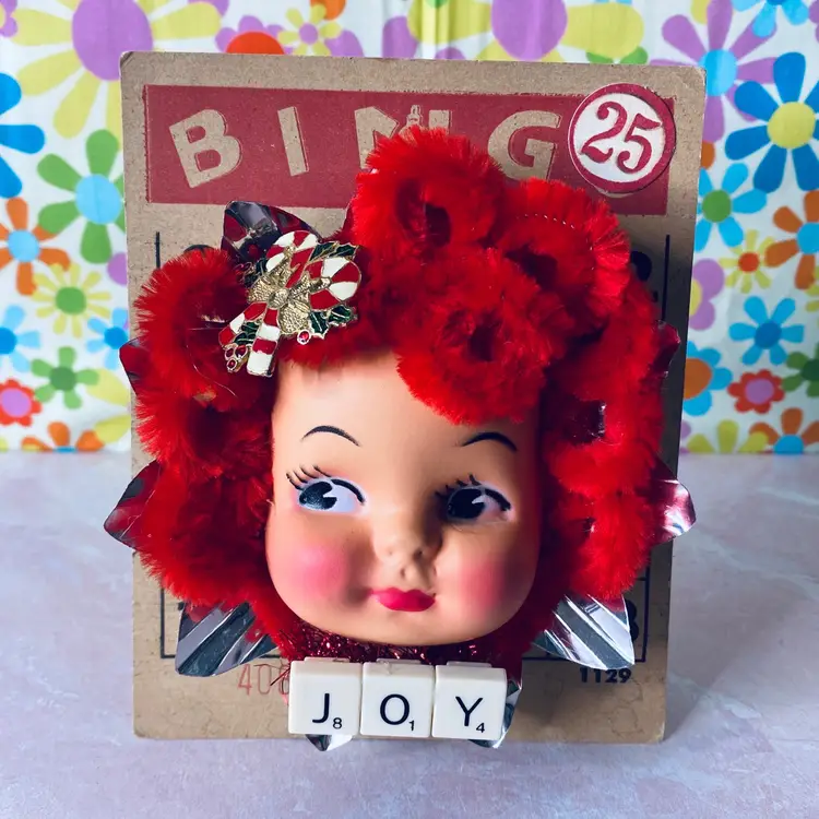 Measures approx. 5" x 4". My Bingo Card Gals are made from vintage bingo cards, and vintage celluloid doll faces and decorated with various vintage bits and bobs such as chenille bump curls, vintage Christmas reflectors, vintage jewelry pieces, buttons, flowers, scrabble letters, etc. Each one is unique and one-of-a-kind. These little darlings come with a cardboard stand so they can sit nicely on your shelf.