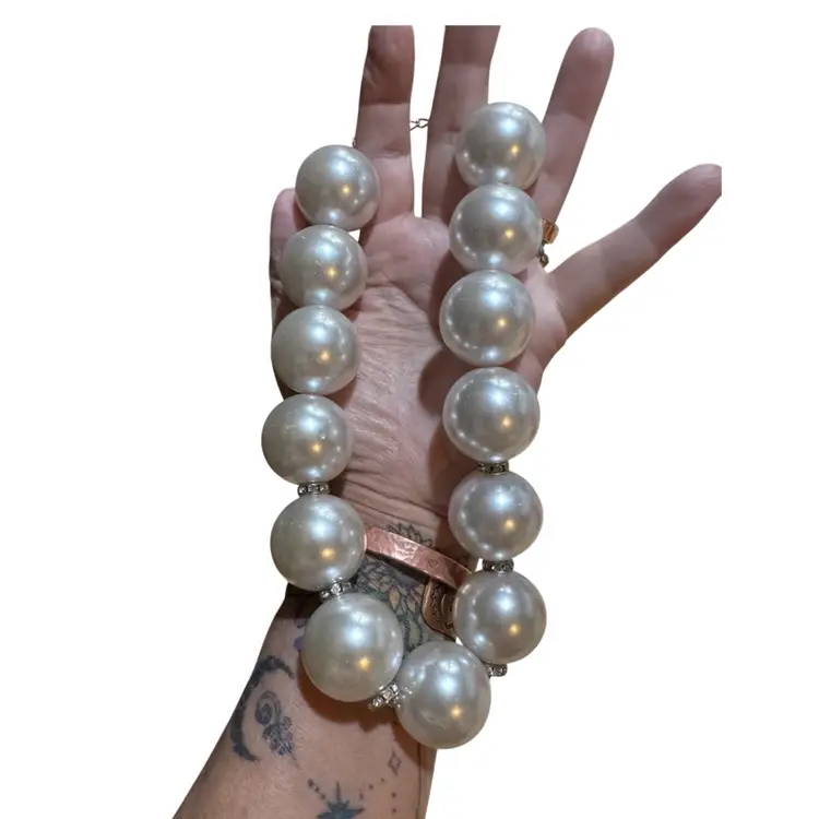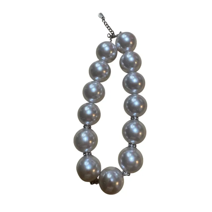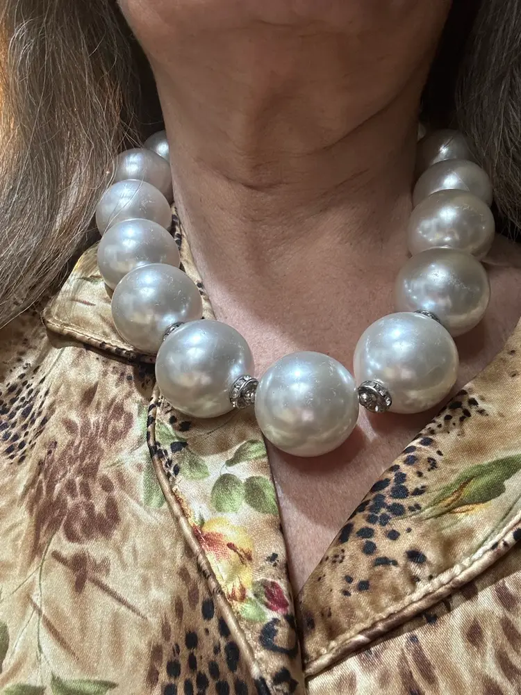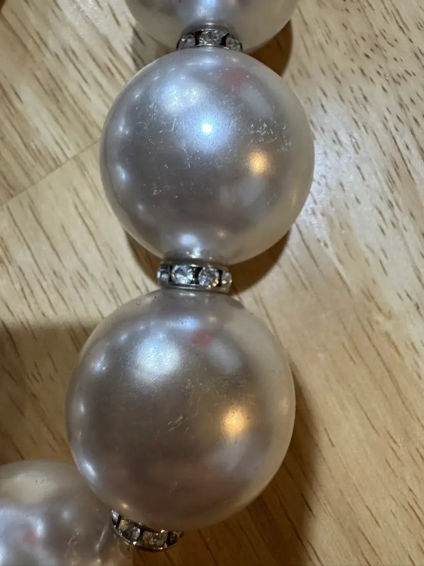 Materials: 20mm Glass Pearl, Dazzling Rhinestones, Brass Base Hardware. The pearls are High Quality ones, not Cheap plastic beads! • Color: White Pearls, Gold Hardware • Choker Length: 16 inches necklace has an extra 2" -5cm extension chain, which offers a more comfortable fit. • Closure: Lobster Clasp