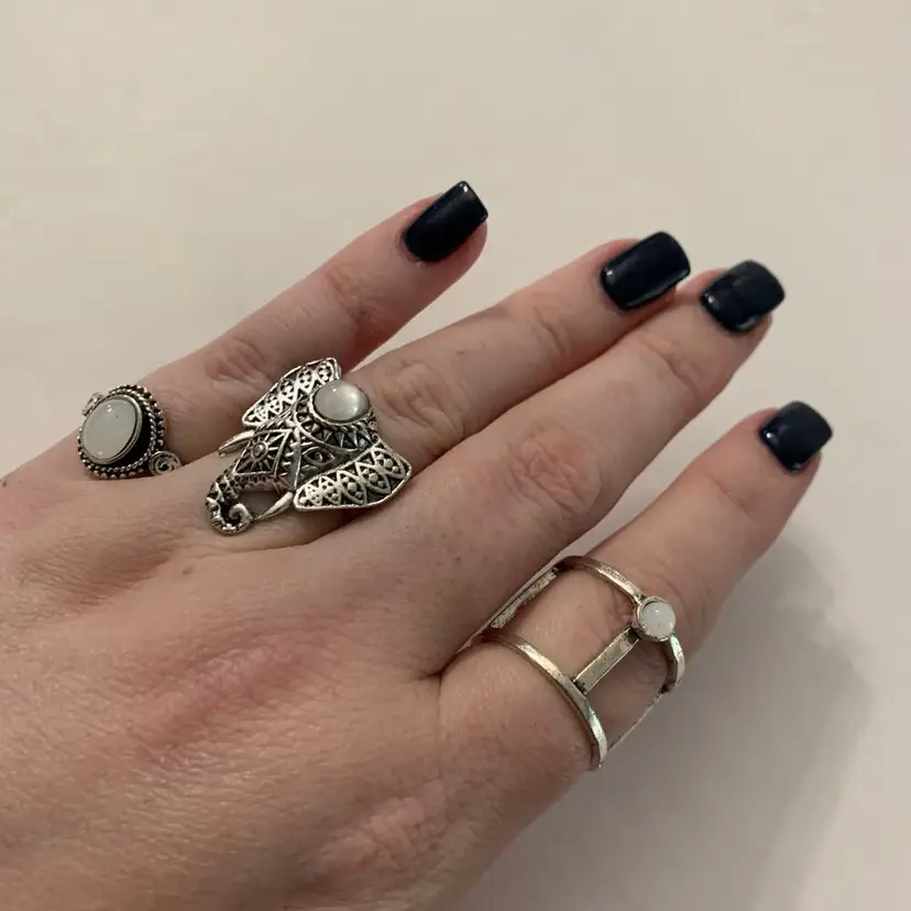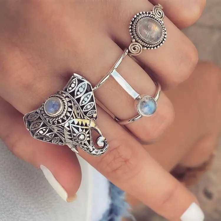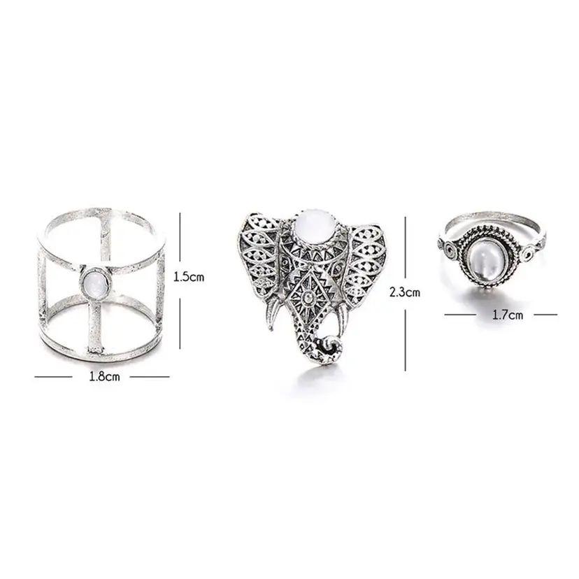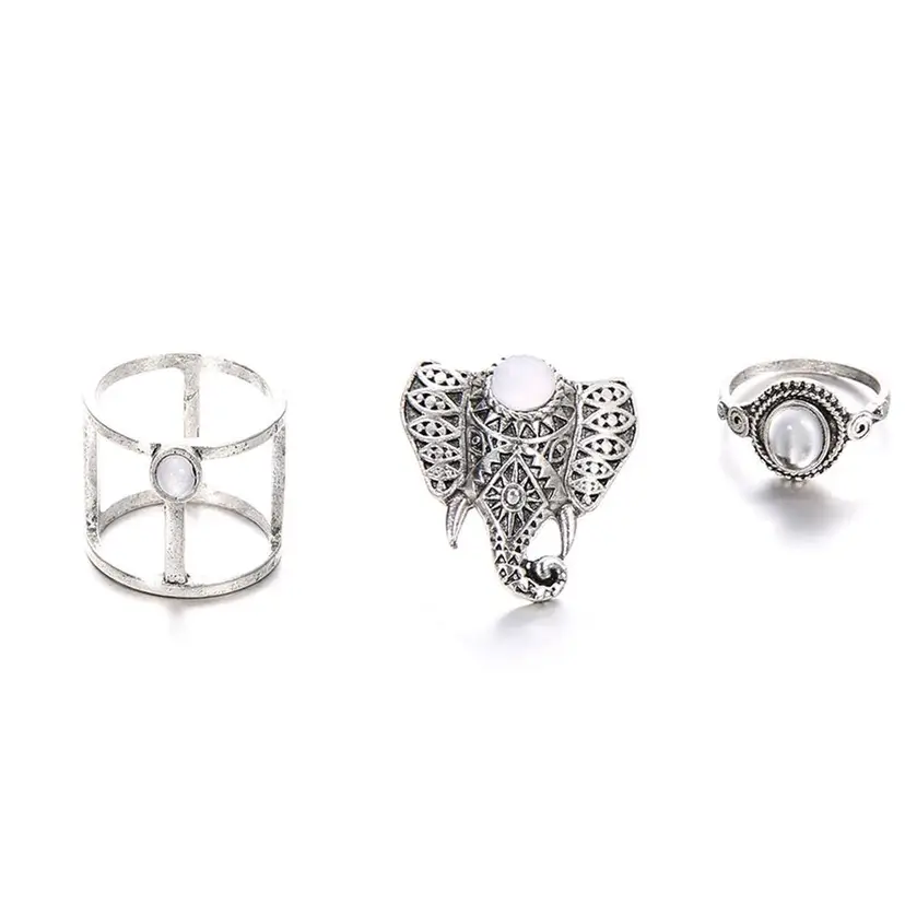 Vintage Style Elephant 3 Piece Ring Set Adjustable Fashion costume jewlery Metal alloy, silver-colored, clear / white gems Ornate vintage-style large / over-sized elephant head ring One size / adjustable Three total rings that match