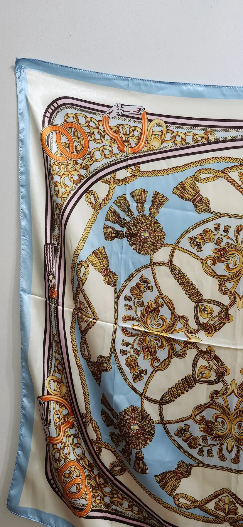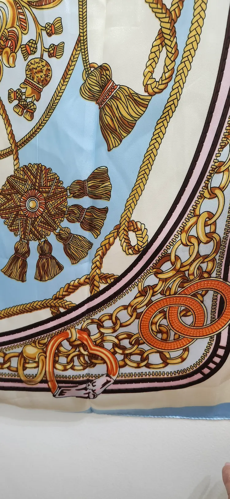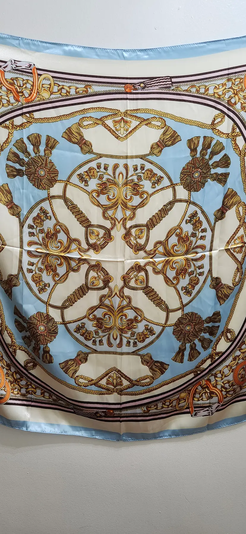 "Vintage Style Floral & Rope Pattern Square Scarf - Silk Feel Head Scarf or Neck Scarf"- Highlights the vintage aesthetic and versatility for wearing. Design: Features a pattern of ropes, tassels, chains, and zippers in shades of baby blue, gold, pink, orange and off white. 35x35 Versatility: Can be used as a hair accessory, on the wrist, attached to a handbag, or as a backpack accessory.