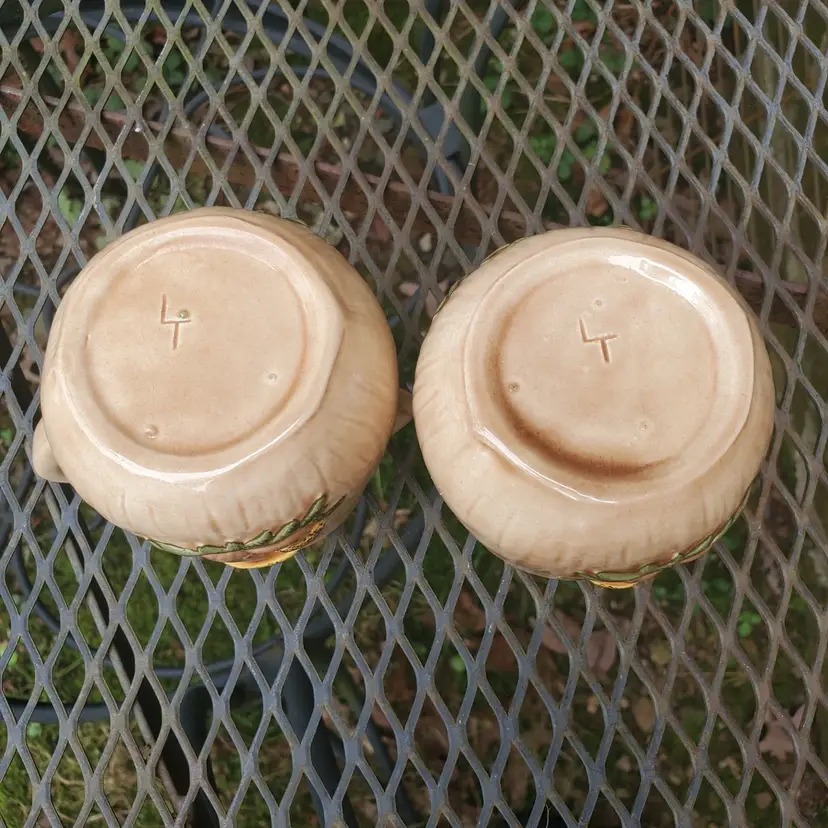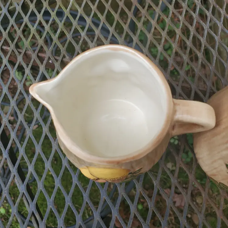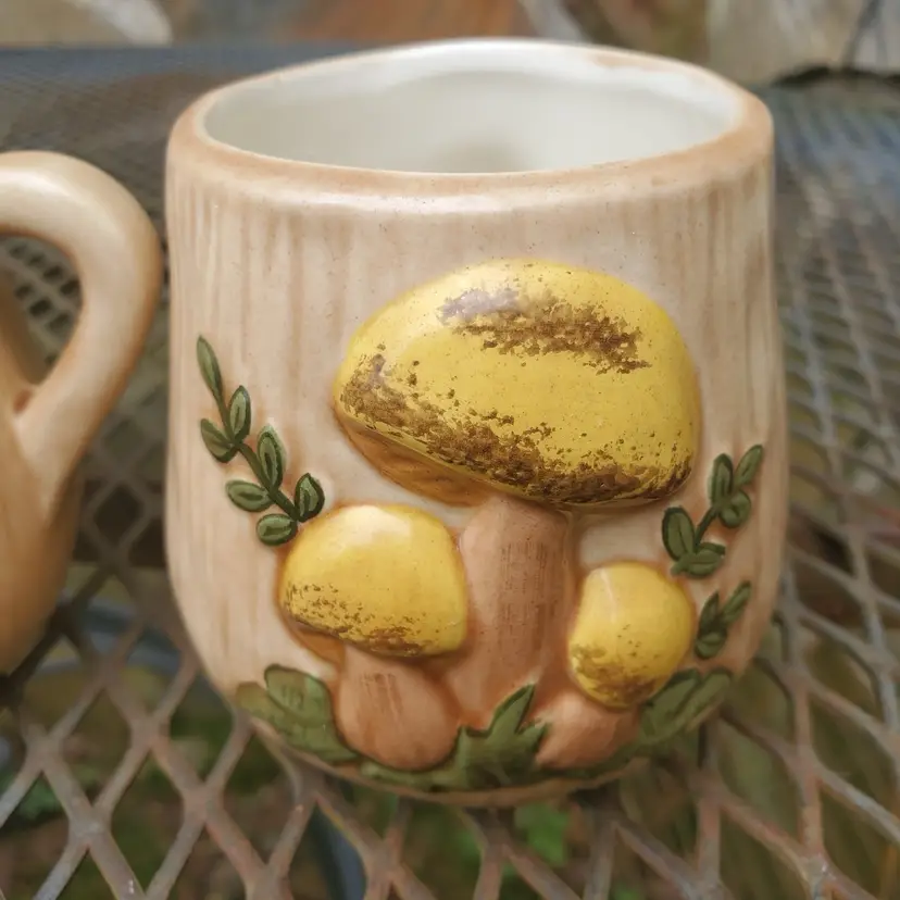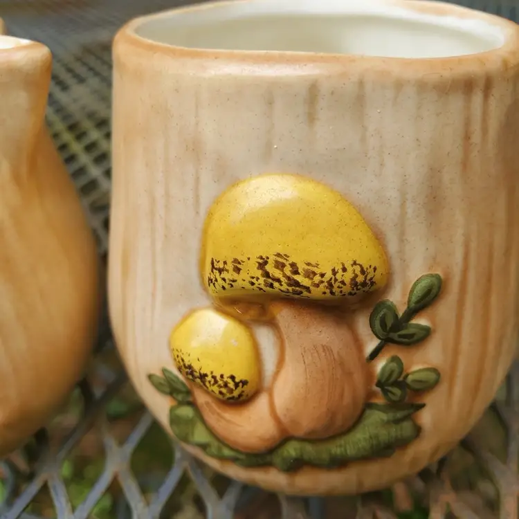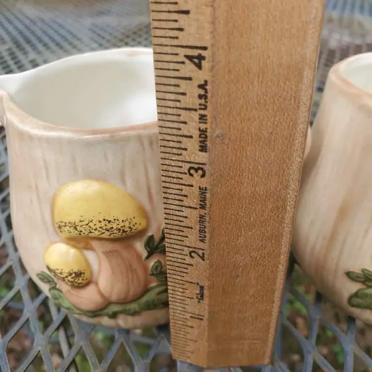 This vintage ceramic sugar bowl and creamer set is a charming addition to any kitchen or dining room. The hand-painted mushroom design on both pieces adds a touch of whimsy and a rustic feel to your table setting. Measuring at 3 inches in diameter, the sugar bowl is perfect for serving sugar or other small items, while the creamer is ideal for serving cream or milk. The set includes both pieces and is a great addition to any collection.