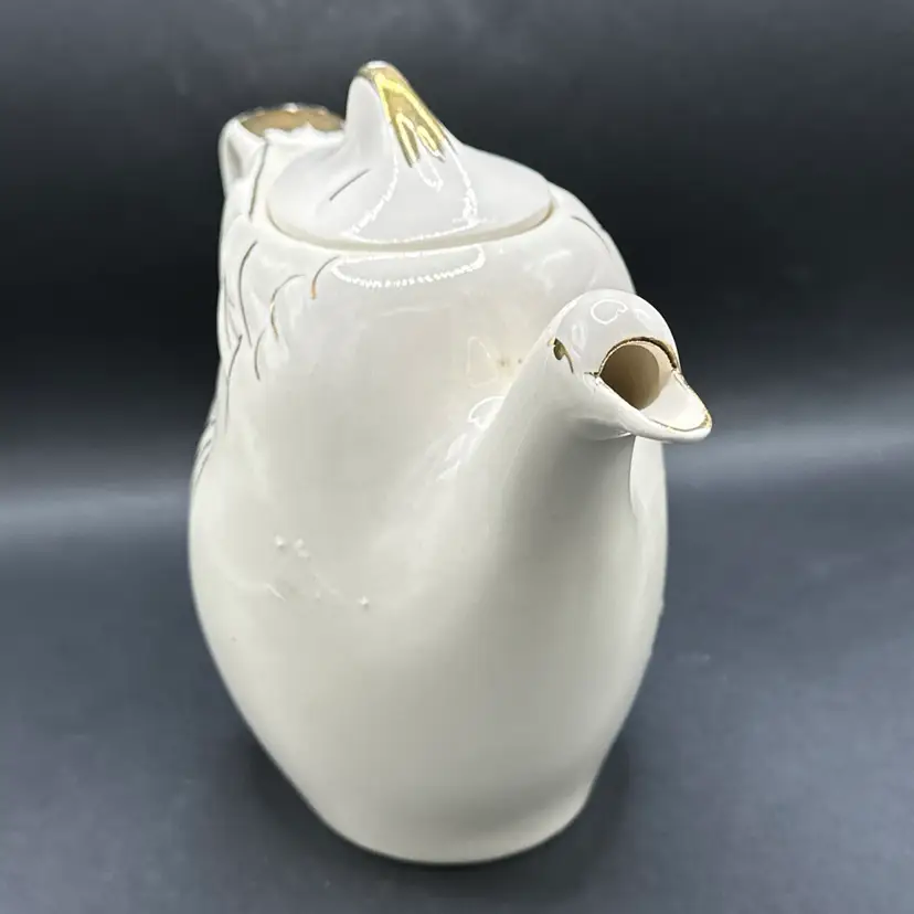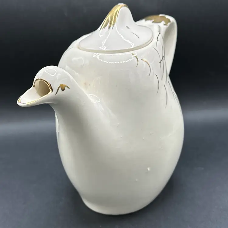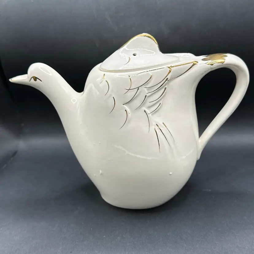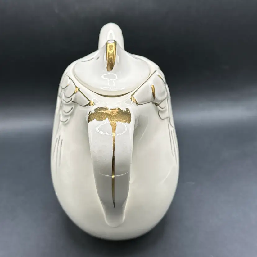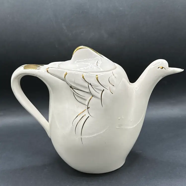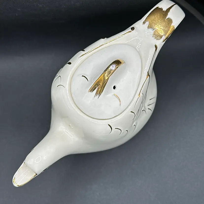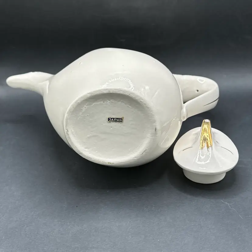 This vintage Swan teapot was made in Japan from porcelain ceramic. Its elegant design features a white color with gold accents, adding a touch of luxury to any tea lover's collection. With its Japanese craftsmanship, this teapot embodies traditional artistry and cultural influence, making it a unique and collectible piece for those interested in Asian cultures.small spot of paint loss on top of handle.