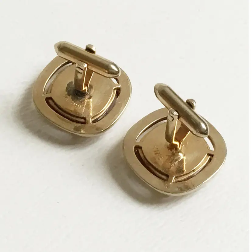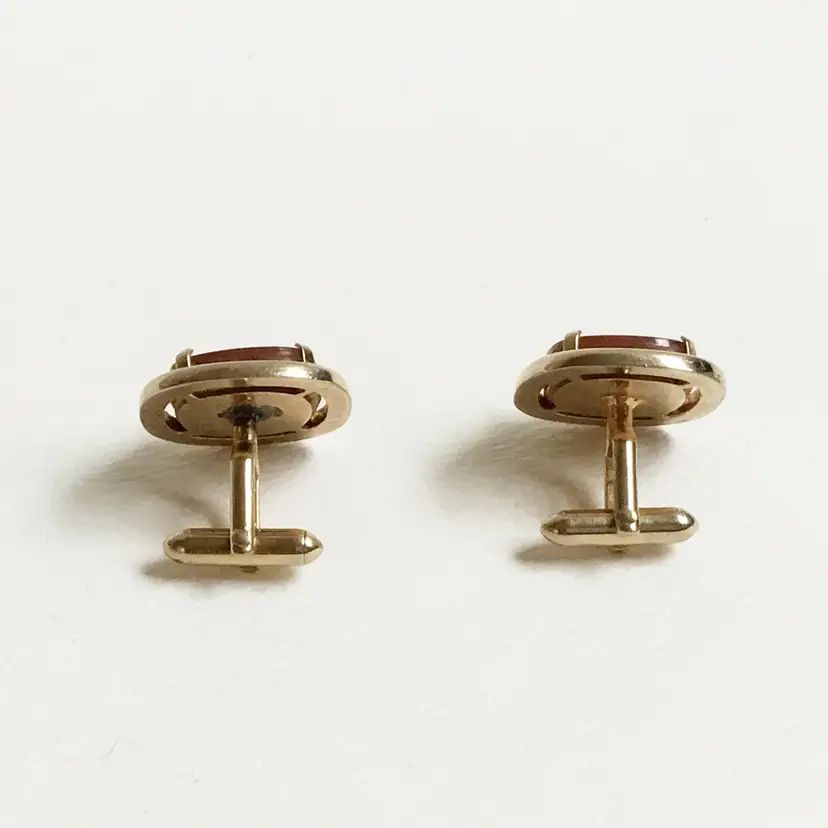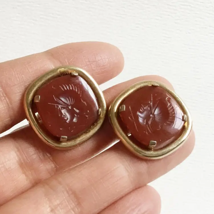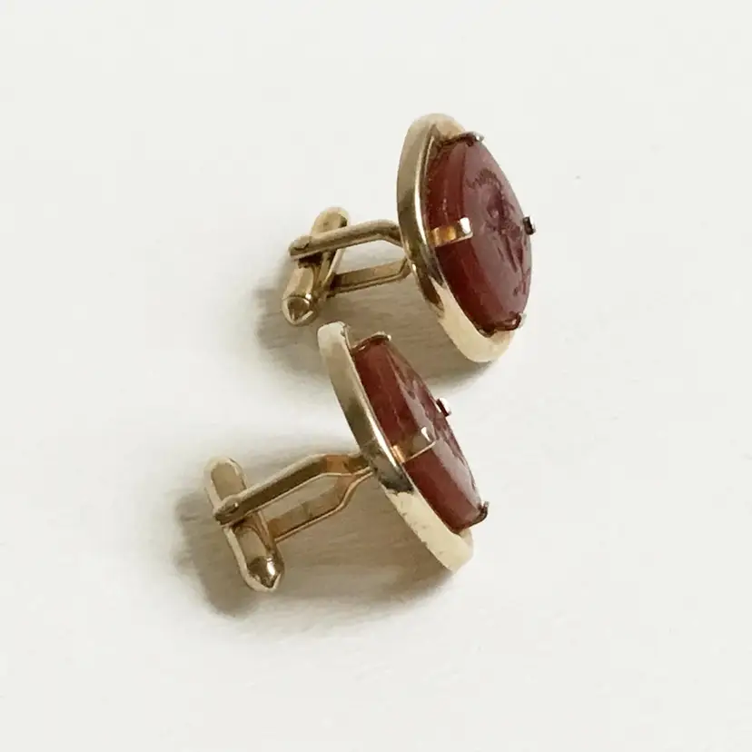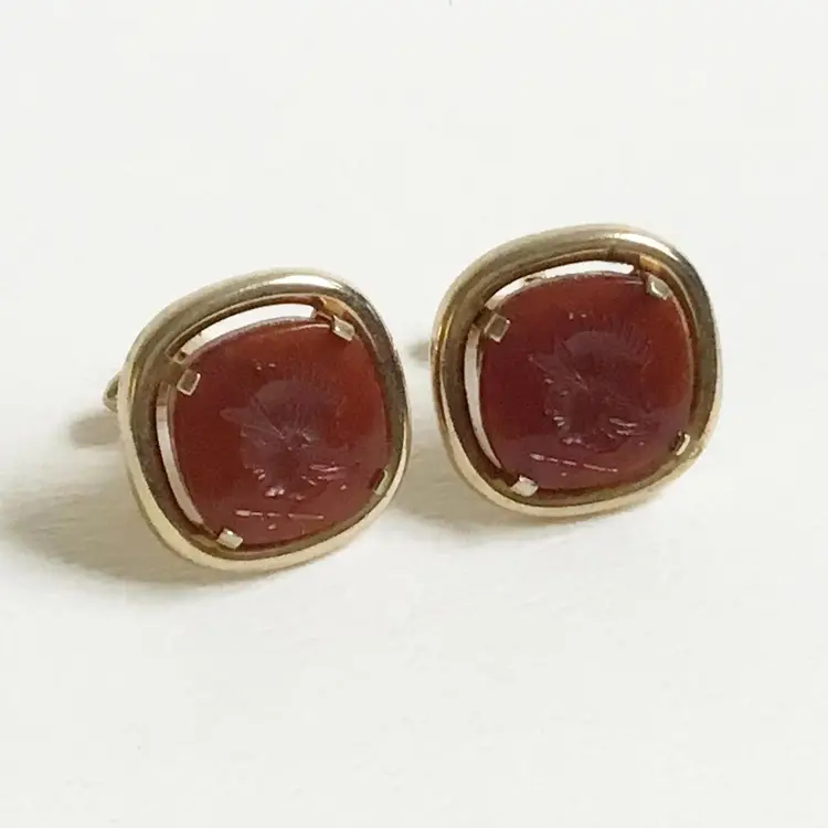 This is a pair of Swank cufflinks. They have a prong set carnelian colored stone that's been moulded or carved with a soldier design. Gold tone backings. Marked "Swank" on the back.