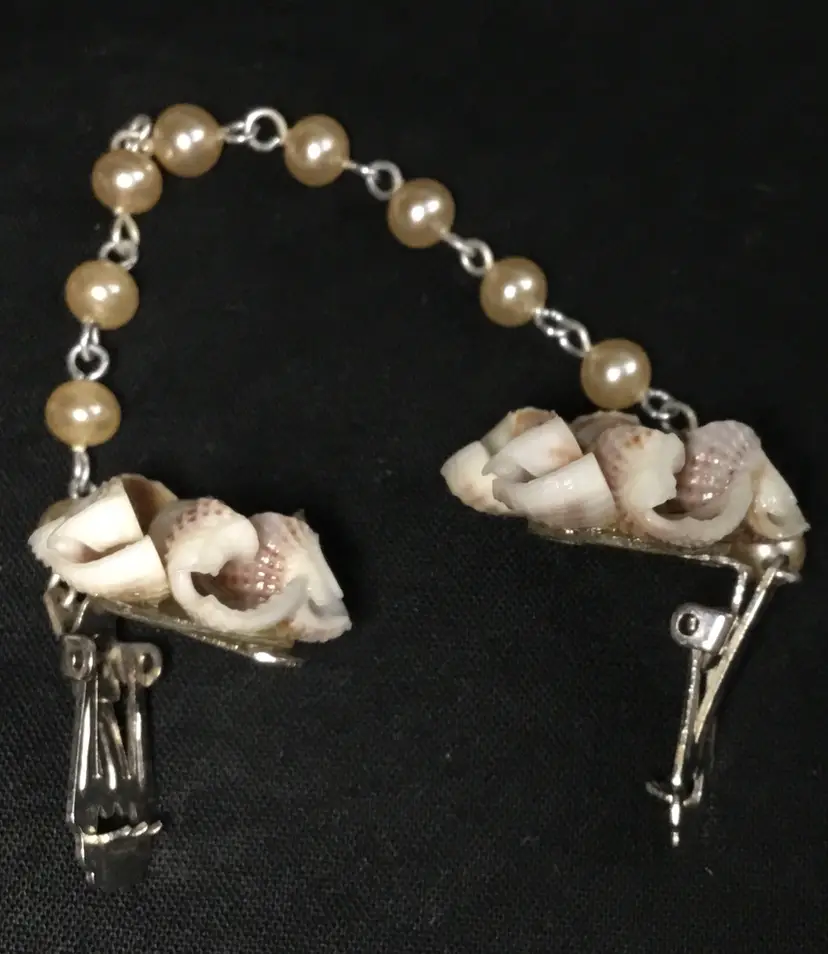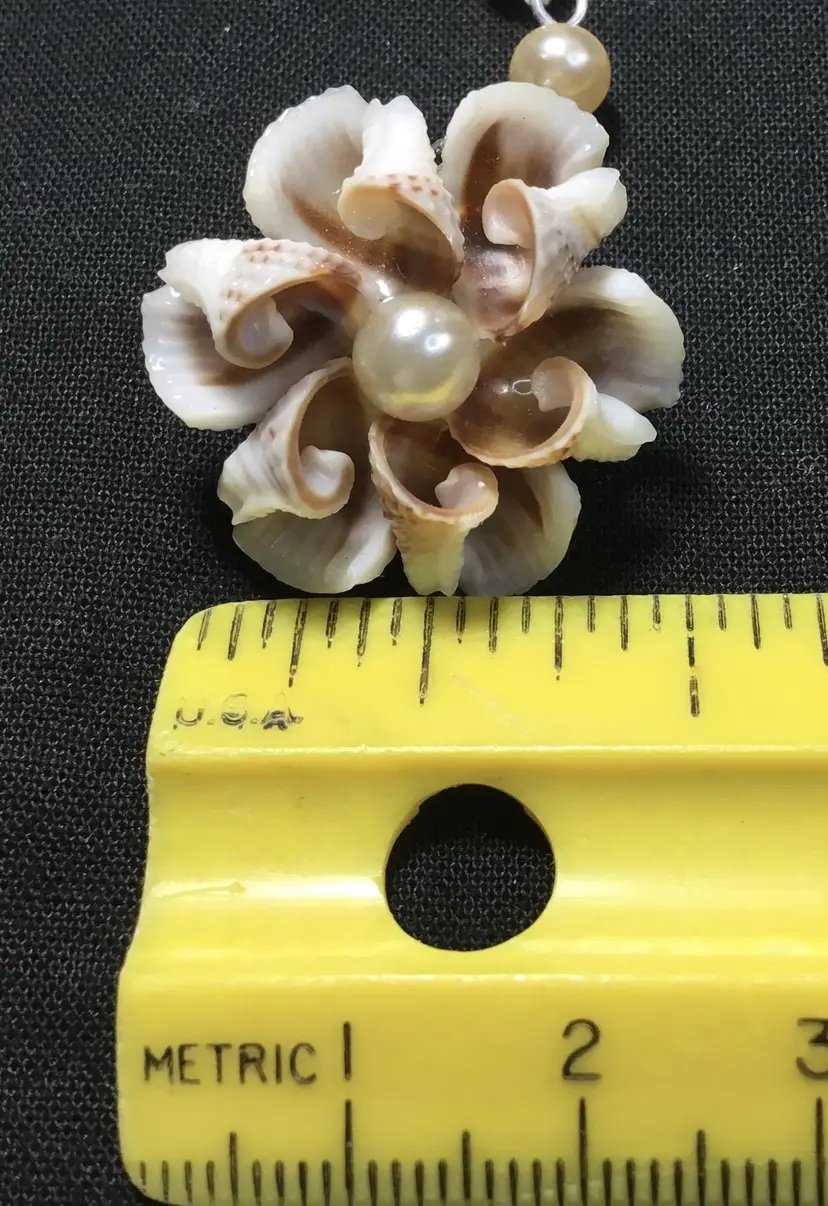 6.5 inches long including shell flowers. Flowers are 1 inch in diameter. Silver tone clips and silver tone findings. Faux pearls along chain. Overall color, beige with brown stripes on shells.