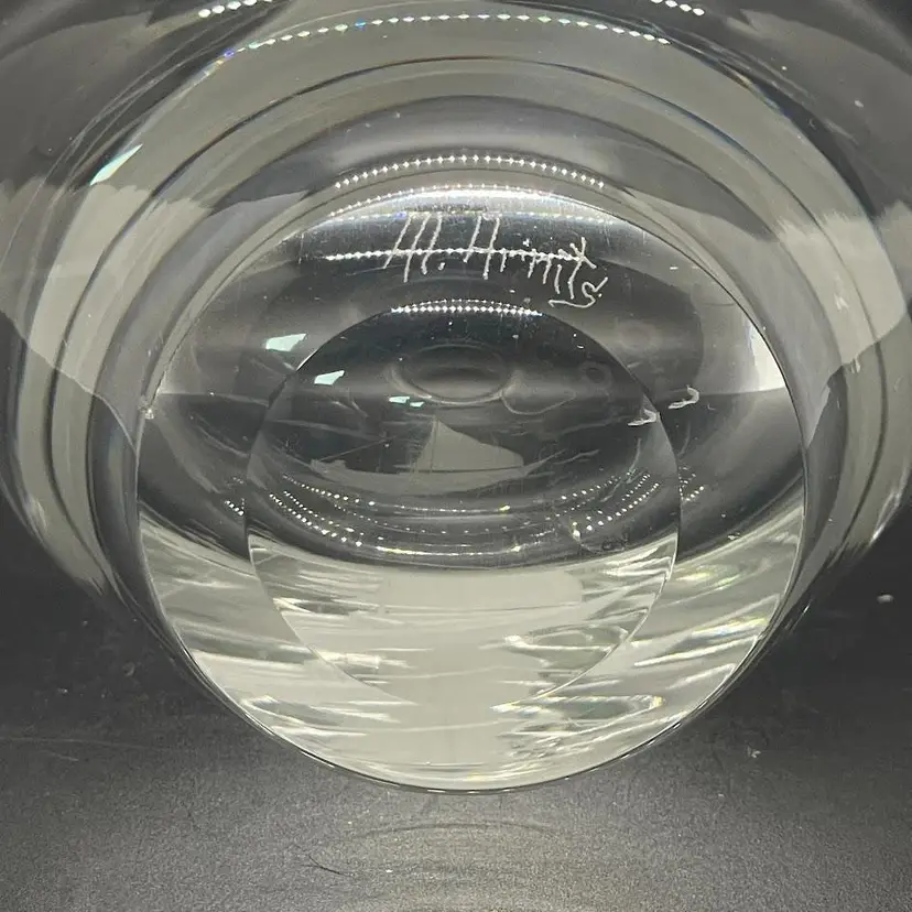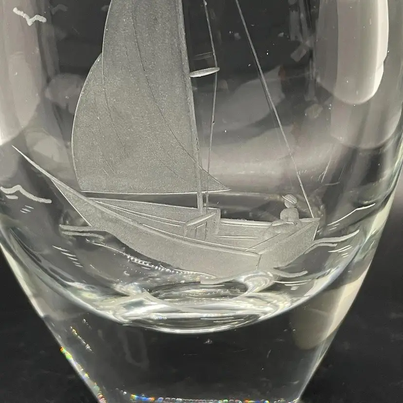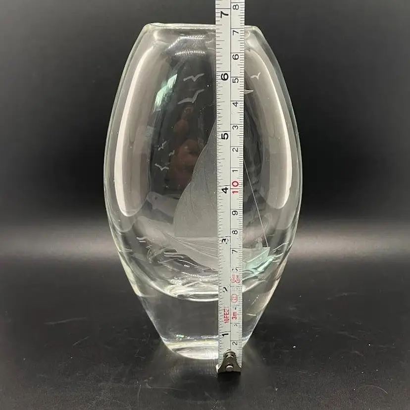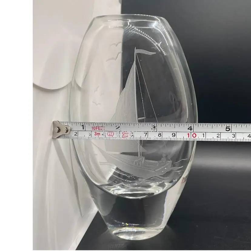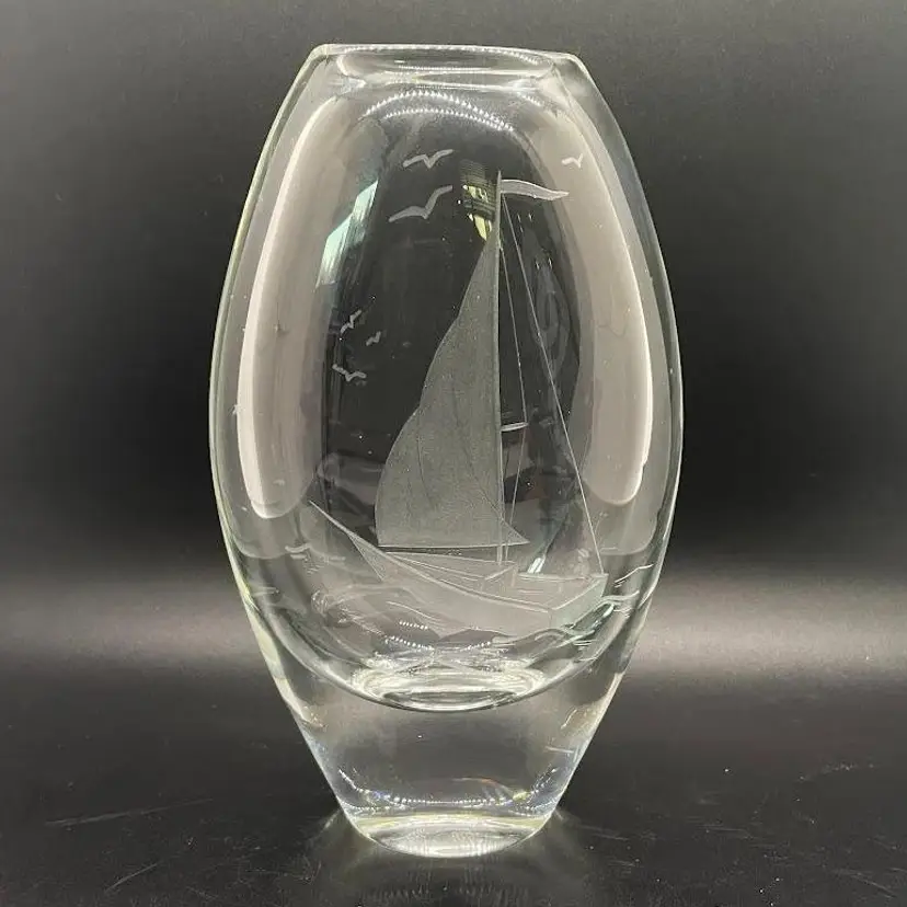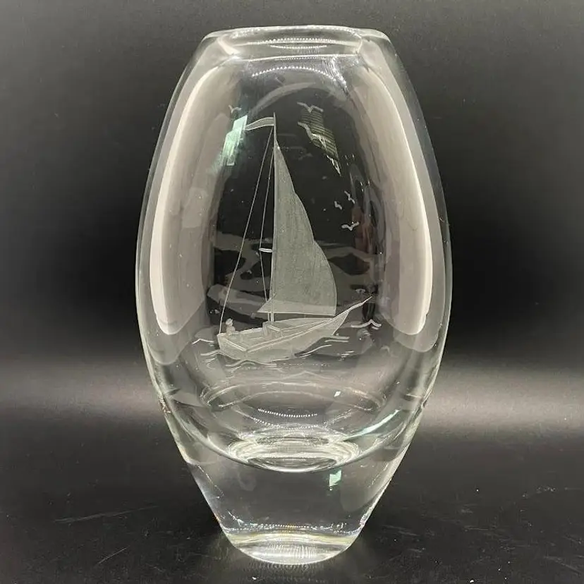 Vintage Swedish Crystal Vase with Beautiful Hand Cut/ Etched/ Engraved Sailboat Ocean Scene. Signed by Al. Arnits - an artist from Washington. No cracks. Couple small flea bite chips on the bottom edge. Small bruise/scuff under the waves. Couple small flea bite chips along the edges of the etched design - not sure if these are the result of the etching process or not. Approx. 4 to 6 small bruises/scuffs on the sides and back. Shows signs of wear with light scuffing and scratching.