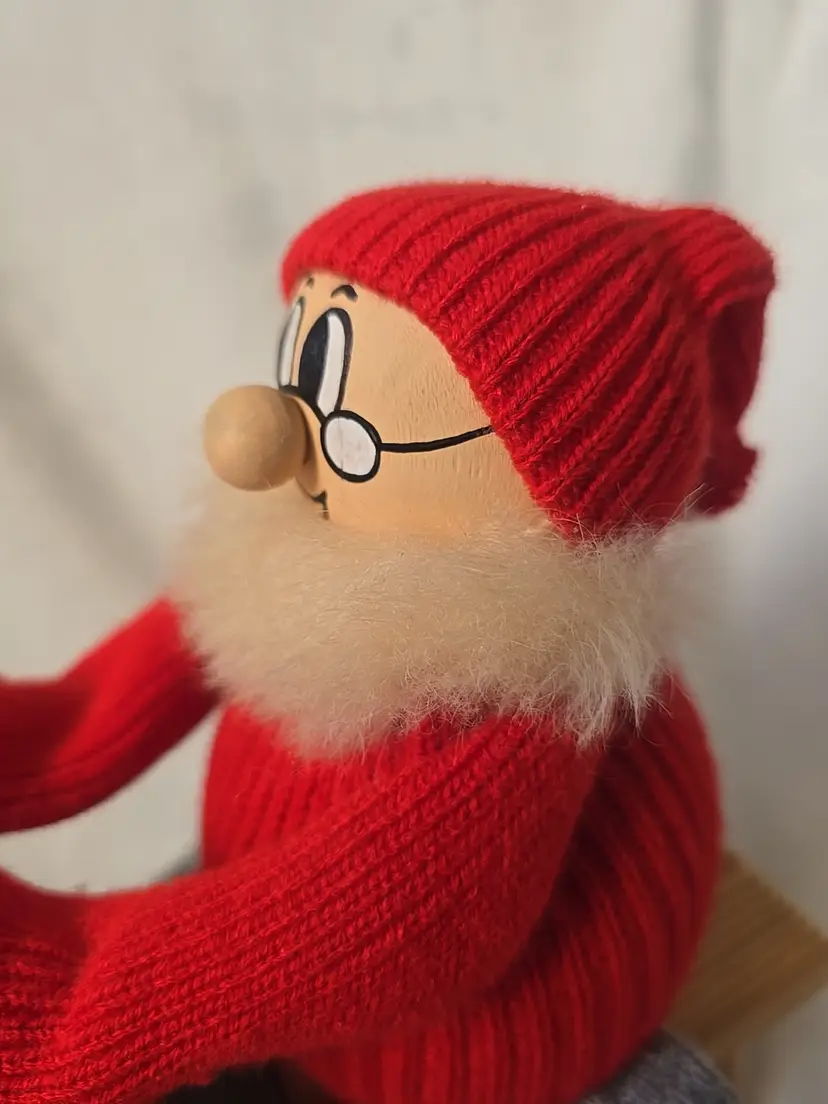 A delightful vintage Swedish Tomte (Santa Claus gnome) by Ljungströms, handcrafted in Sweden. This collectible figure shows Santa in a red knit sweater and cap, gray stockings, and wooden clogs, seated at a bench with a laptop. His arms are movable, so you can slightly adjust his pose at the keyboard.