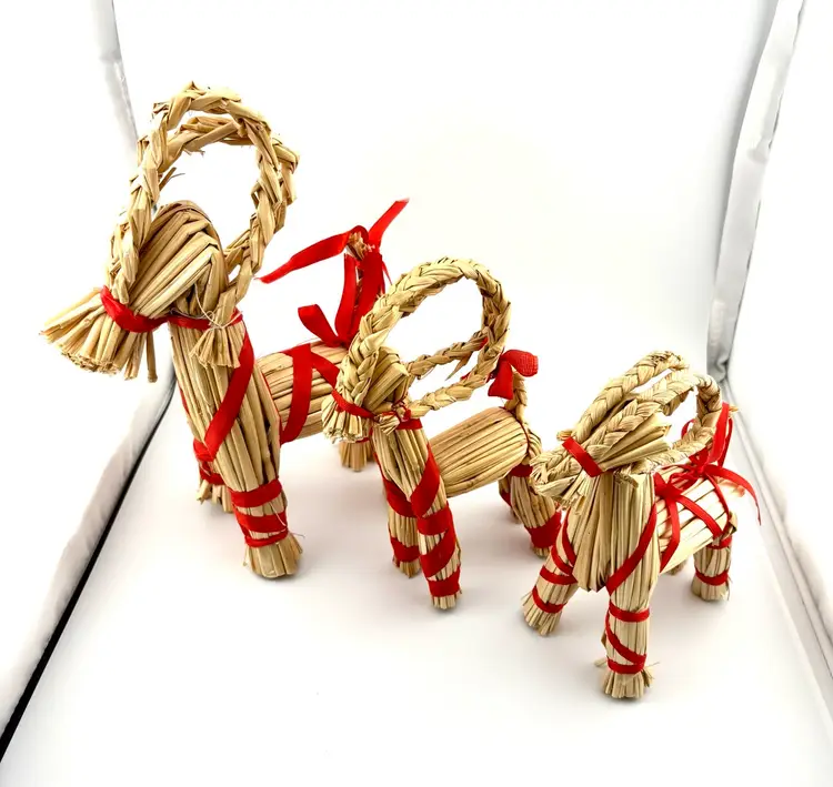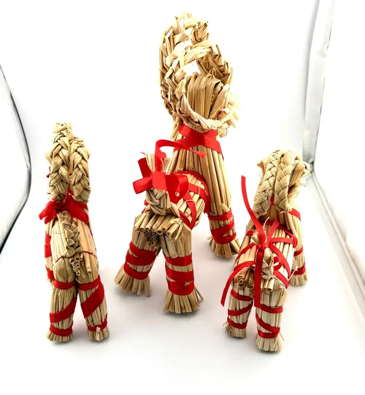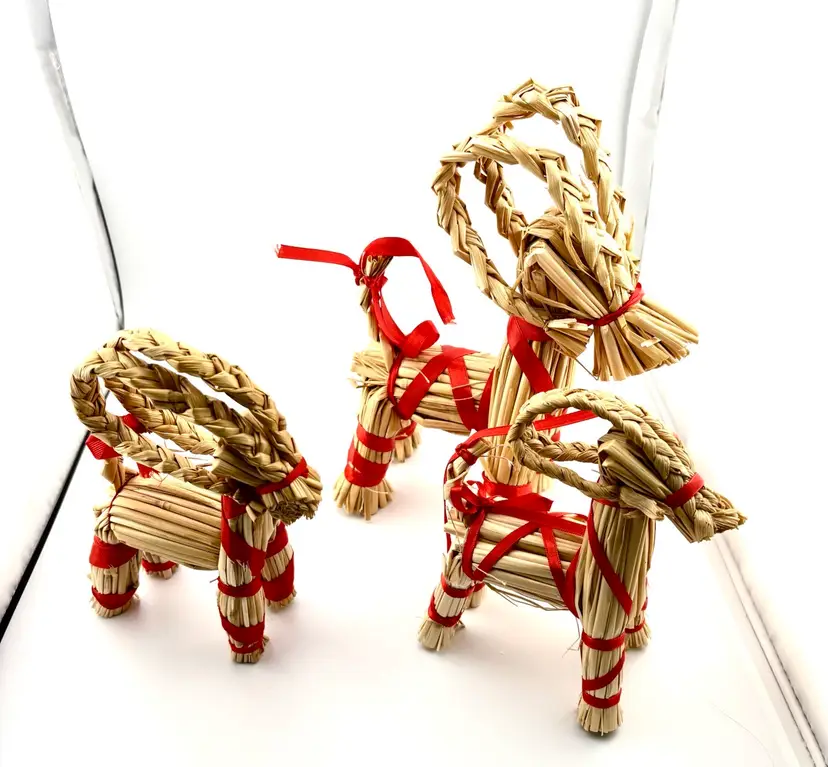 The largest on measures 10” tall x 7” long x 4” wide the two smaller ones are approximately 6.25” tall x 5” long x2” wide. Some of the red ribbons are not in place and the horns do not look even.