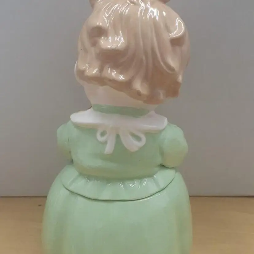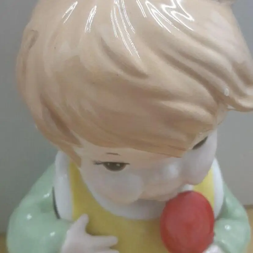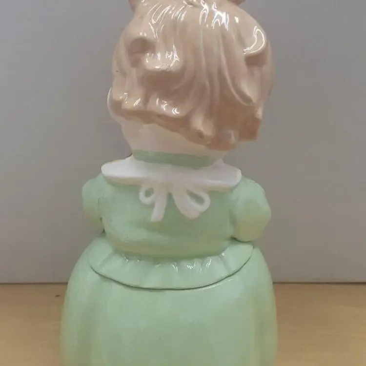 This vintage treat/cookie jar is just adorable. Lollipop Baby Face. Loss of some glaze on hair tips and small chip on inner rim not noticeable with lid on. Really cute piece.