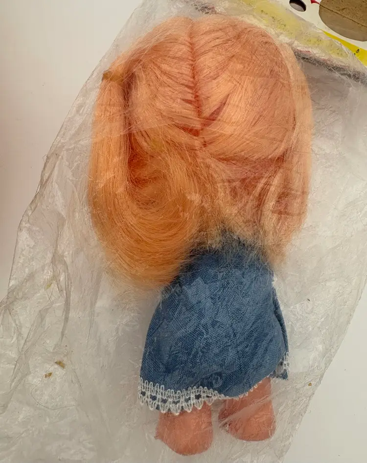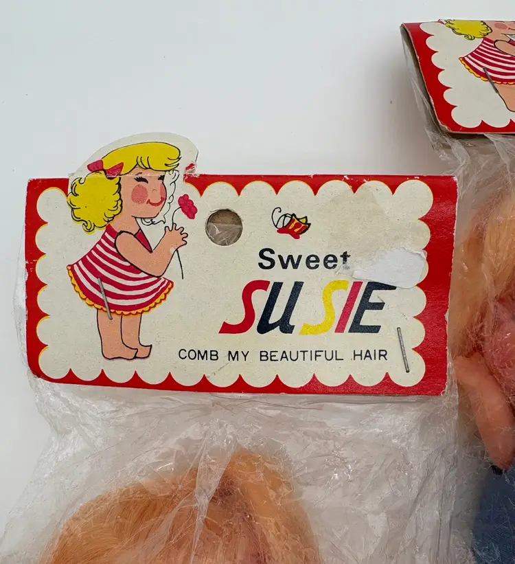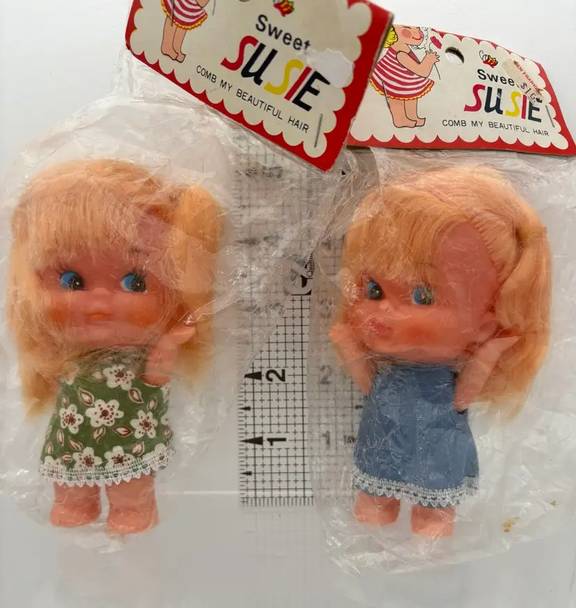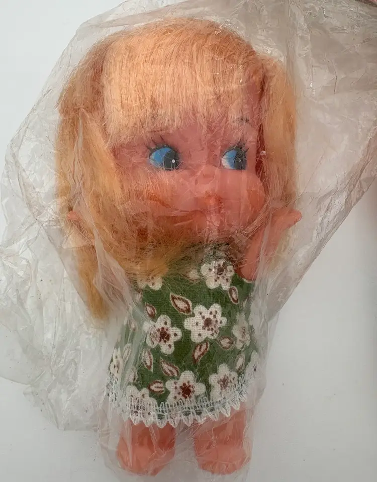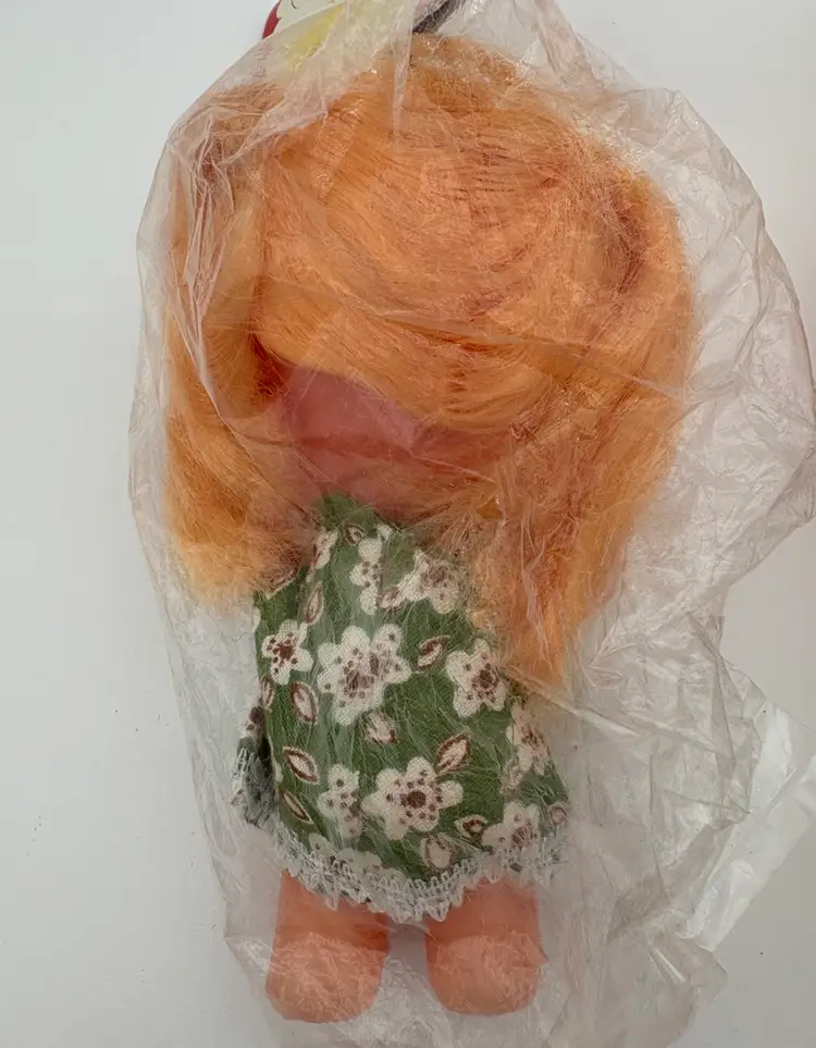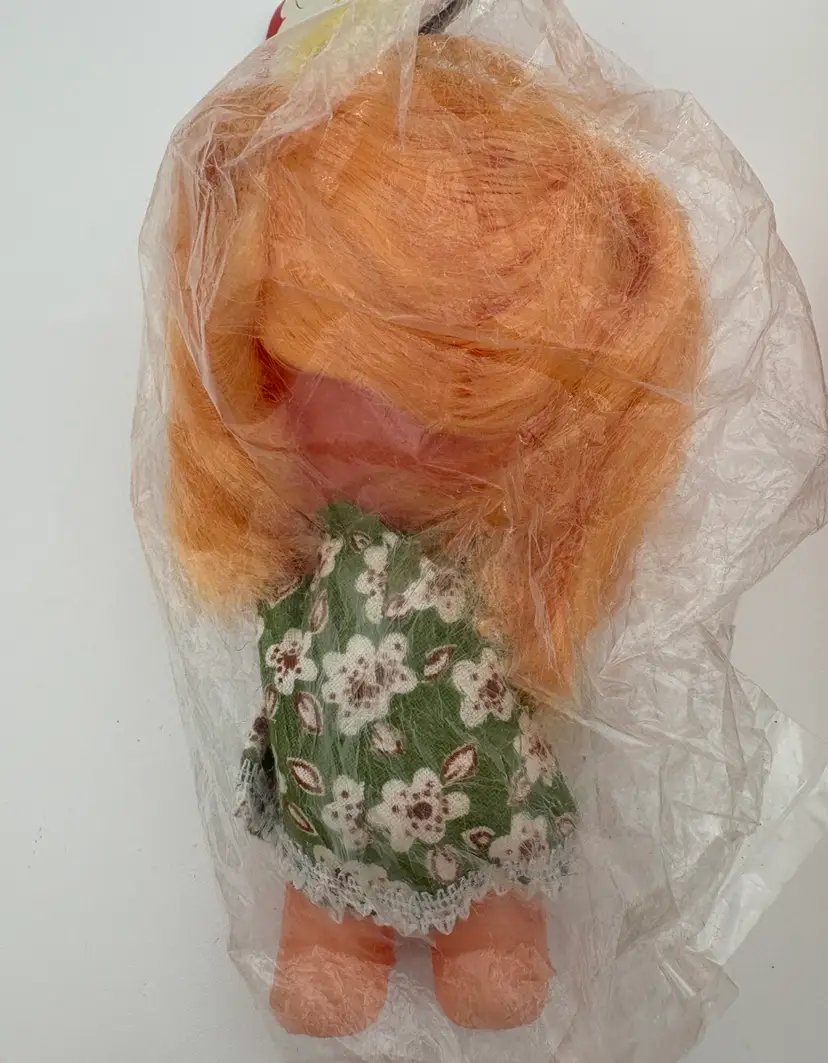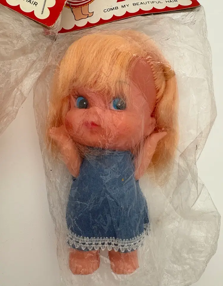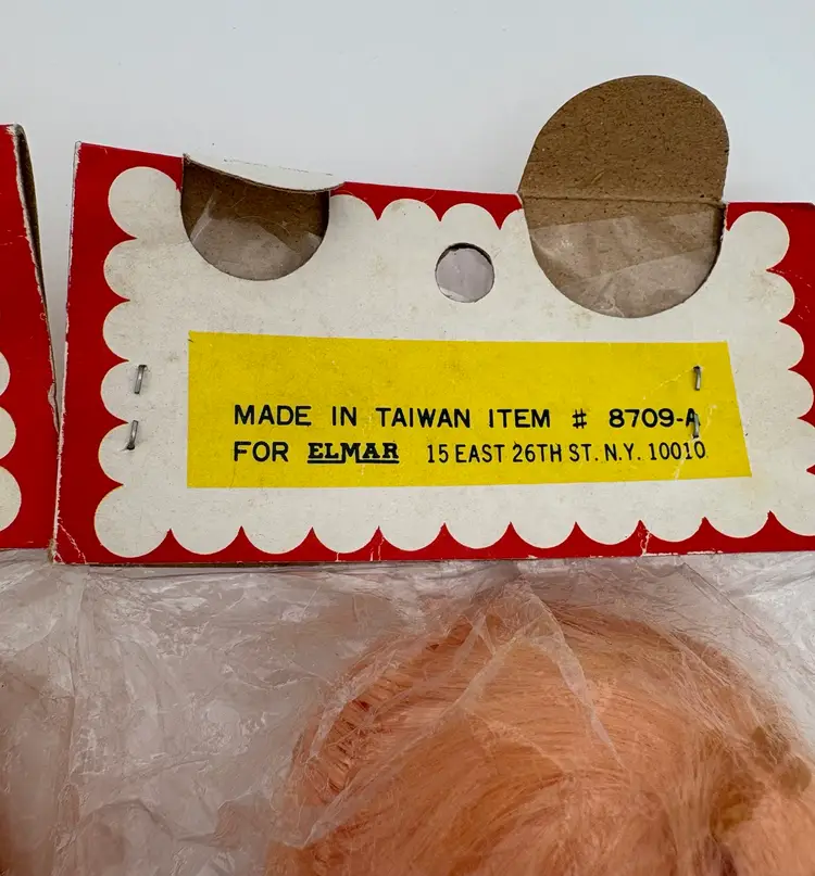 Lot of two dolls, still in original packaging. Pig-tailed blonde, blue-eyed dolls. Approximately 4 1/2”H. Arms and head are moveable. One doll wearing a green floral print dress, the other solid blue, both with lace trims. Rubber heads with harder plastic bodies. Made in Taiwan for Elmar in NY. Cute graphics!