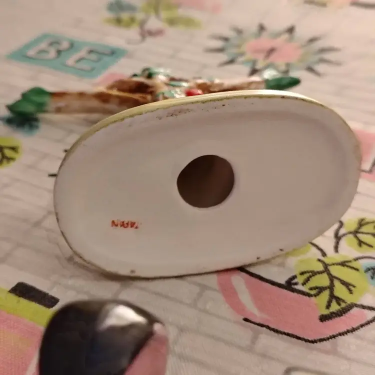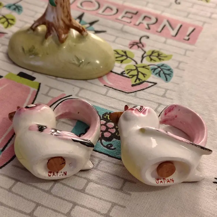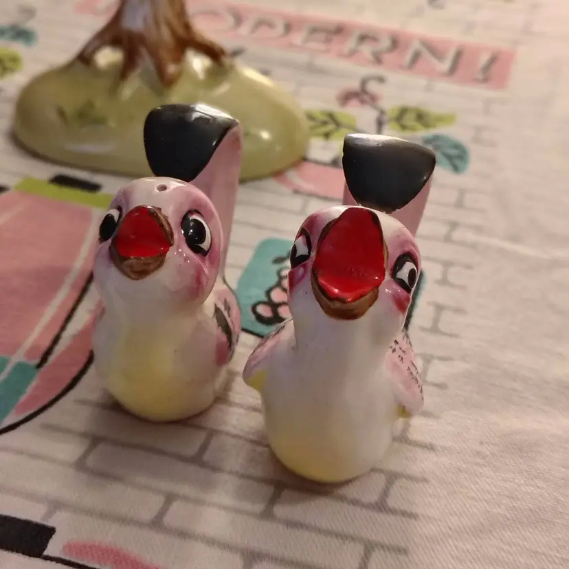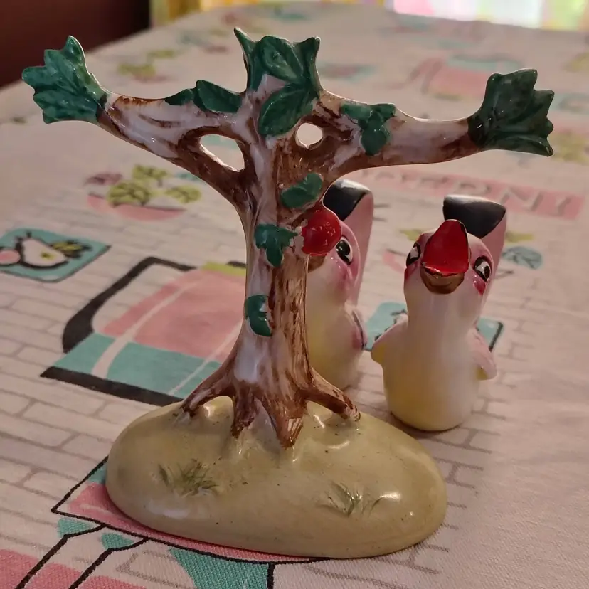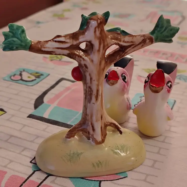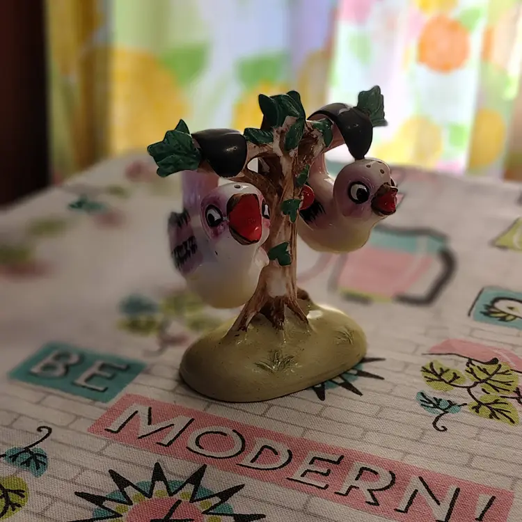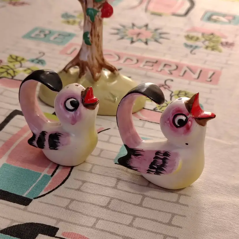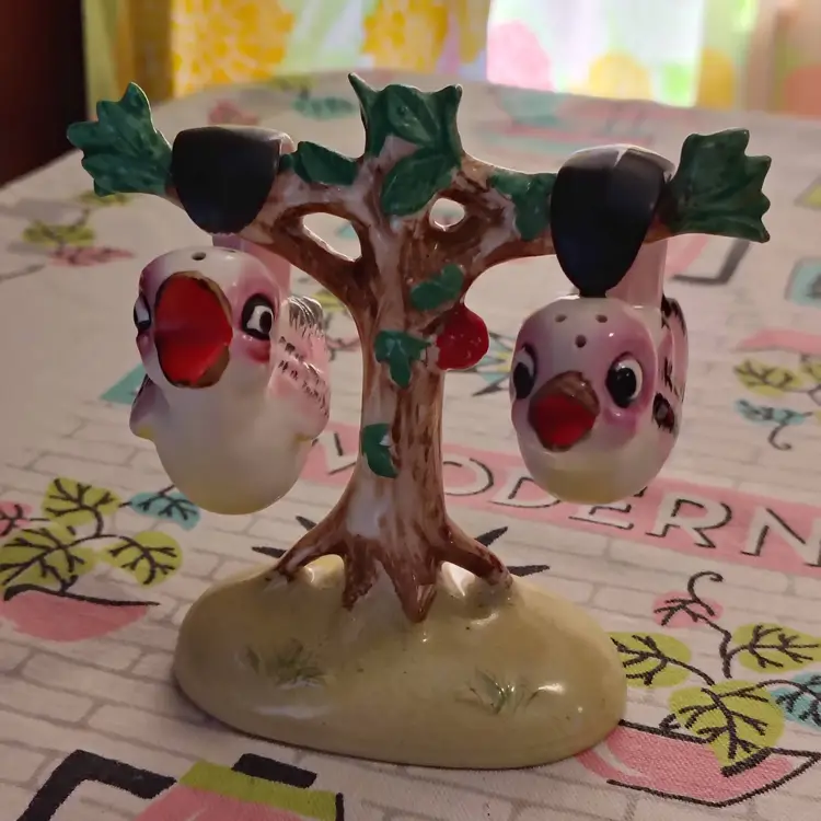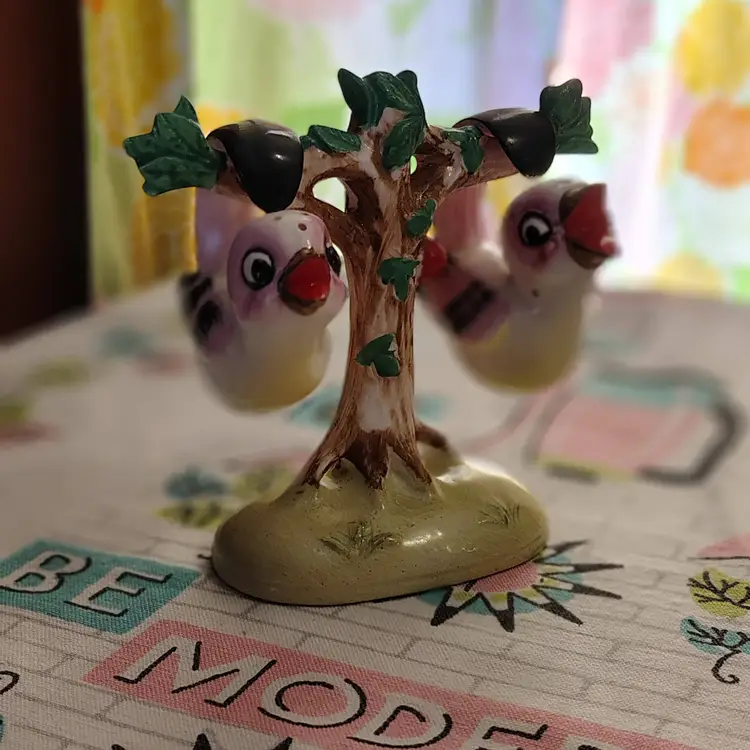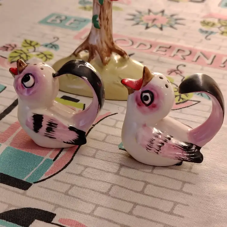 This is a vintage salt and pepper shaker set, shaped like birds in a tree! Made in Japan during the 1960s, these sweet little ceramic birdies have extraordinary tails. They're curved all the way into a loop, allowing them to swing, and sing, from the branches of a very handy tree caddy. I bet they can't wait to... hang out... in your kitchen! Condition: This set is in Excellent shape! No chips, cracks, or any other damage. Both shakers still have their original cork stoppers. Size: The birds measure about 1" across, are 2" long, and a little over 2" tall. Their tree hanger is 3¼" long, 2" wide, and stands just over 4" tall.