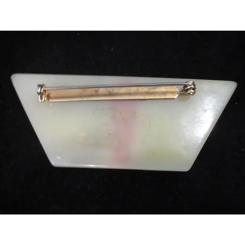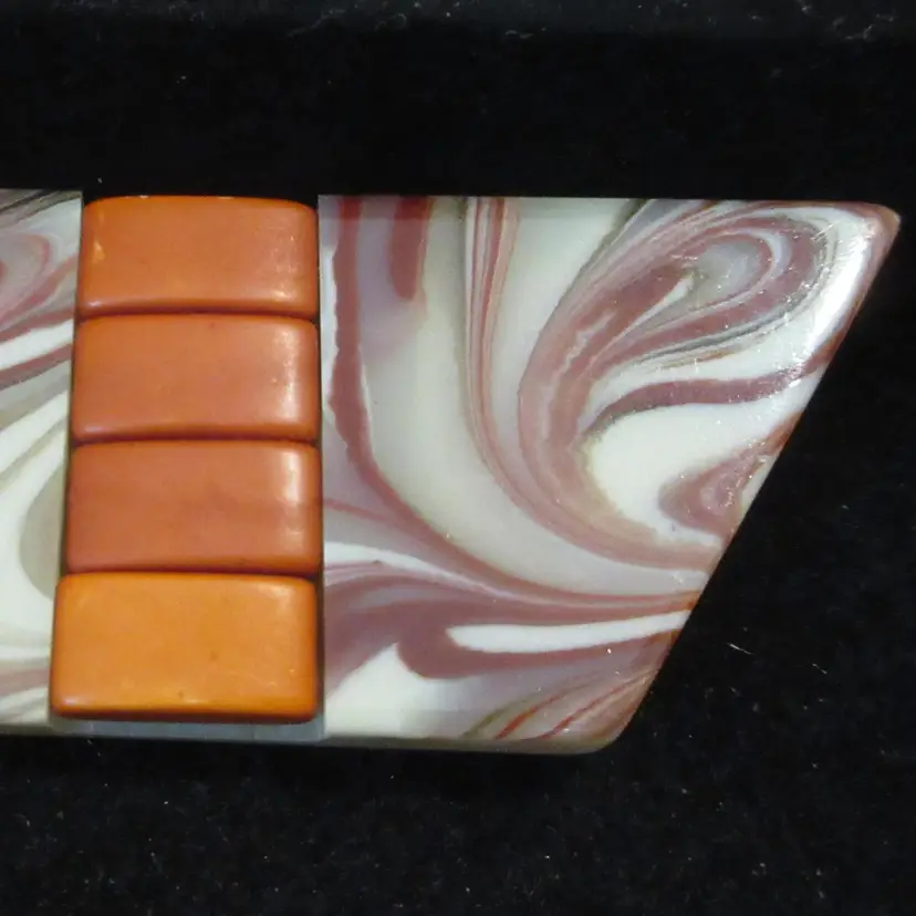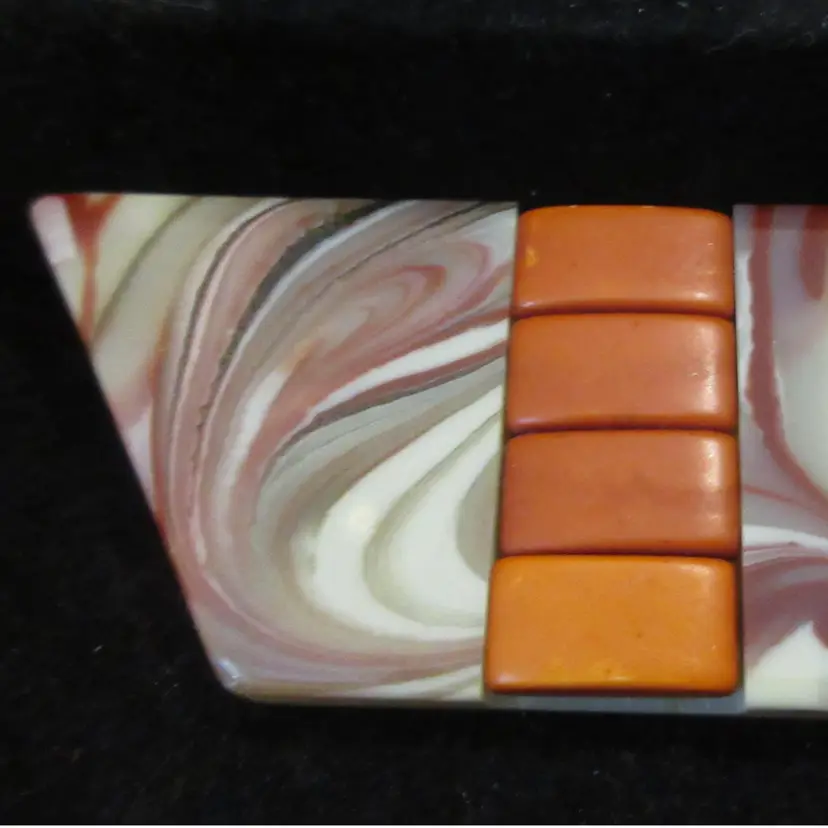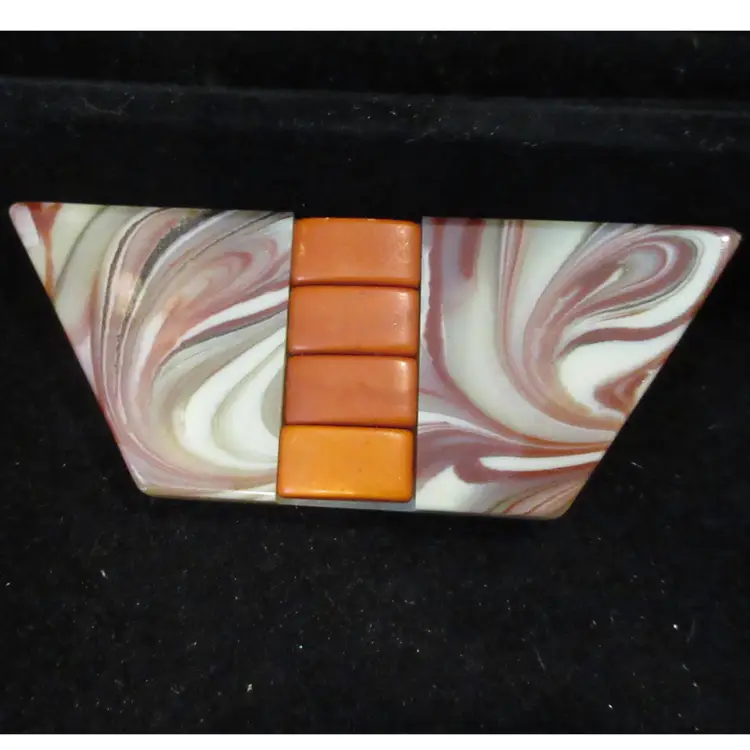 This is a GLORIOUS vintage 1980s lucite brooch. The brooch is made of 2 flat pieces of lucite, one is slightly off-white and the other is off-white with swirls of brown, red and black. Embedded in the center of the brooch are 4 domes rectangular pieces of rust-colored lucite. The overall effect is AMAZING. This piece is about 3.5 inches long and has a pin back with a sliding C closure.