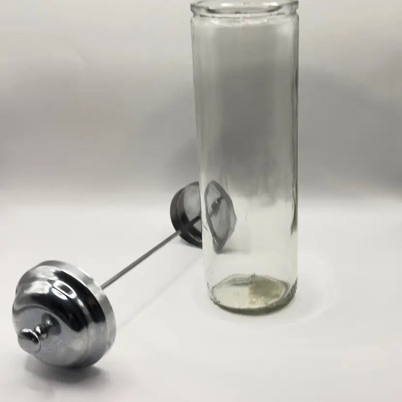 Add a nostalgic touch to your kitchen with this vintage barware glass swizzle sticks straw dispenser. Perfect for retro-themed decor or practical use, it features a classic design with a chrome lid. In excellent condition with no chips or cracks. Measures 10x2 inches. Weighs 1lb. 10oz.