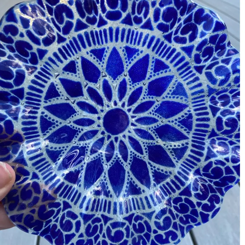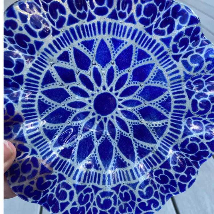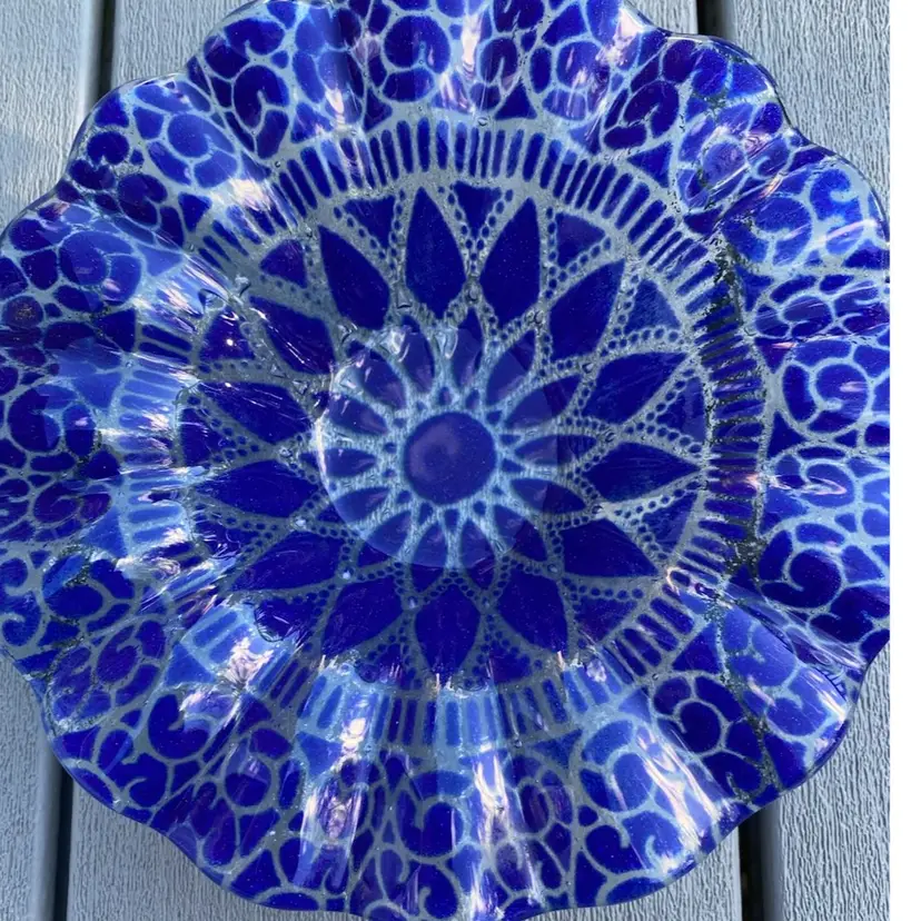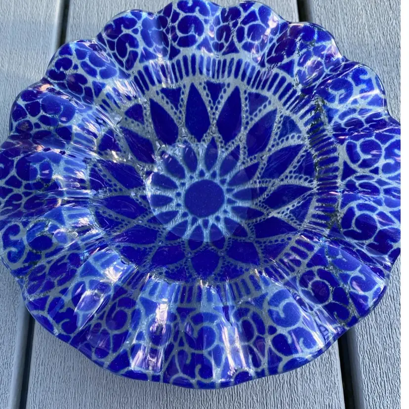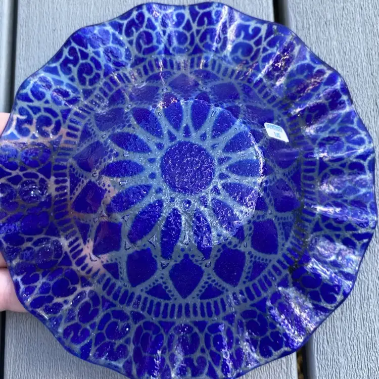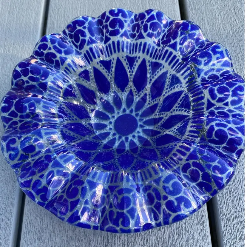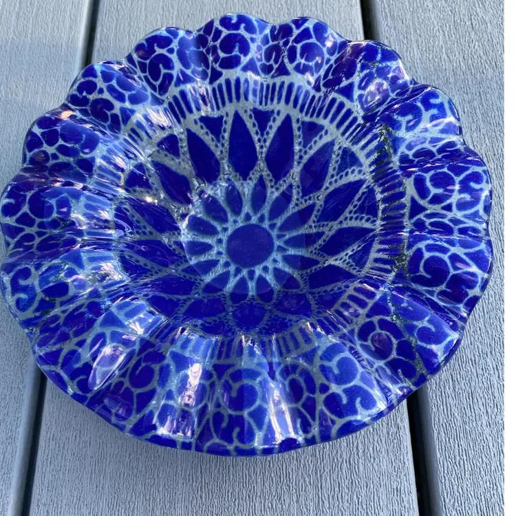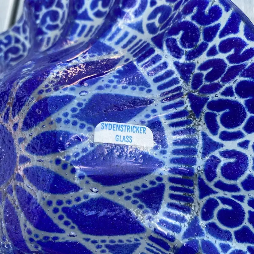 This VINTAGE SYDENSTRICKER FUSED BLUE GLASS BOWL is a captivating, handcrafted piece of art that brings together striking Embassy Blue hues with a dramatic cobalt fluted edge. Measuring just under 7” in diameter, this small bowl is perfect for serving snacks, holding trinkets, or as an elegant decorative accent. The rich color and unique edge design make it a beautiful addition to any home or collection.