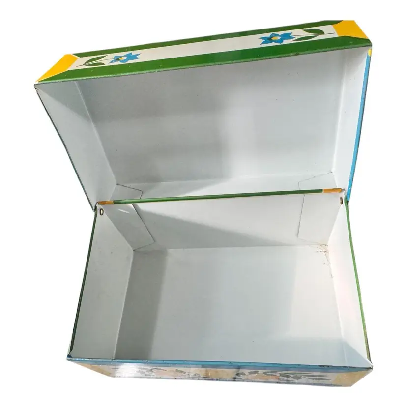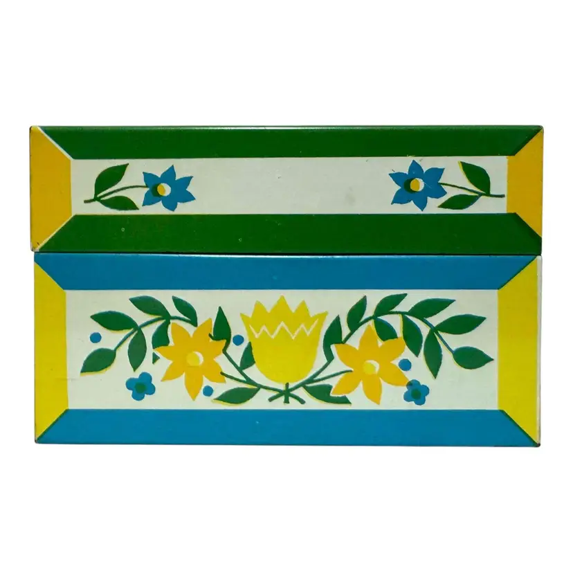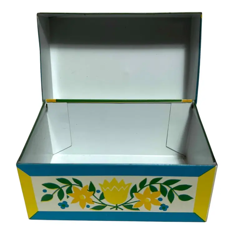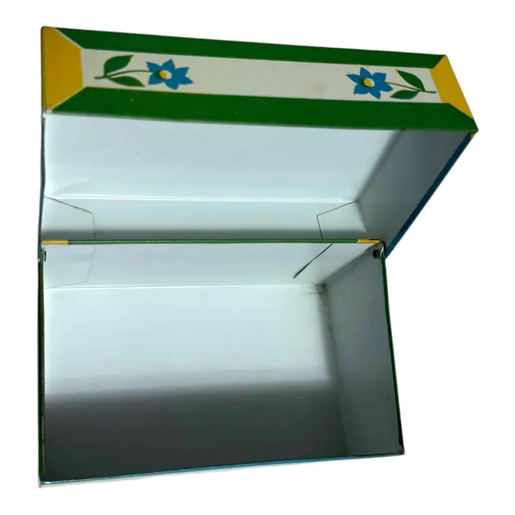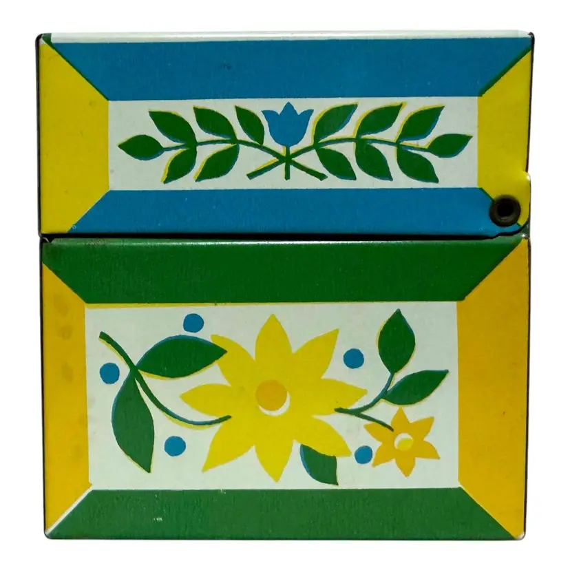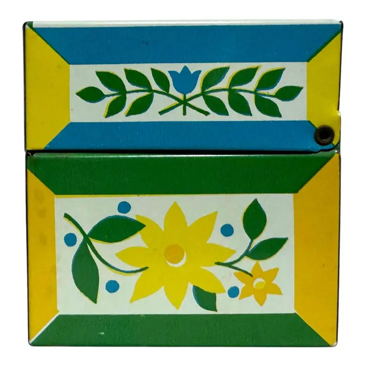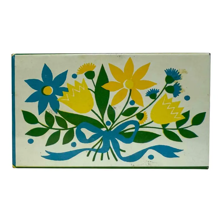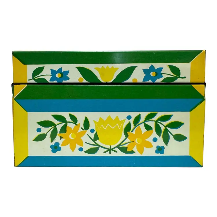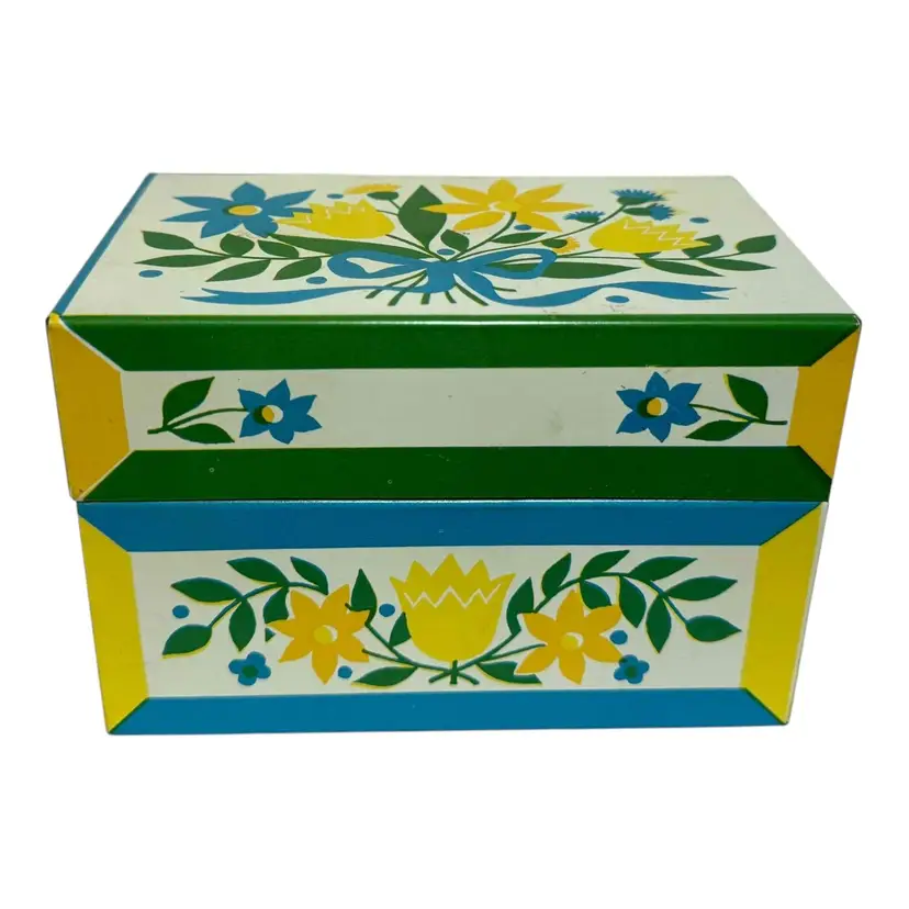 Vintage Recipe File Card Box Off White Metal With Yellow And Blue Flowers And Green Leaves One Vintage Pack Of Index Cards Included Made By The Syndicate Mfg Co 5.25x 3.25 x 3.5 Sticker Residue On Top Right Corner Some Scuffing To Top Edge Surface Bottom Scuffing See Photos