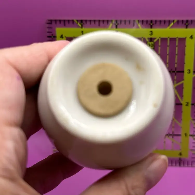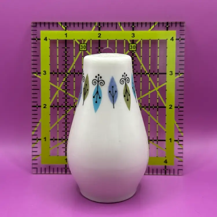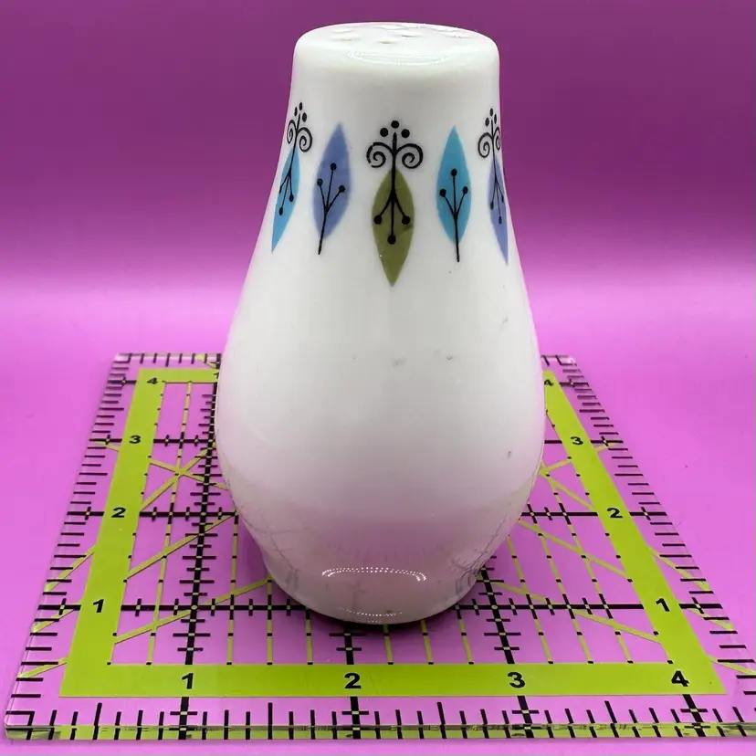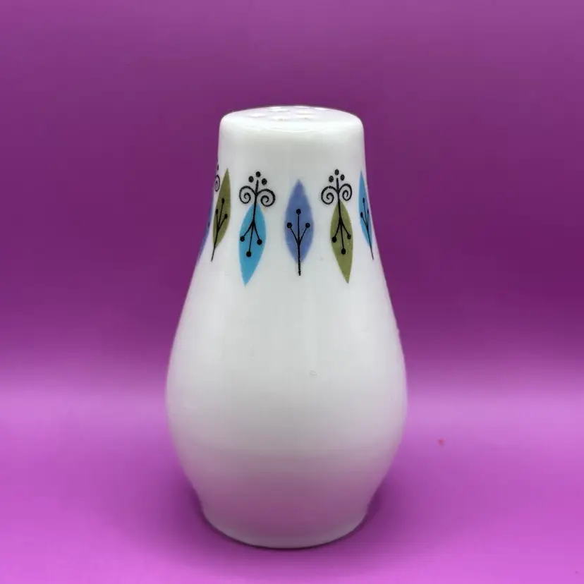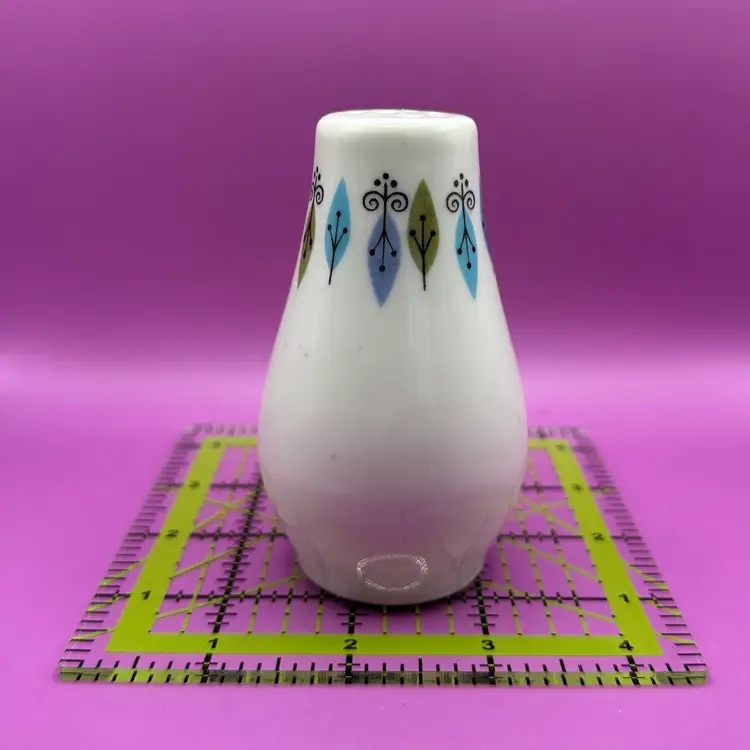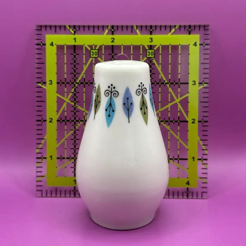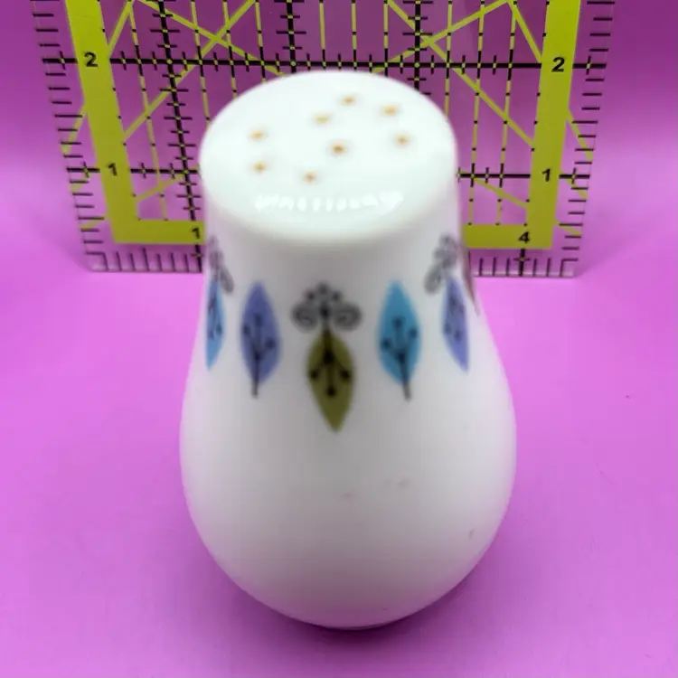 This pattern was produced by Syracuse Pottery from 1966-1970 it is listed as both ‘Nordic’ and ‘Carefree True Nordic’ No chips cracks or issues for this single salt shaker. Stopper included. Would make a great display piece for shorter hat pins. So mod I can’t handle it!