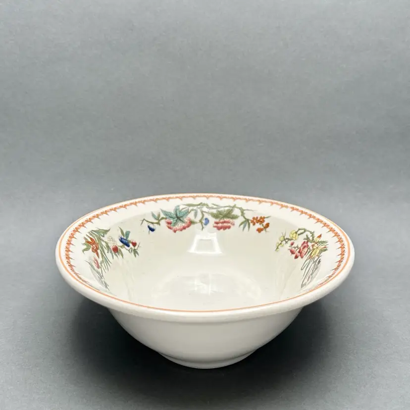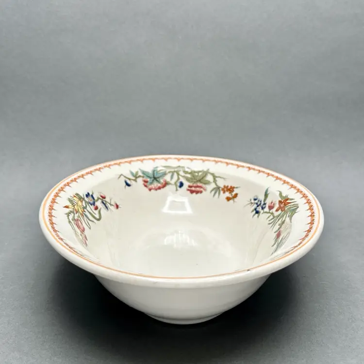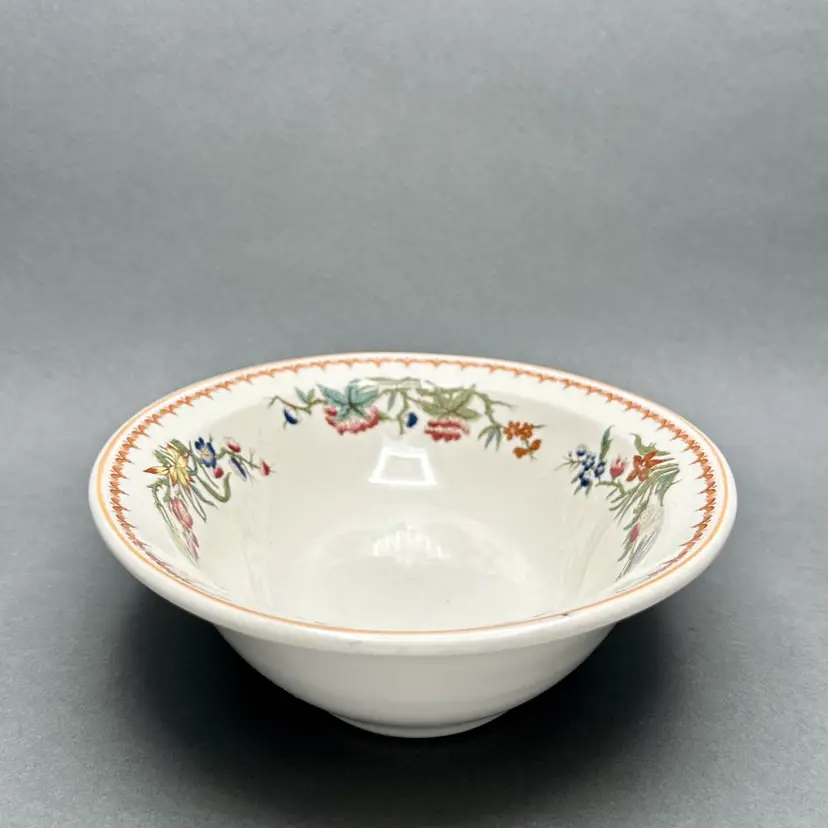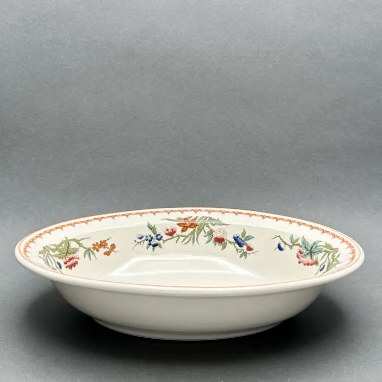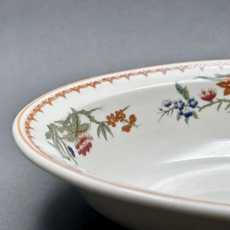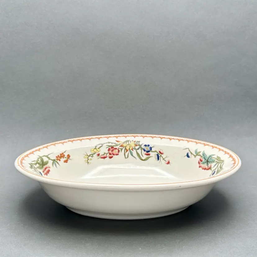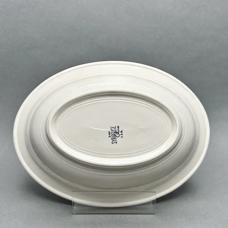 Vintage Syracuse China USA “Bombay” 3-HH beige ceramic vegetable serving bowl. It has an oval form with a floral border.
