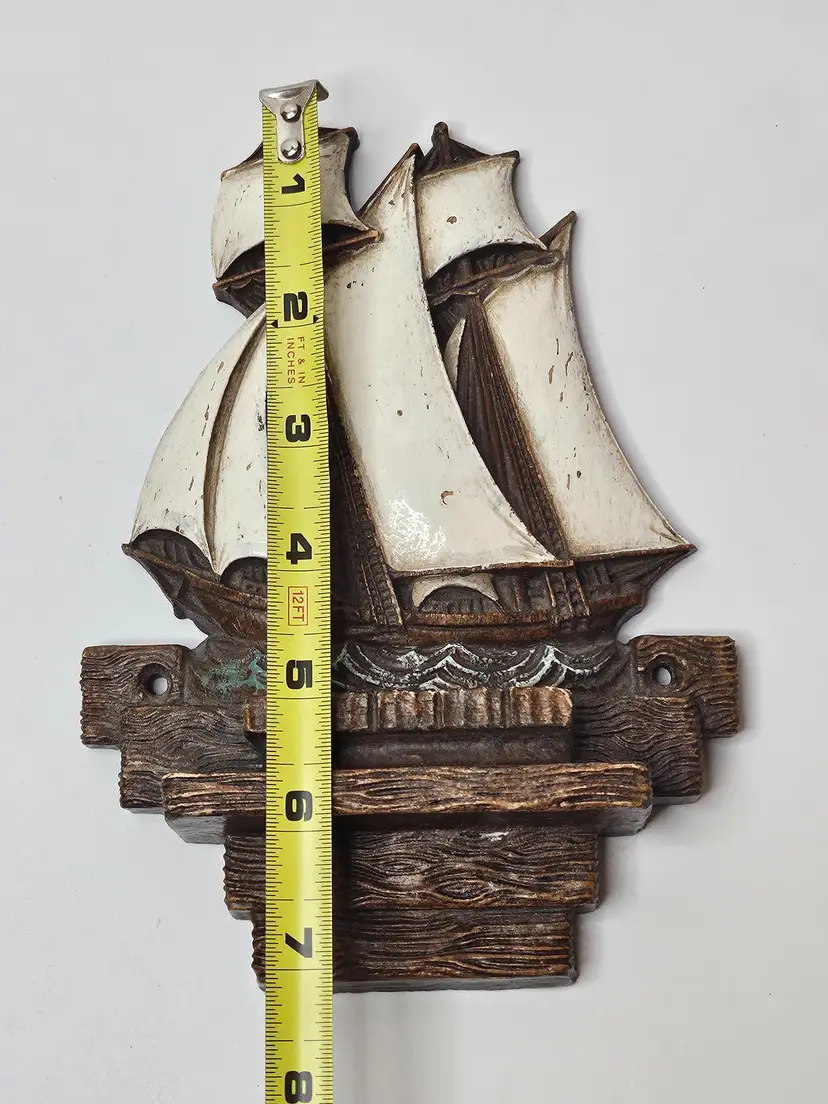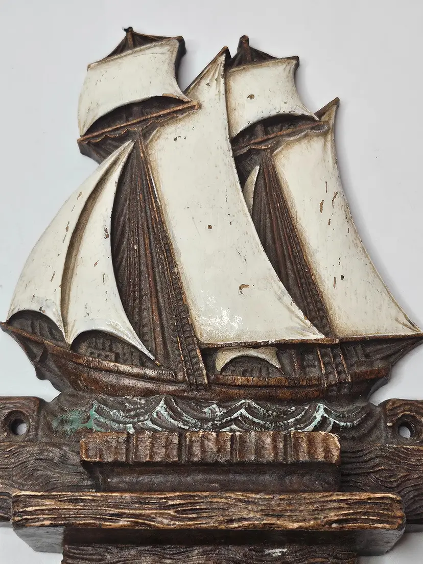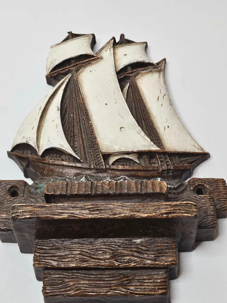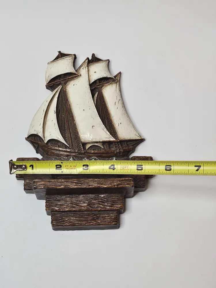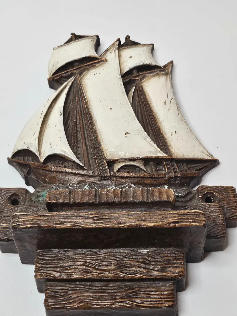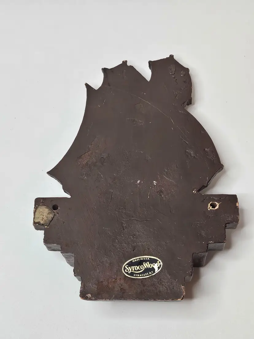 This vintage Syroco wood clipper ship is a beautiful addition to any nautical collection. The large sails and intricate details make it a unique and charming piece. The brown color of the ship adds to its authenticity and the United States origin makes it a special find for collectors. The clipper ship is an original piece and is made of high-quality wood material. It is perfect for display in any room or as a centerpiece.