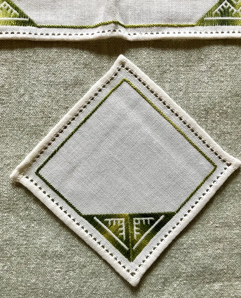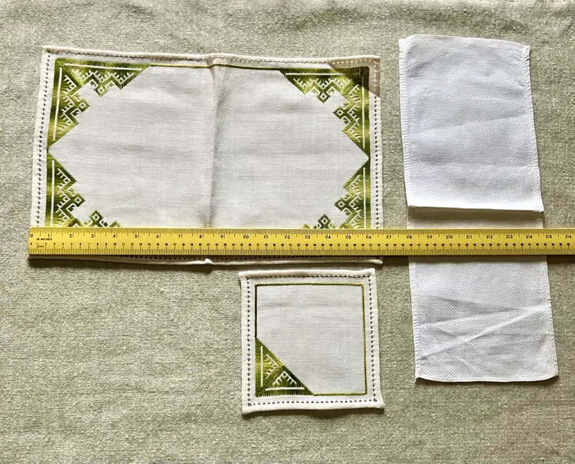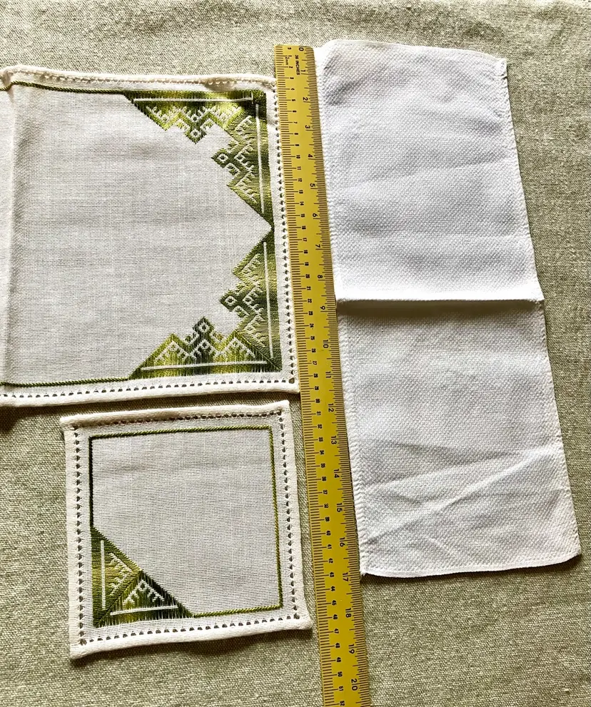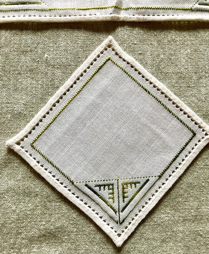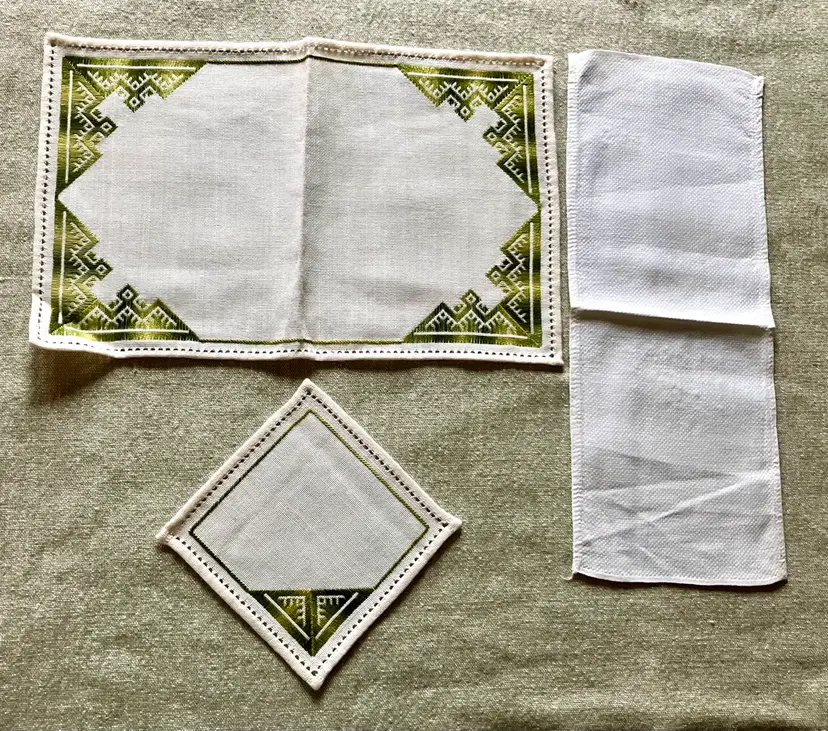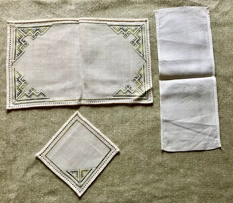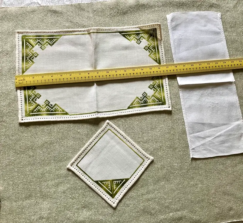 This is a vintage table setting consisting of three pieces made of linen blend material. The set includes rectangular and square shapes in medium and small sizes, with pin stitch type and white color with green accent stitching. The pattern is visible in the photos and the style is Art Deco with a theme of Art Deco or early MCM. The set is not antique and the country/region of manufacture is unknown. The table setting is handmade and the item width is less than 10 inches.