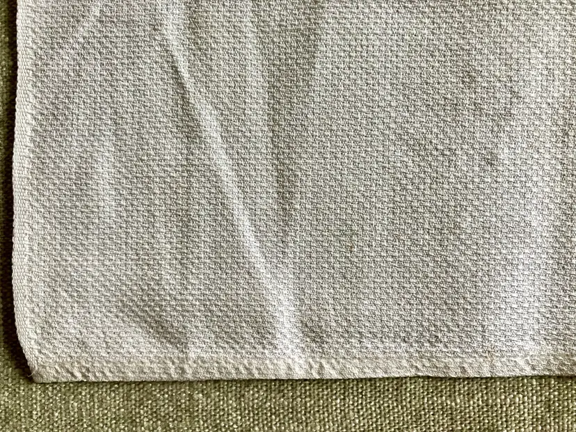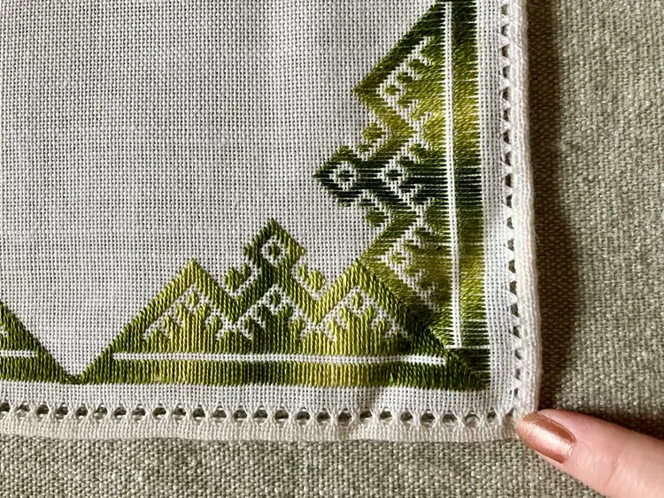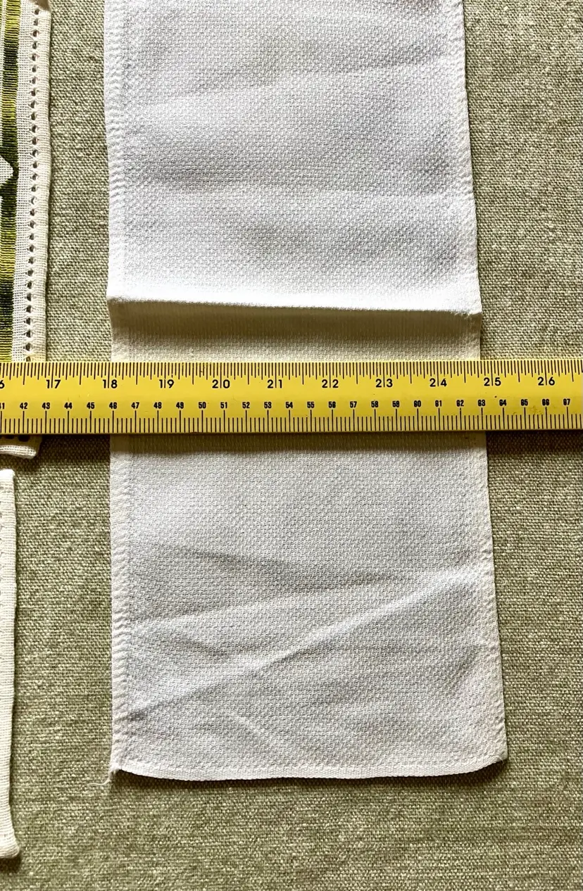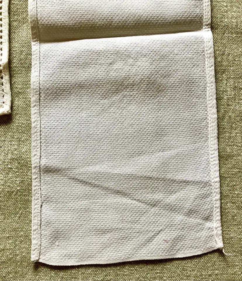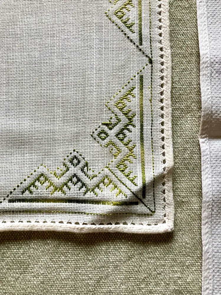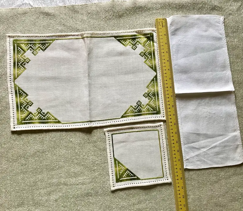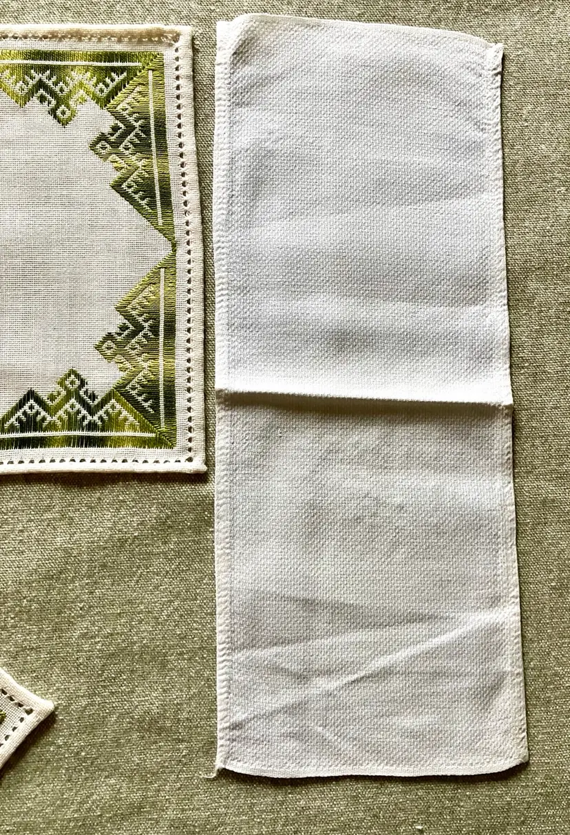 This is a vintage table setting consisting of three pieces made of linen blend material. The set includes rectangular and square shapes in medium and small sizes, with pin stitch type and white color with green accent stitching. The pattern is visible in the photos and the style is Art Deco with a theme of Art Deco or early MCM. The set is not antique and the country/region of manufacture is unknown. The table setting is handmade and the item width is less than 10 inches.