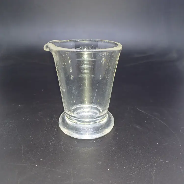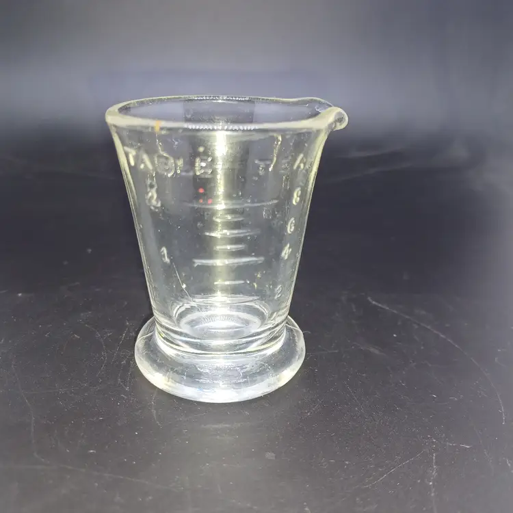 Vintage Clear Glass Measuring 2 Tablespoons / 8 Teaspoon Spout Footed The back is embossed with "TABLE and TEA" Spoon marks. The top of the glass has a lip for pouring and the base is unmarked .The dose glass measures 2 1/4" high x 1 3/4" wide and is in good condition with NO chips, cracks or stains. Please see all pictures as they're the best description all items from the smoke-free home with pets experienced fragile shipper