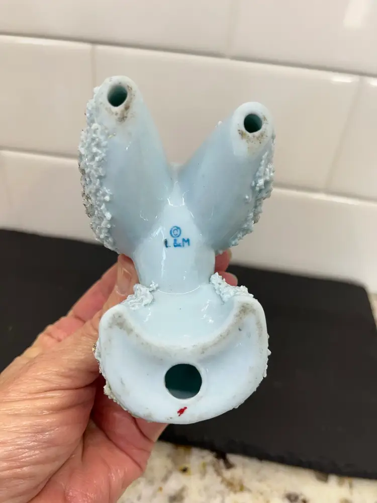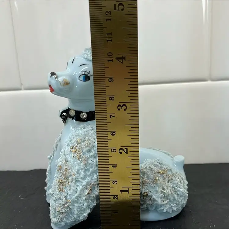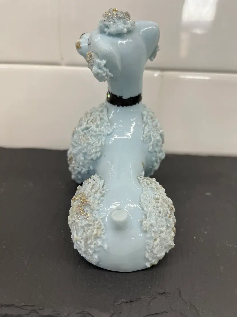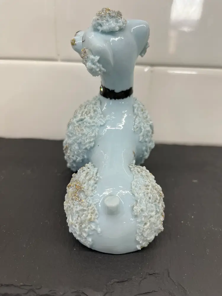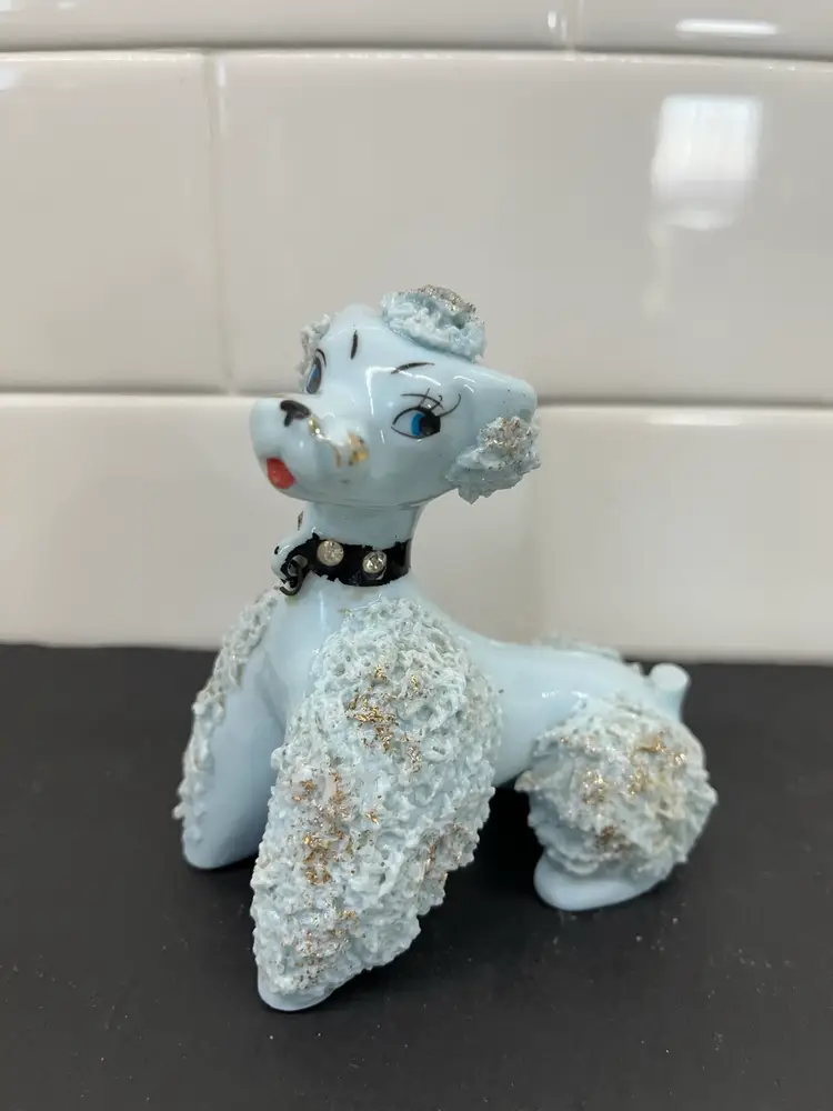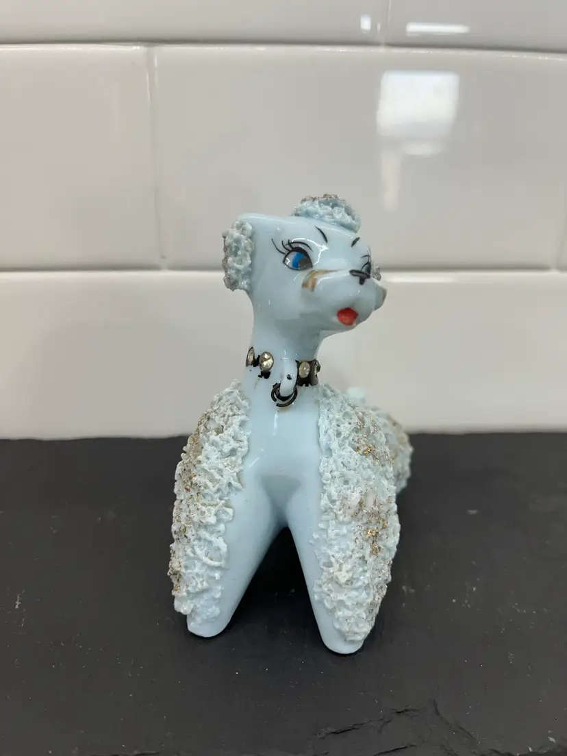 Vintage L & M light blue curly hair poodle. 4.25” tall. Porcelain. No tail. Chain is missing. Still cute!