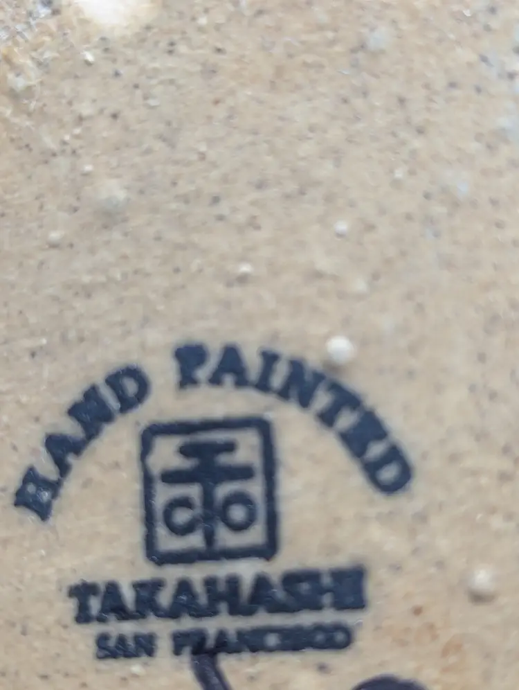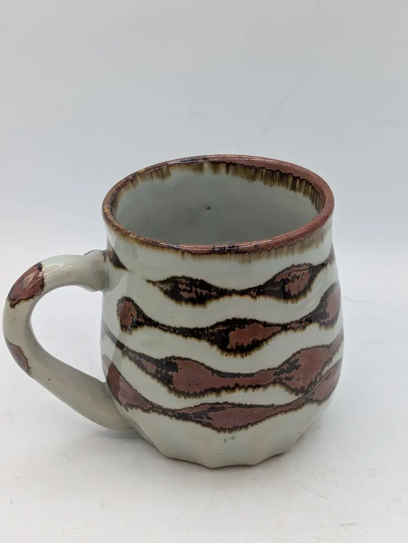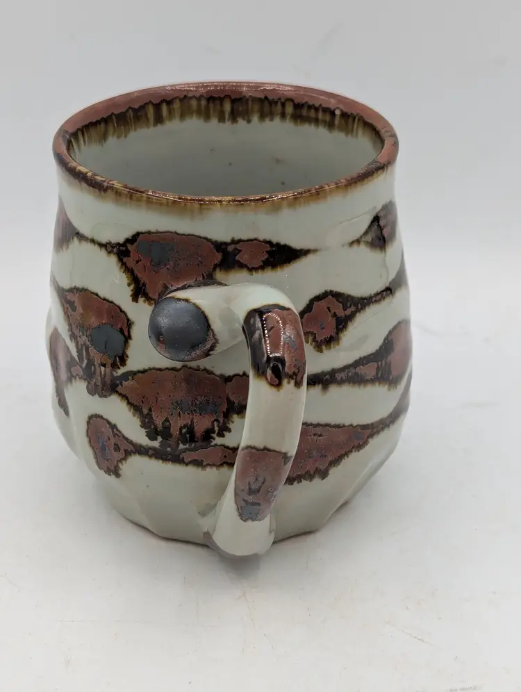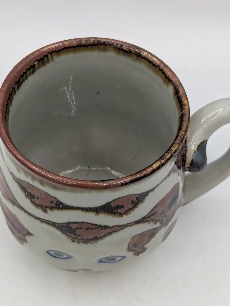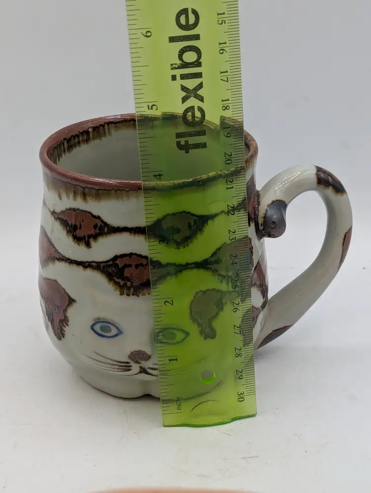 Fun vintage Takahashi Cat Mug with a Tail Handle. A unique stoneware mug perfect for your favorite cat lover! Hand painted with a grey, brown, and blue design. So cute!