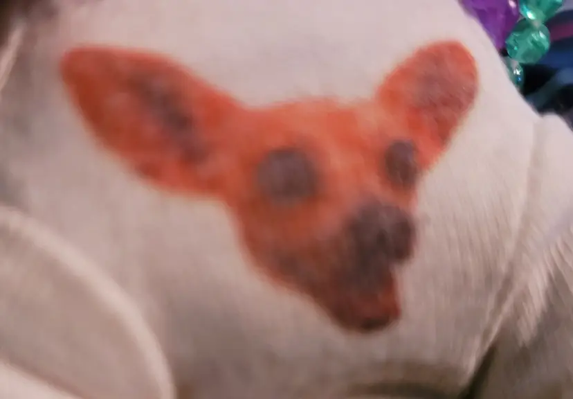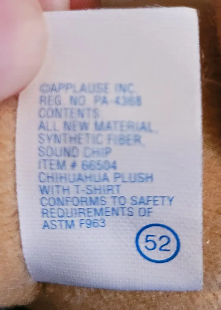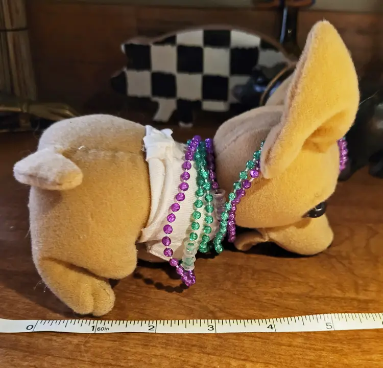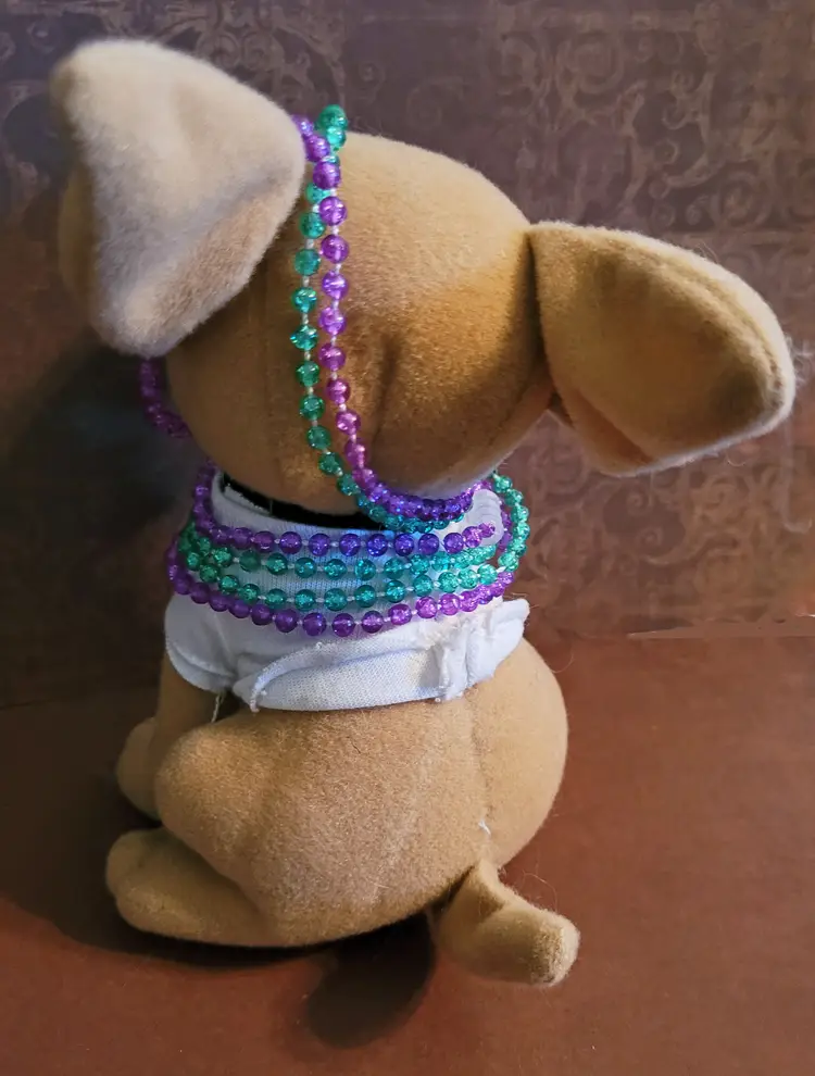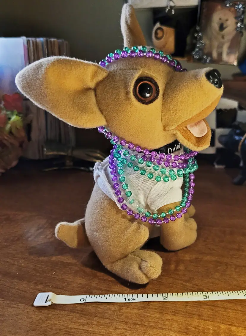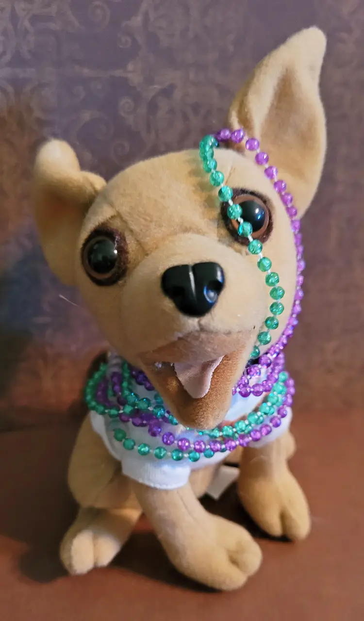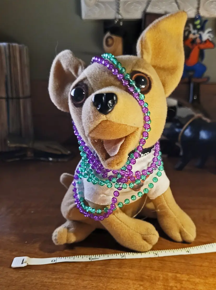 'Vintage Yo Quiero Taco Bell' Plush Sitting Chihuahua Dog with Shirt c. 1980s. Applause Made in China. Note: dog will come with the pictured mardi-gras beads and the speaker works - says 'Yo Quiero Taco Bell." Approx. 4x6x3