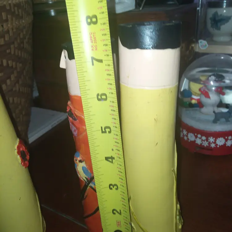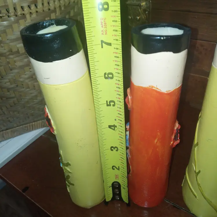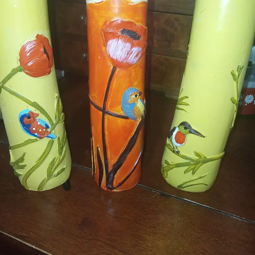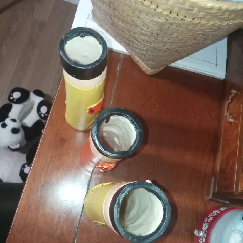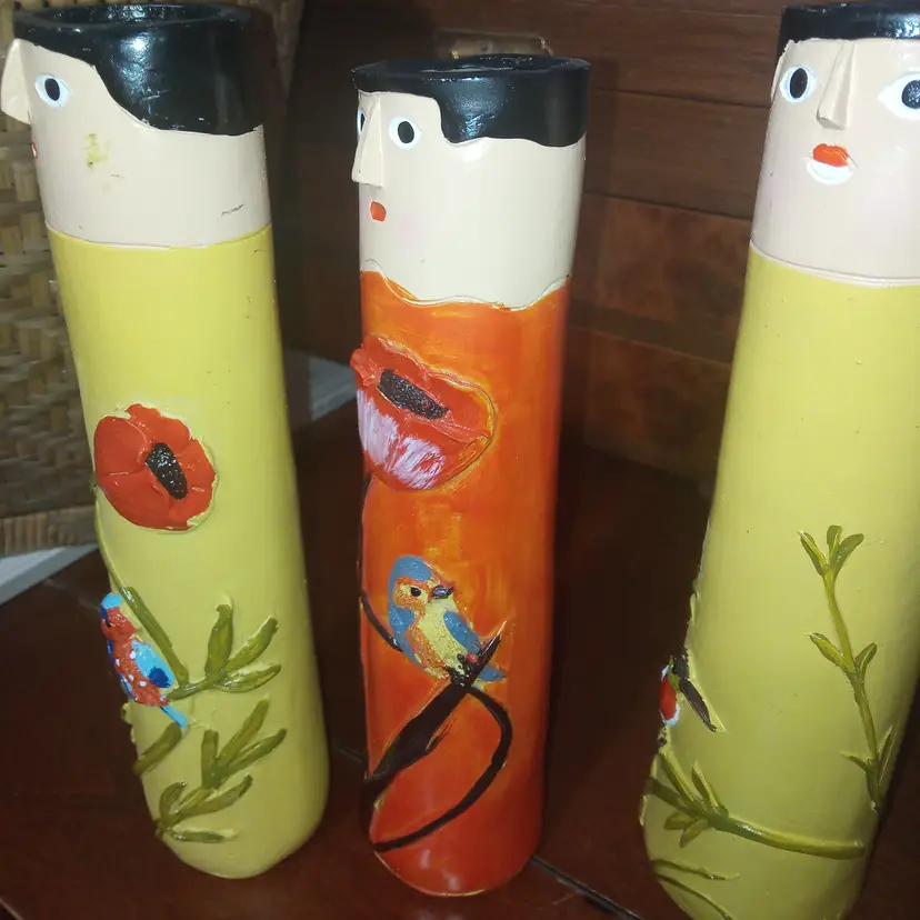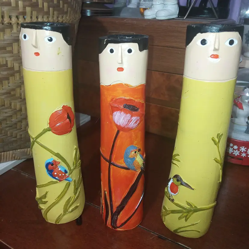 Vintage Tall Vases Kokeshi Doll Style Set 3 Hand painted 3D . Made in Japan, possibly made of resin or pressed wood. Good condition but one has chip on base.