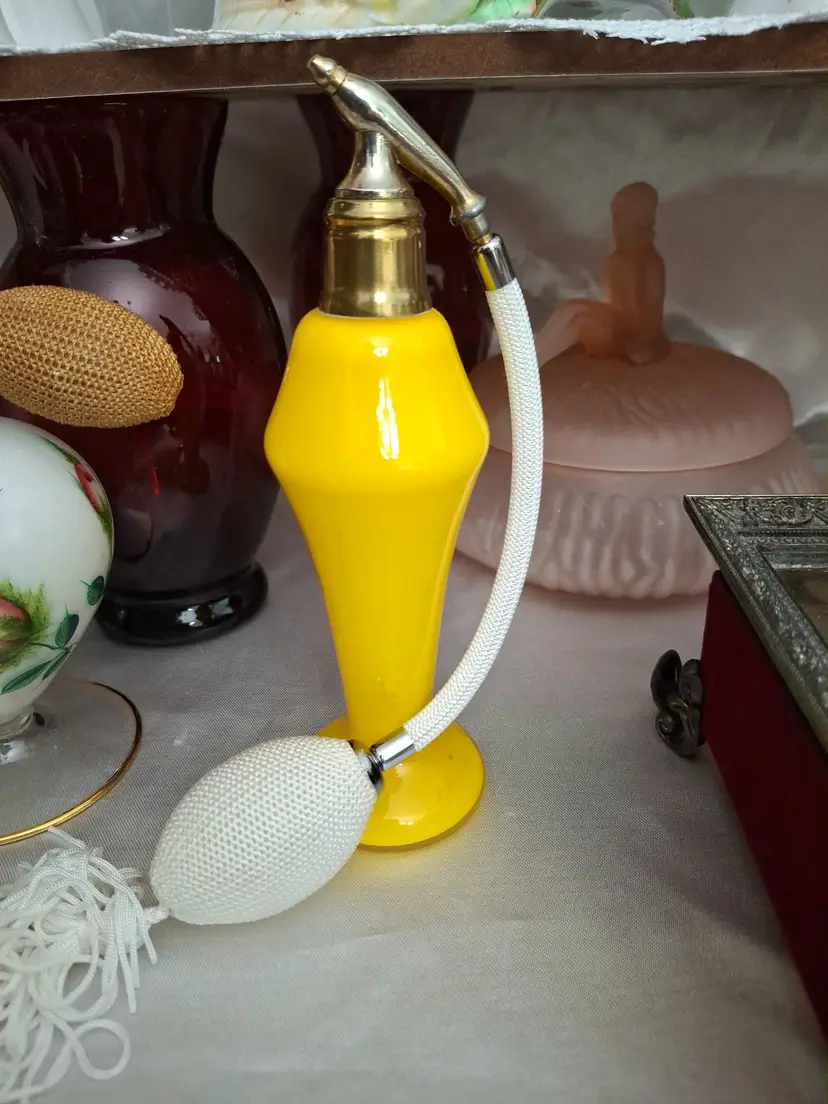 Vintage bright yellow opaline-style glass perfume atomizer with tall sculptural Art Deco-inspired form and working bulb. Bold statement vanity piece.