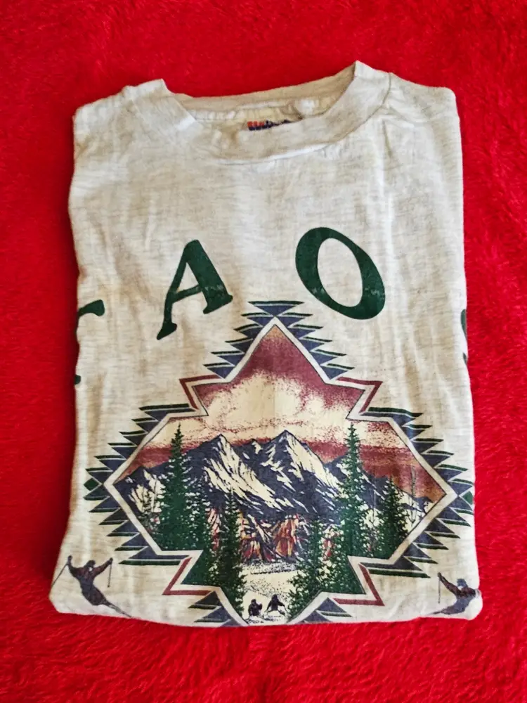 The Vintage Taos New Mexico Size Large Hanes Beefy-T T-Shirt is a classic men's shirt with a graphic print design featuring the iconic Taos landscape. Made from a comfortable cotton blend material, this short sleeve shirt is machine washable for easy care. Perfect for all seasons, this regular fit shirt is a timeless piece for your wardrobe, showcasing the authentic Hanes Beefy-T quality and brand. Made in the United States, this vintage T-shirt is a unique addition to any collection, representing a piece of Americana style and heritage.