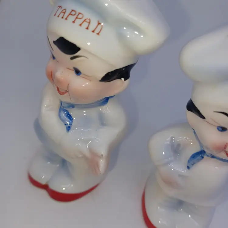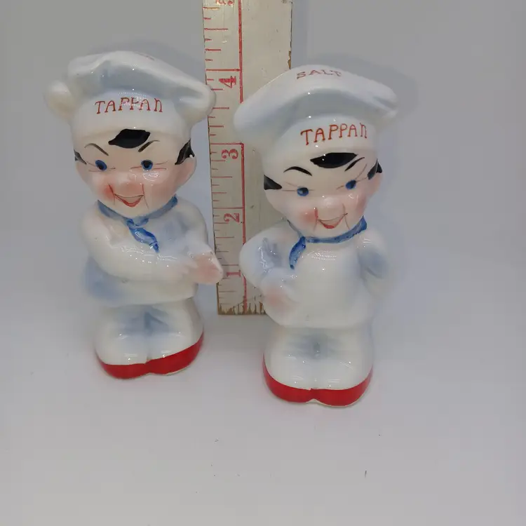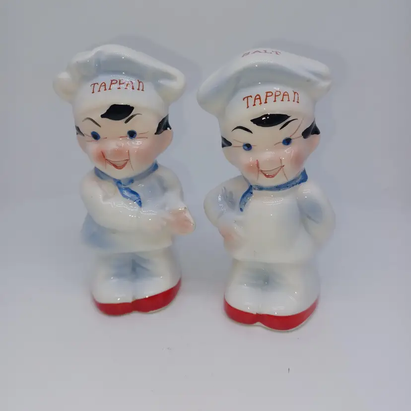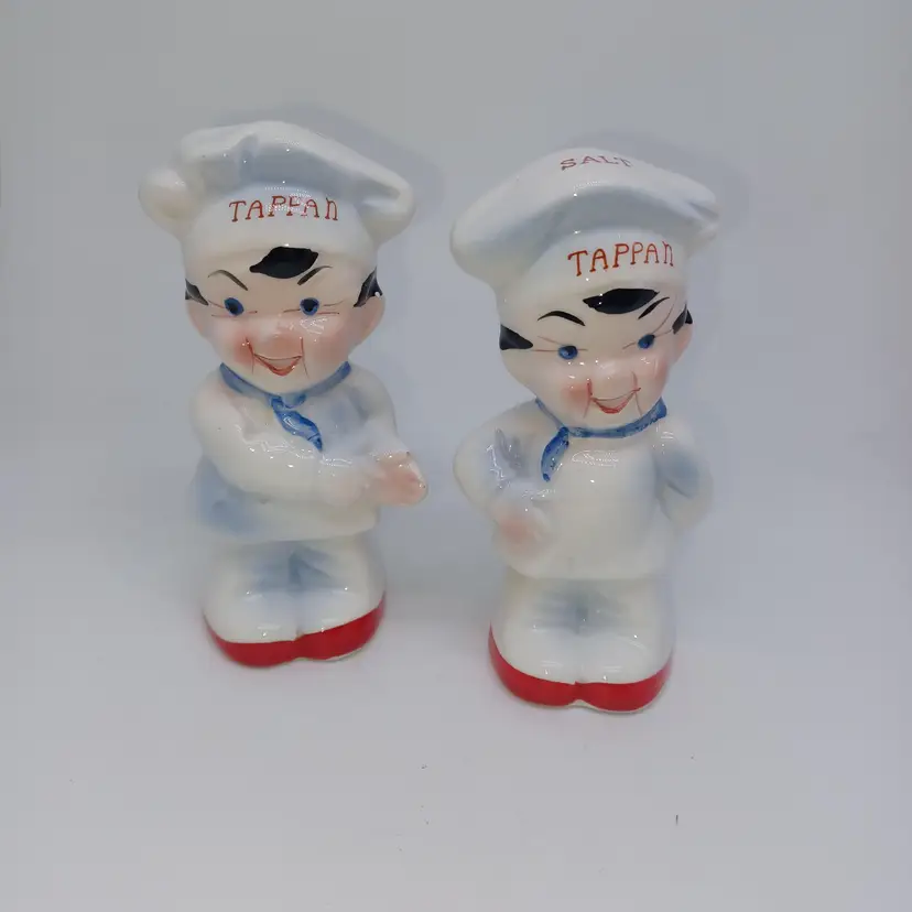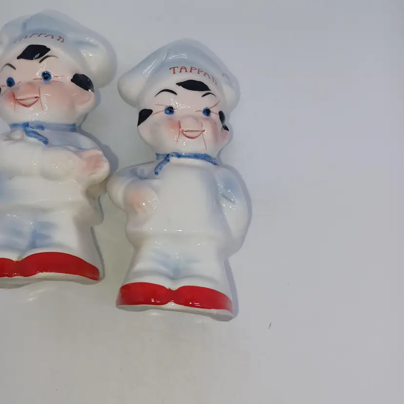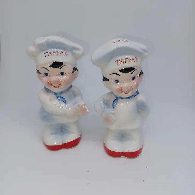 Charming pair of vintage Tappan chef salt and pepper shakers, perfect for adding a touch of nostalgia to your kitchen. These mid-century collectibles feature the iconic Tappan logo and are sure to remind you of yesteryear's home cooking. In good vintage condition with some signs of wear consistent with age. Please see all photos for details. All items from a smoke-free home with pets, experienced fragile shipper.