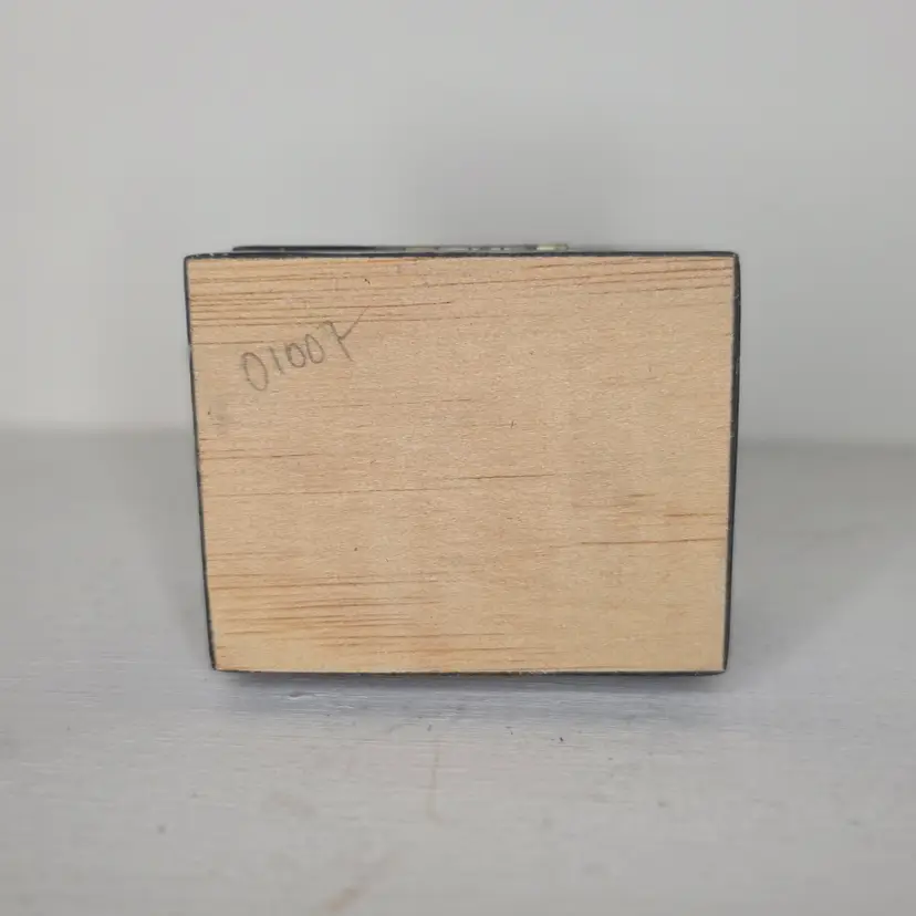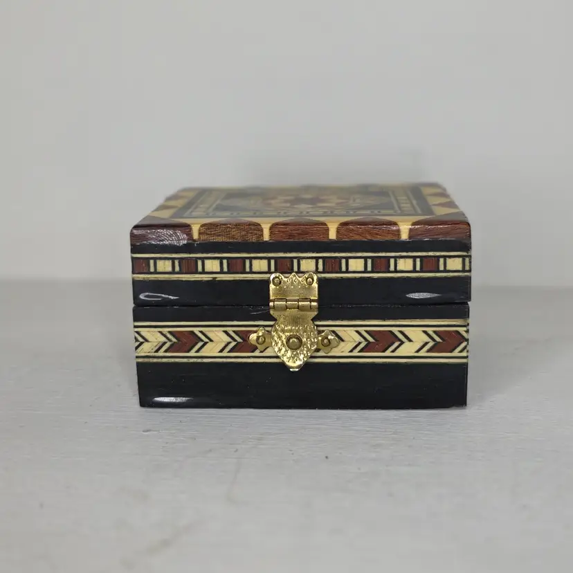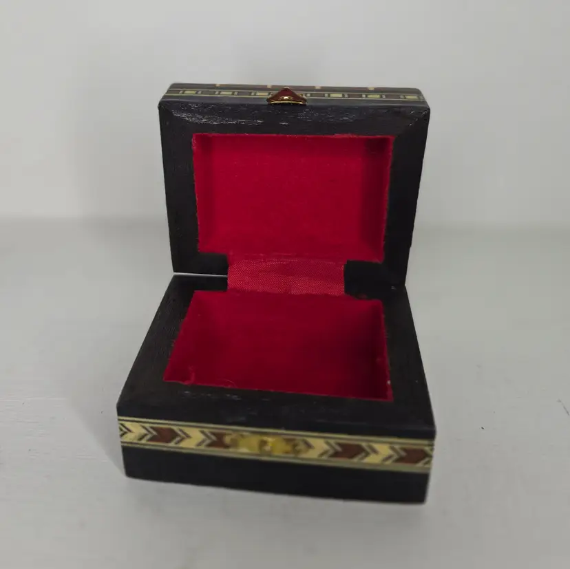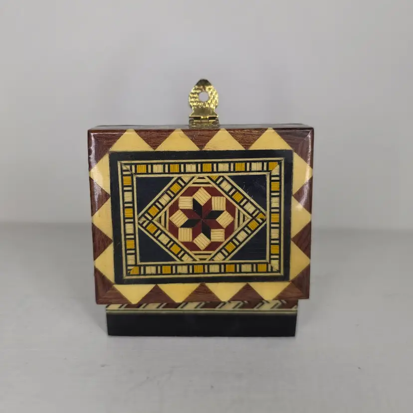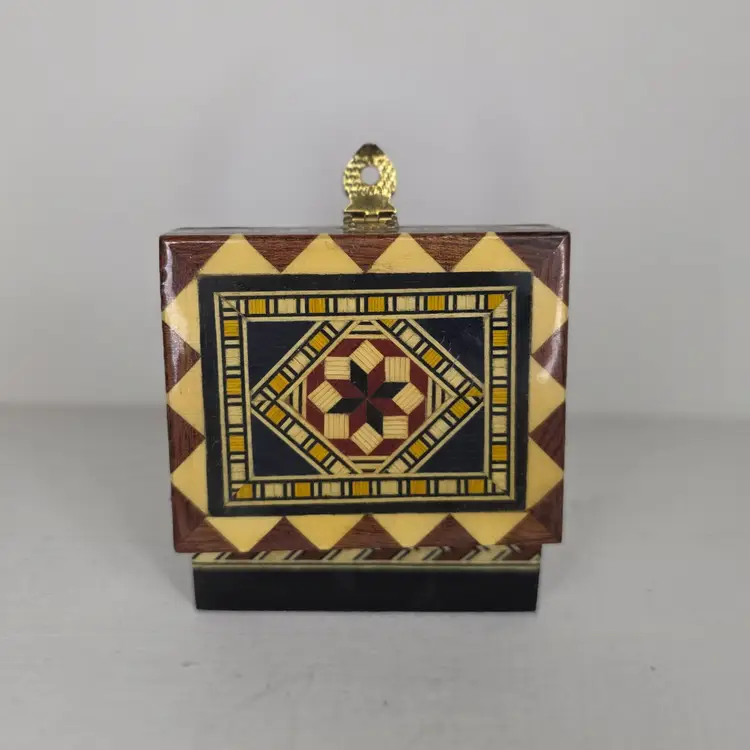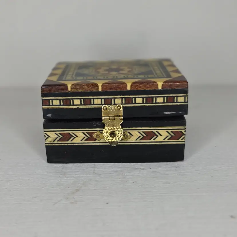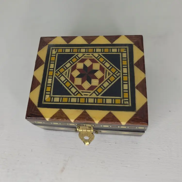 Small vintage handmade box likely made in Spain. The box is beautifully handcrafted marquetry inlay work and features geometric patterns where the center has a starburst motif on the lid with triangular inlays surrounding it. The finish is lacquer to help preserve the inlay. Inside is a red material possibly felt which is very clean. Gold tone hinge and latch which has no rust or discoloration.