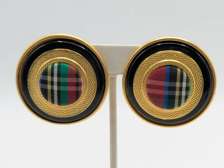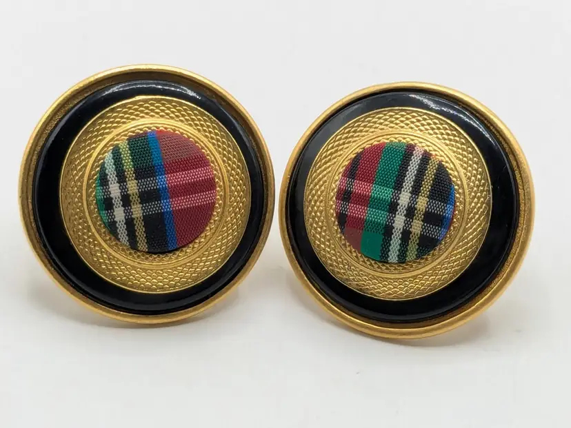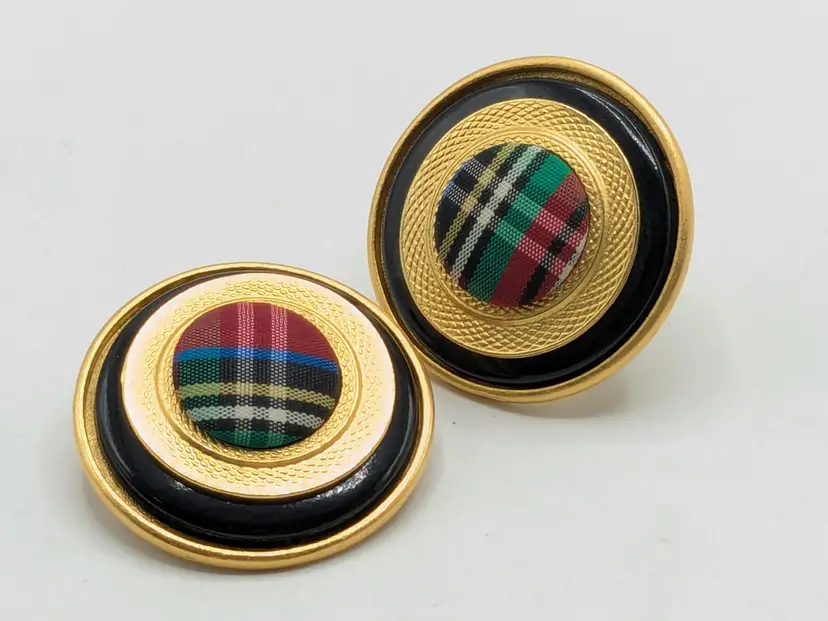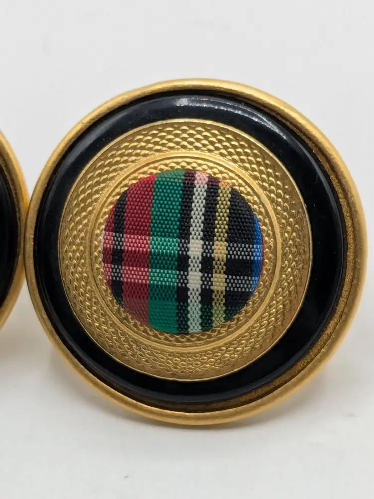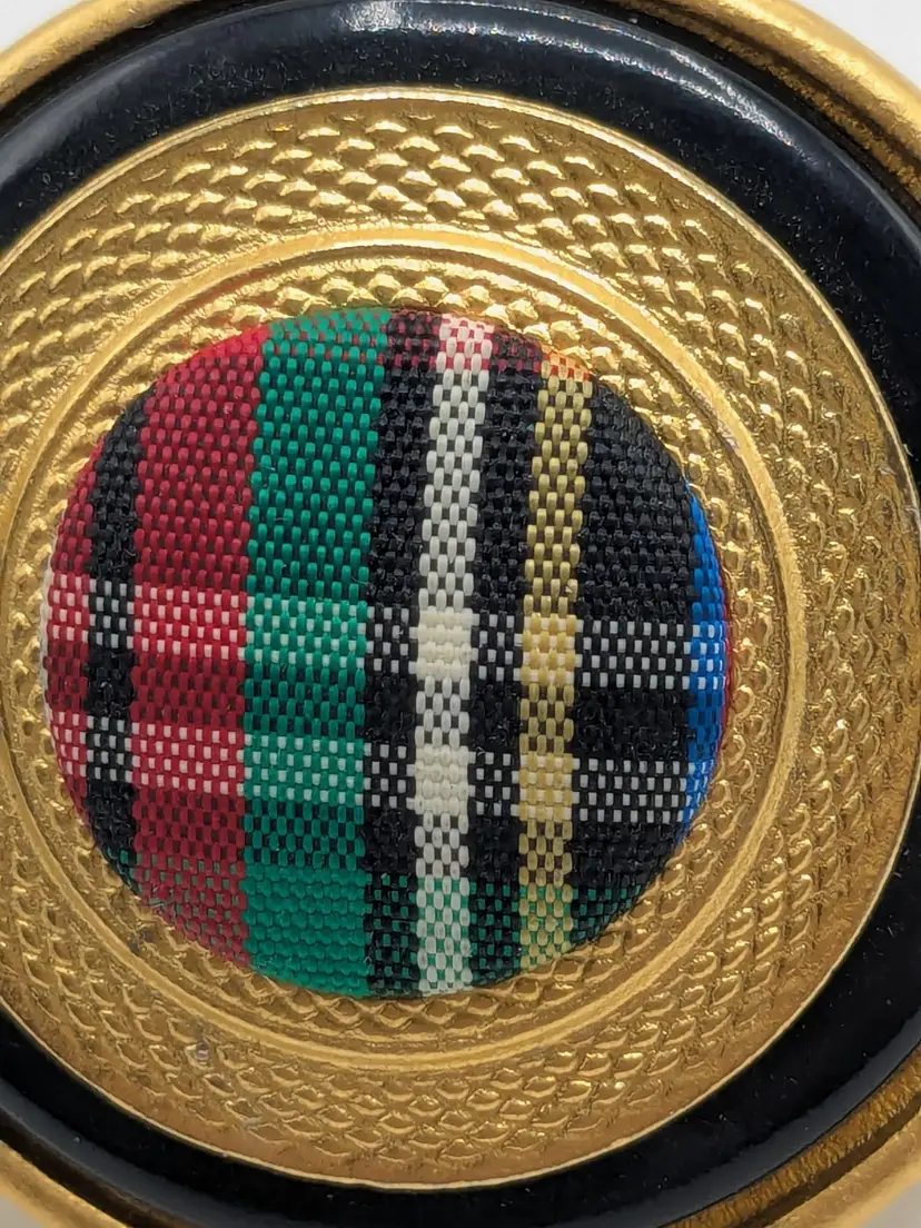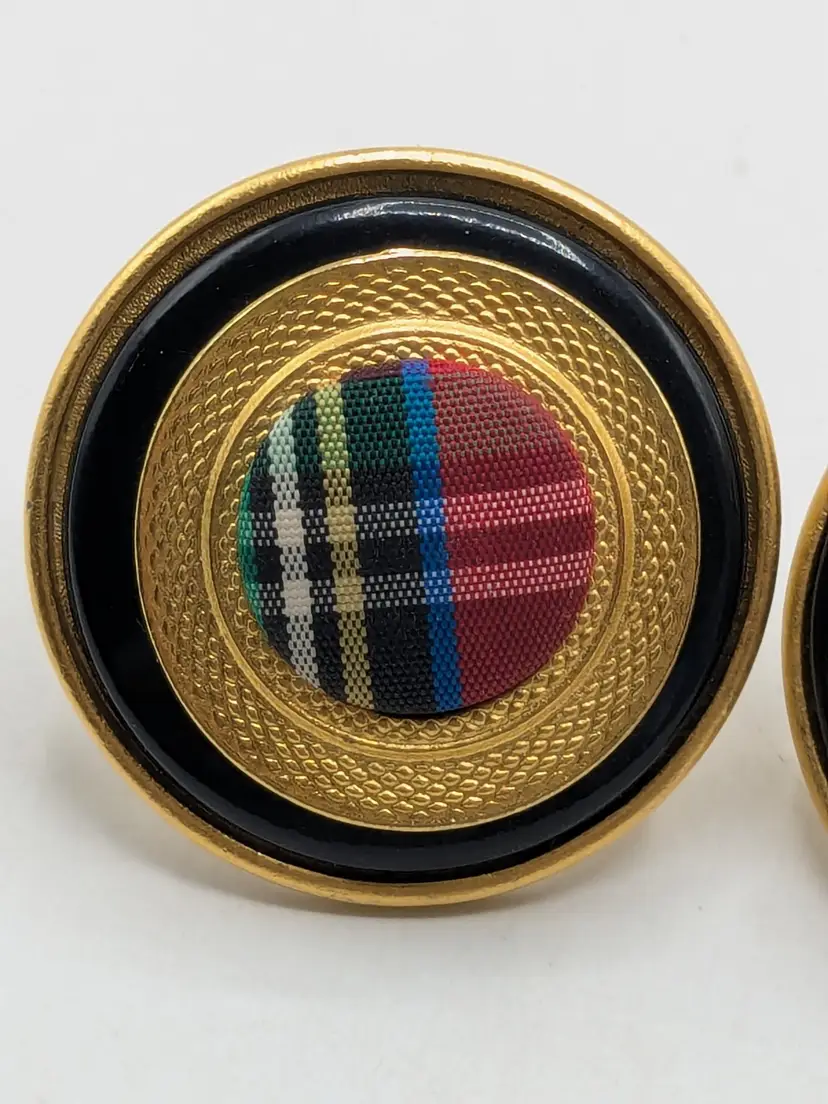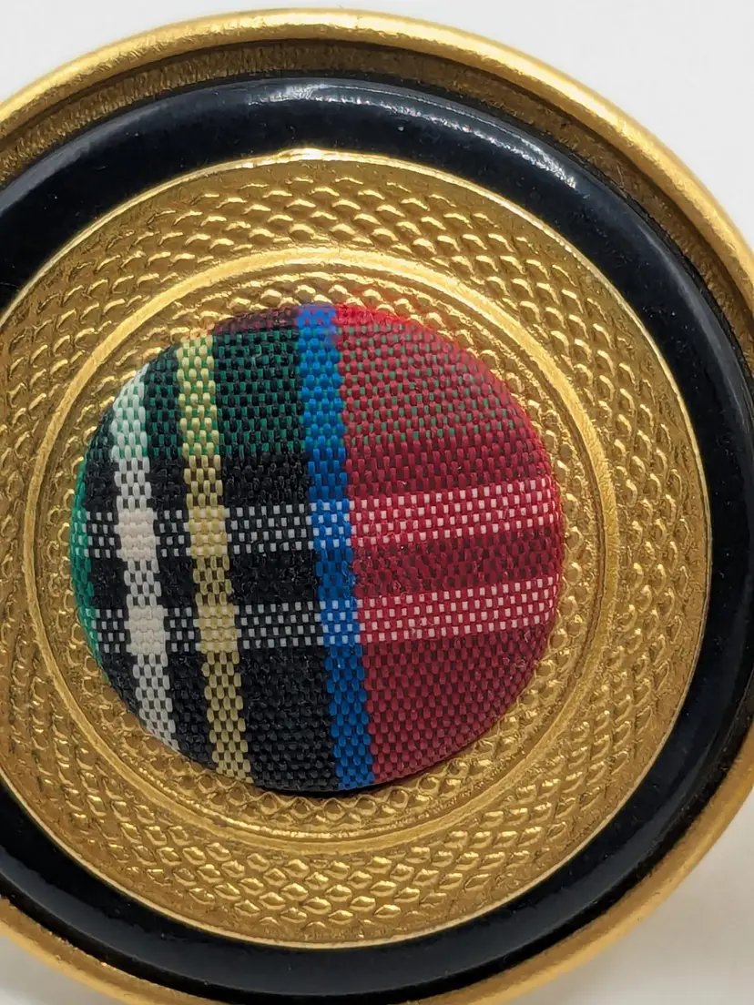 Good condition. Bold tartan plaid designed fabric with gold tone and black enamel. Measures approximately 1 1/2" in diameter. EN2